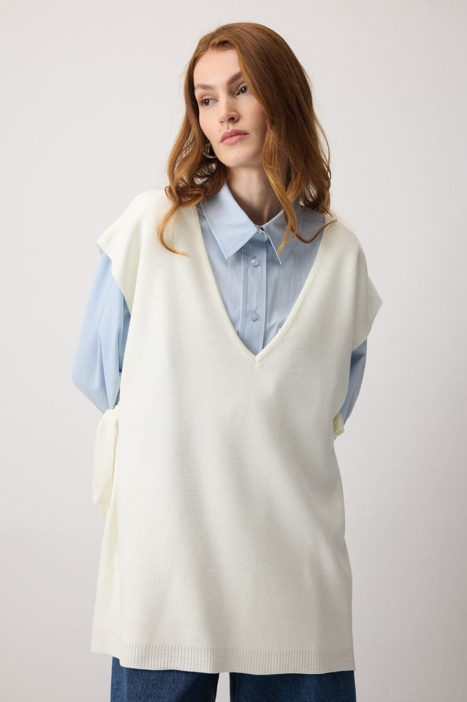 V YAKA YANLARI BAĞCIKLI TRIKO SÜVETER