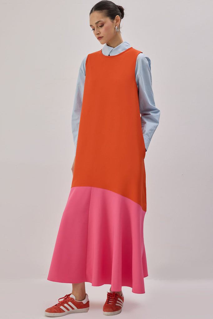 KONTRAST RENKLİ BÜZGÜLÜ ELBİSE
