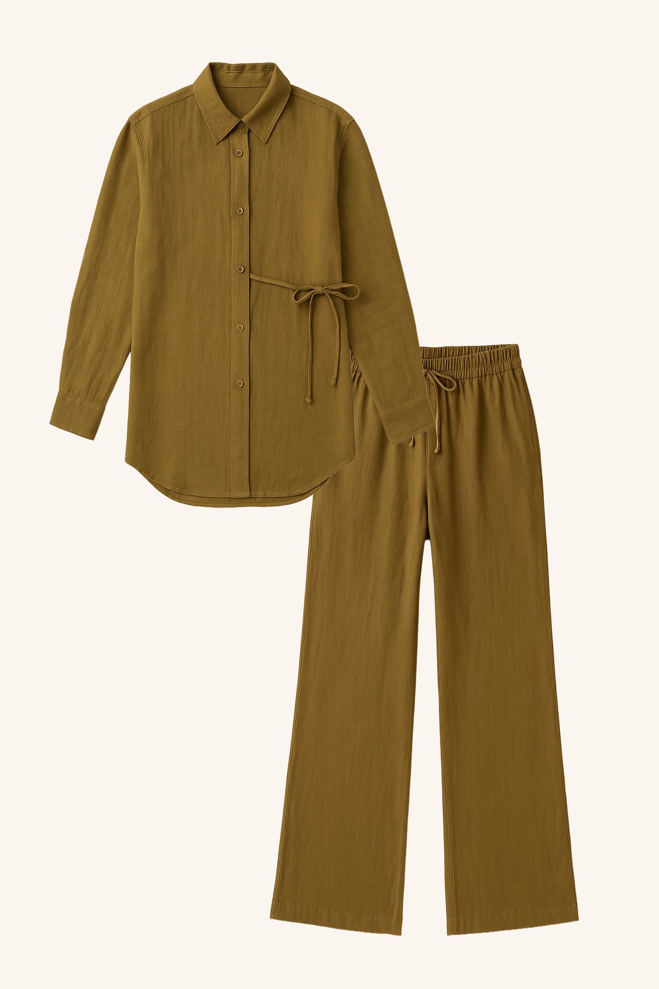 Klasik yaka. Uzun kollu ve manşetleri düğmeli. Önden düğme kapamalı. Yandan bağlama detaylı gömlek. Uzun boy. Elastik bel. İki yan cep. Rahat kesim. Pantolon.