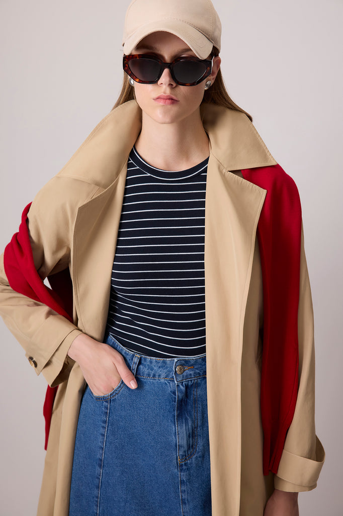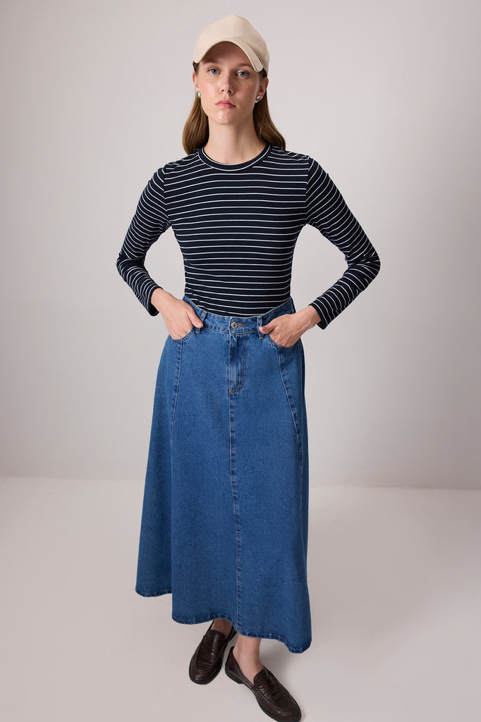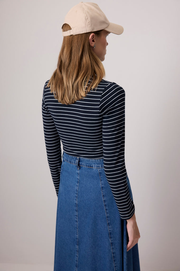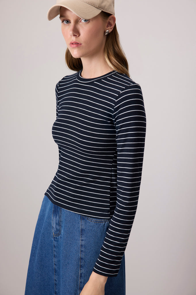 Bisiklet yaka. Uzun kollu. İnce çizgili.