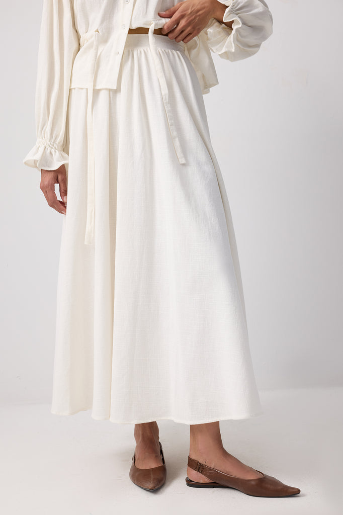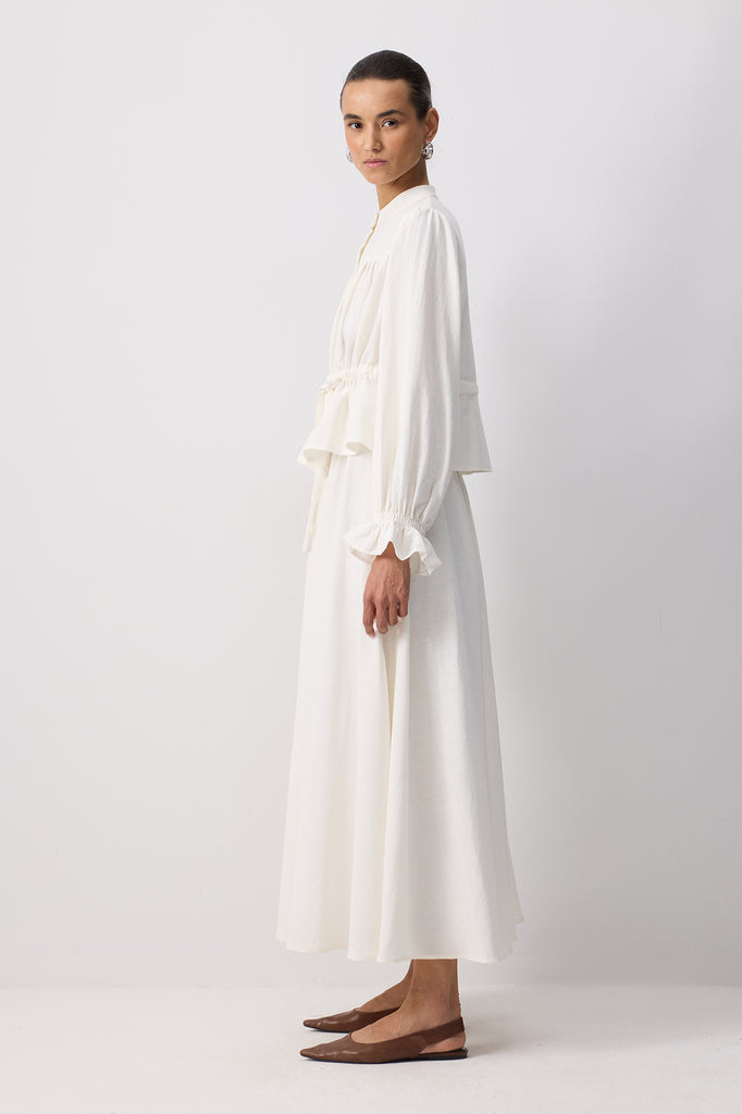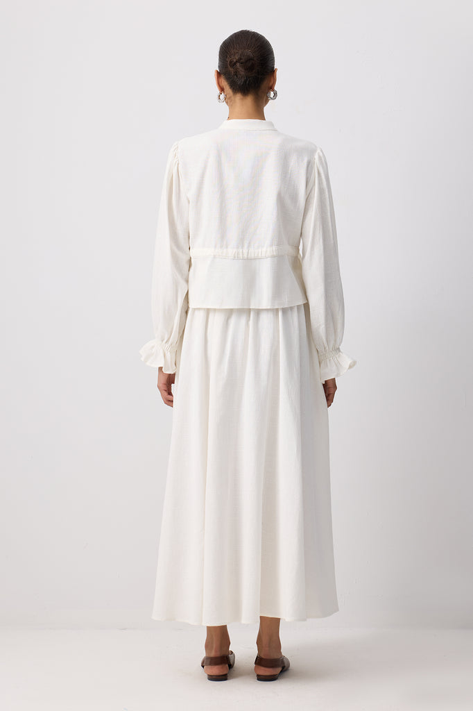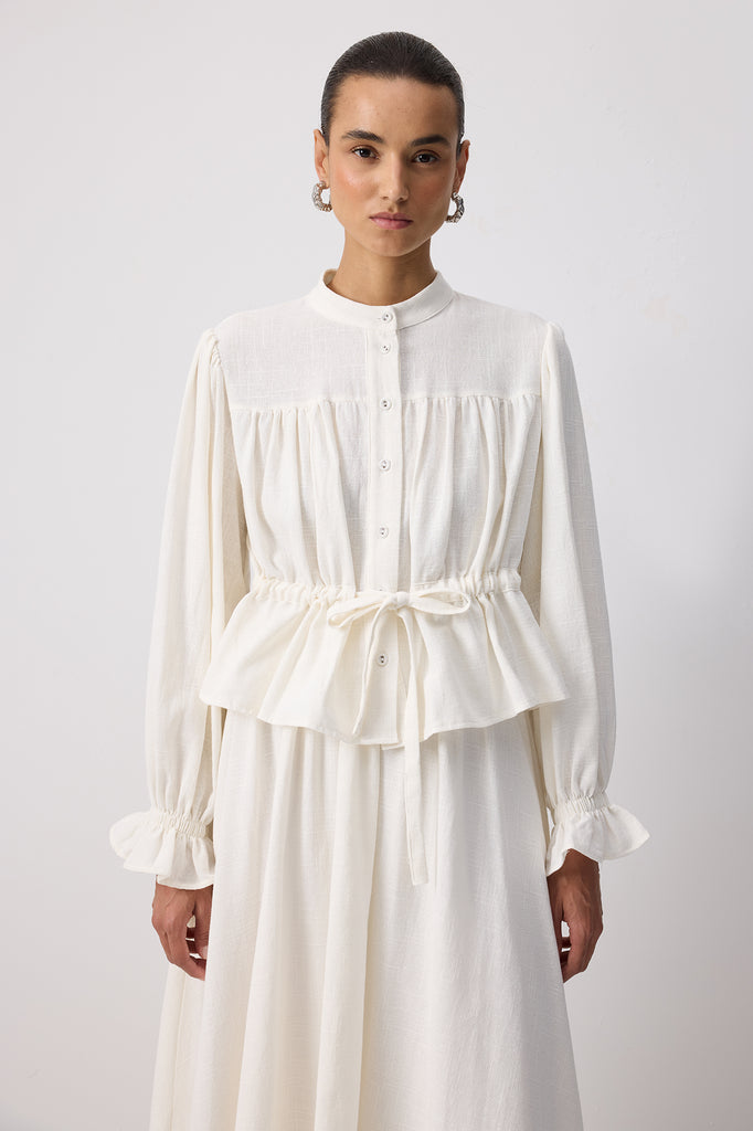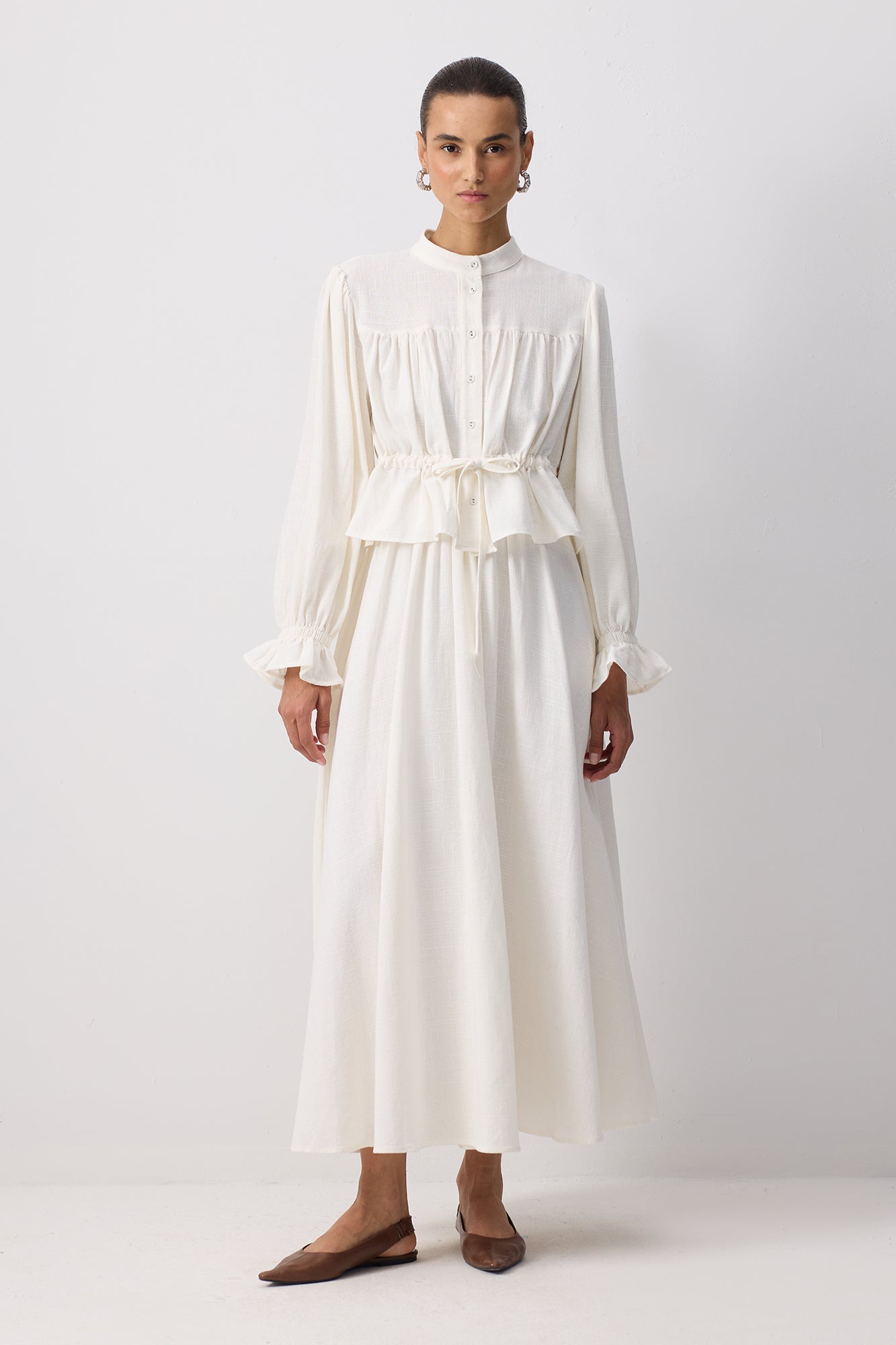 %100 Pamuklu kumaş. Dik yaka. Büzgü detaylı. Belden ayarlanabilir biye bağlamalı. Gizli fermuarlı. Uzun etek.