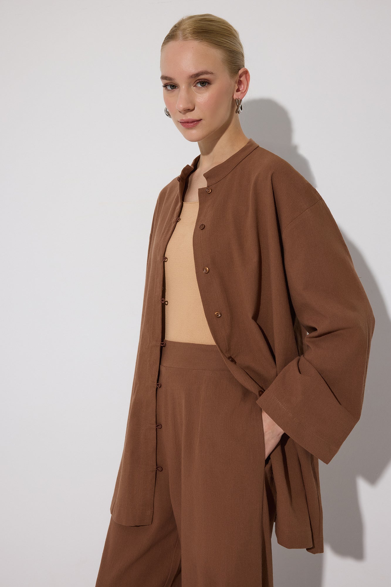 Önü düğme kapamalı. Uzun kollu. Belden bağlama detaylı (ayarlanabilir ip kemer). Yüksek bel pantolon. Yan cepli.