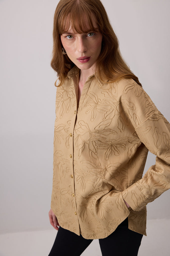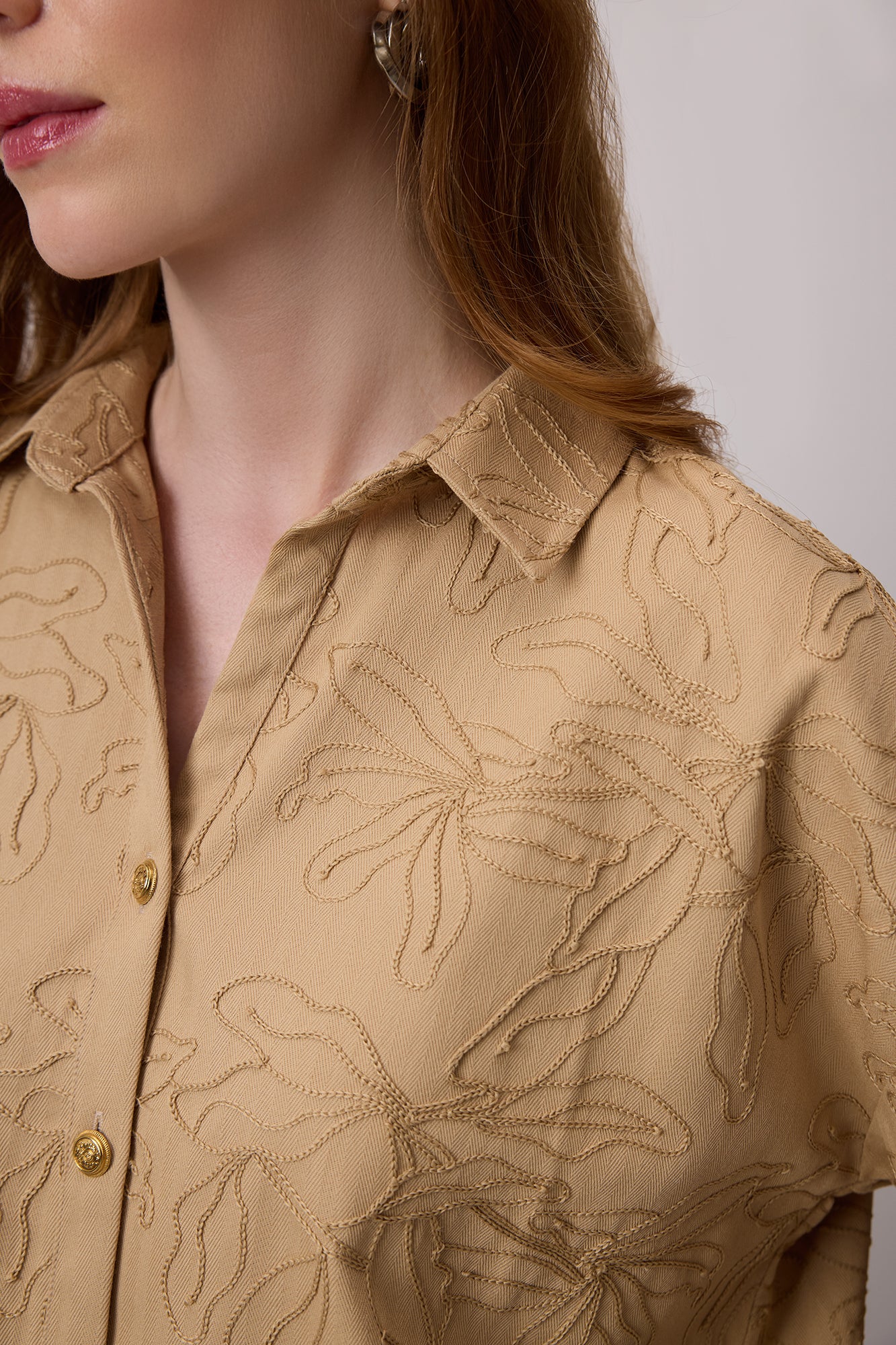 Klasik yaka. Uzun kollu ve manşetleri düğme kapamalı. Nakışlı. Önden düğme kapamalı.