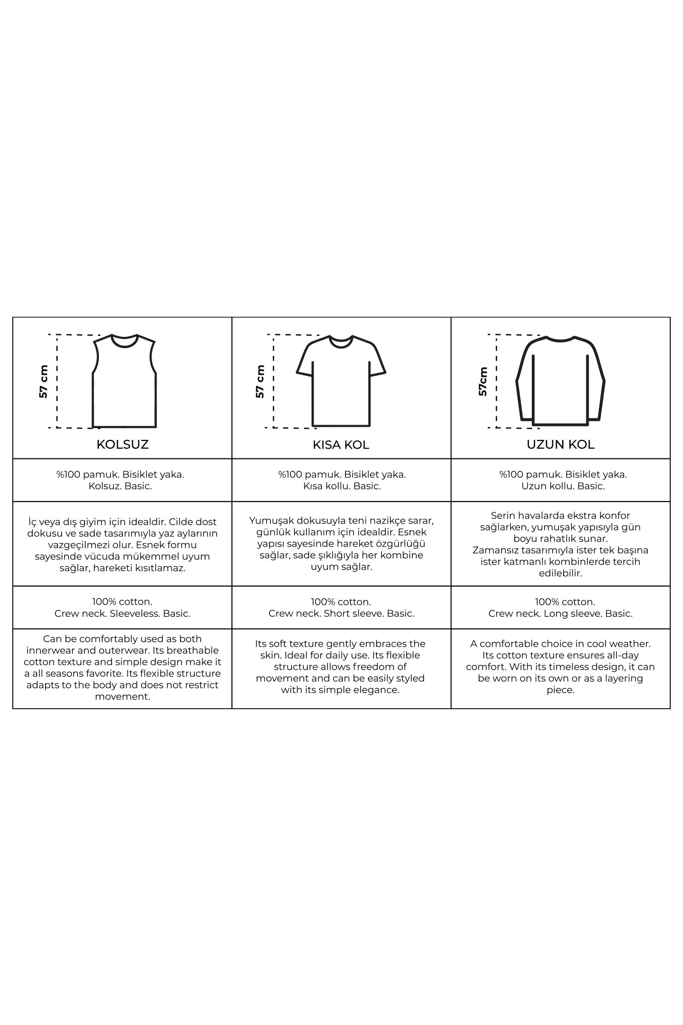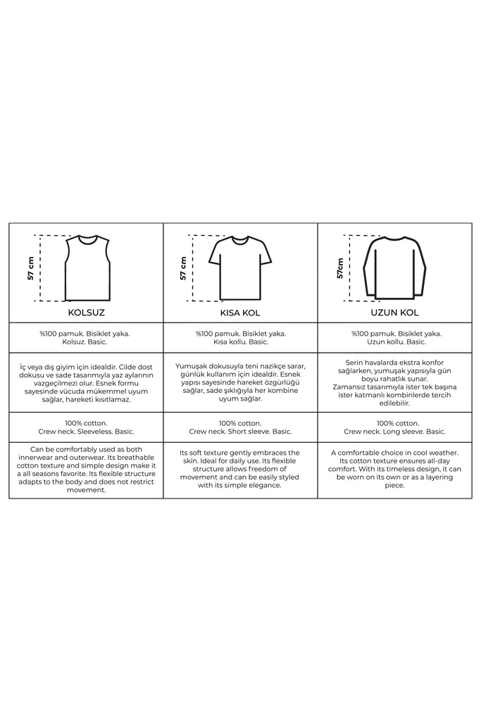 İç ve dış giyimde rahatlıkla kullanılır. Nefes alan pamuklu dokusu ve sade tasarımıyla her sezonun favorisidir. Esnek yapısıyla vücuda uyum sağlar, hareketi kısıtlamaz.