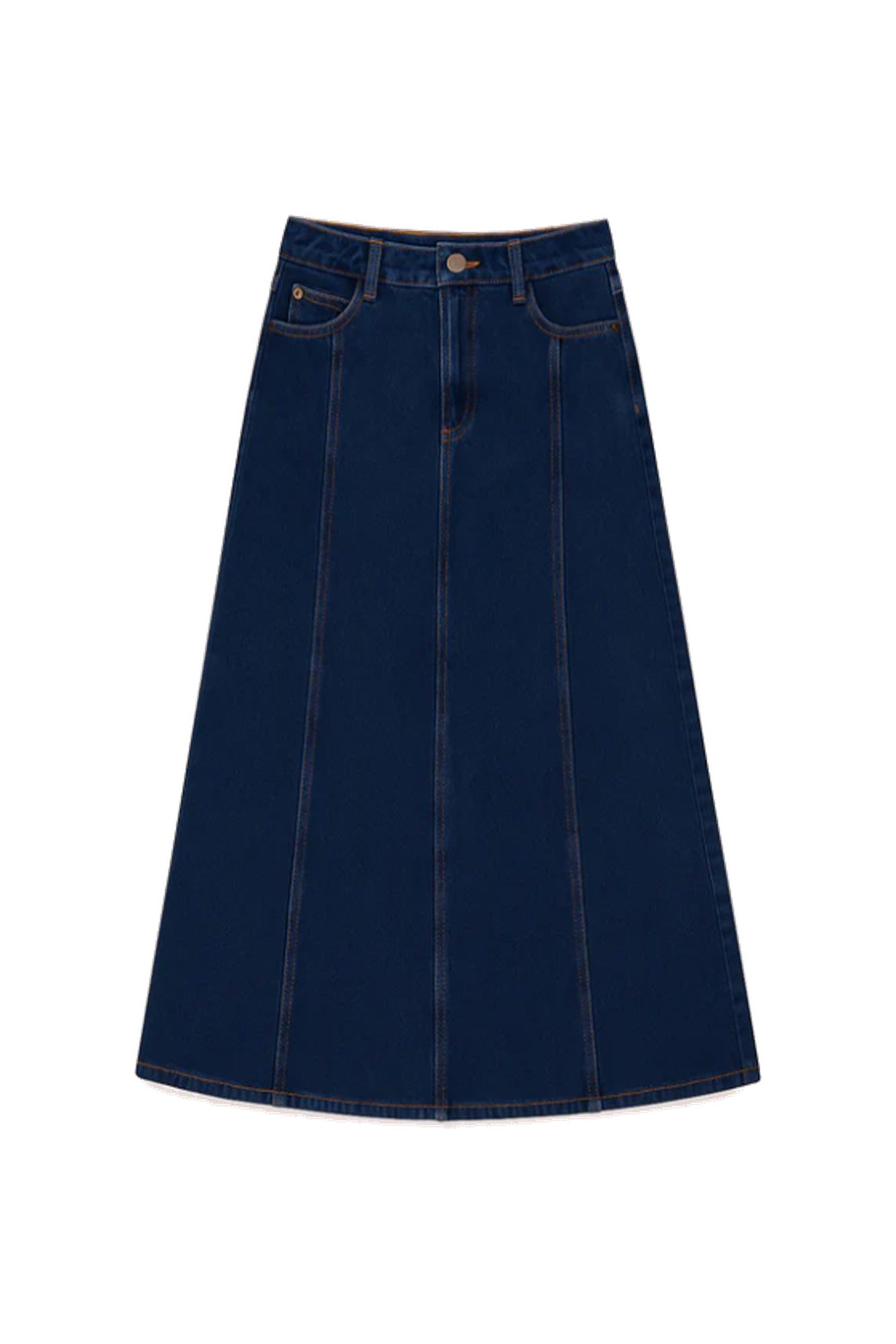 Yüksek bel. Dikiş detaylı. A kesim. Denim etek.