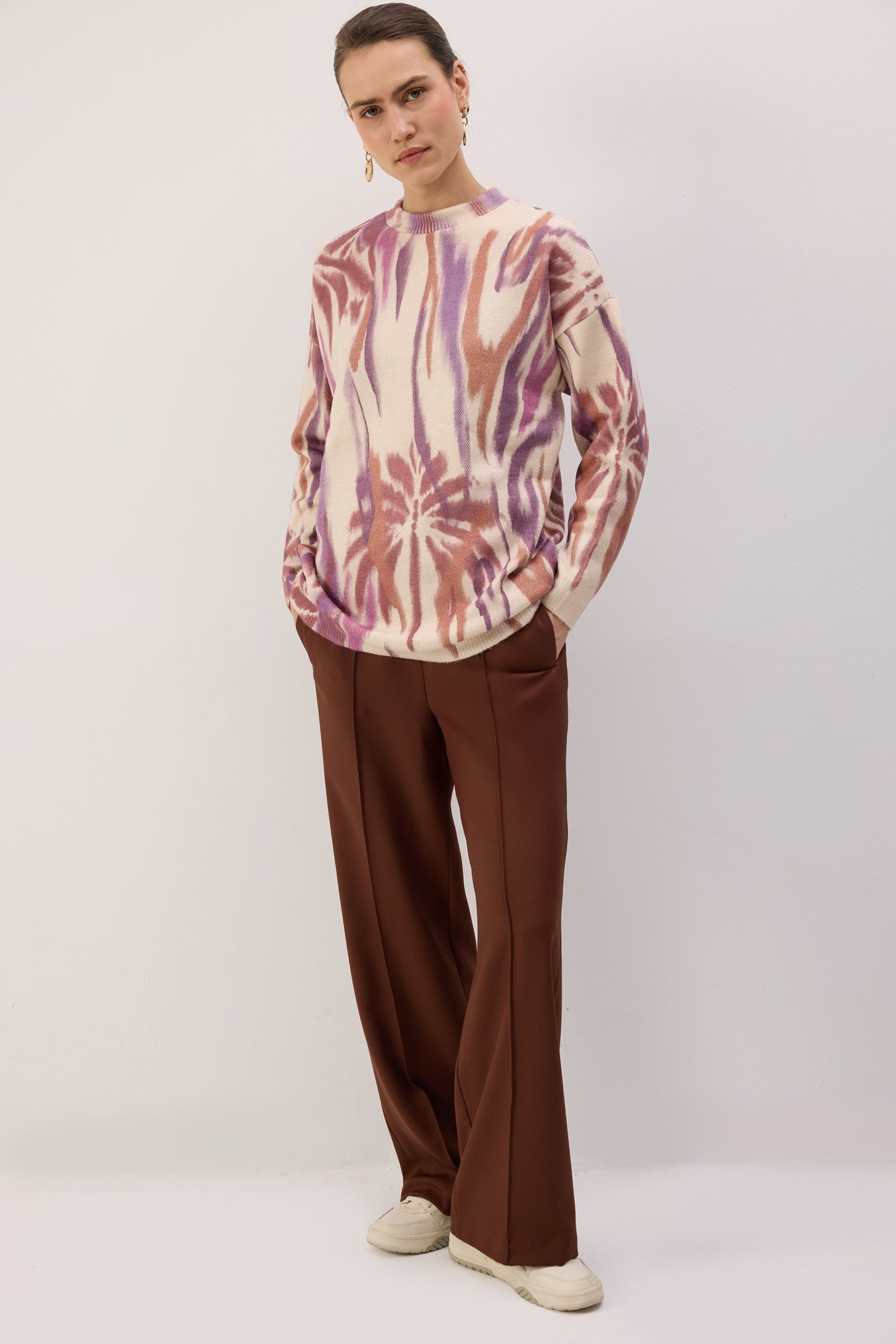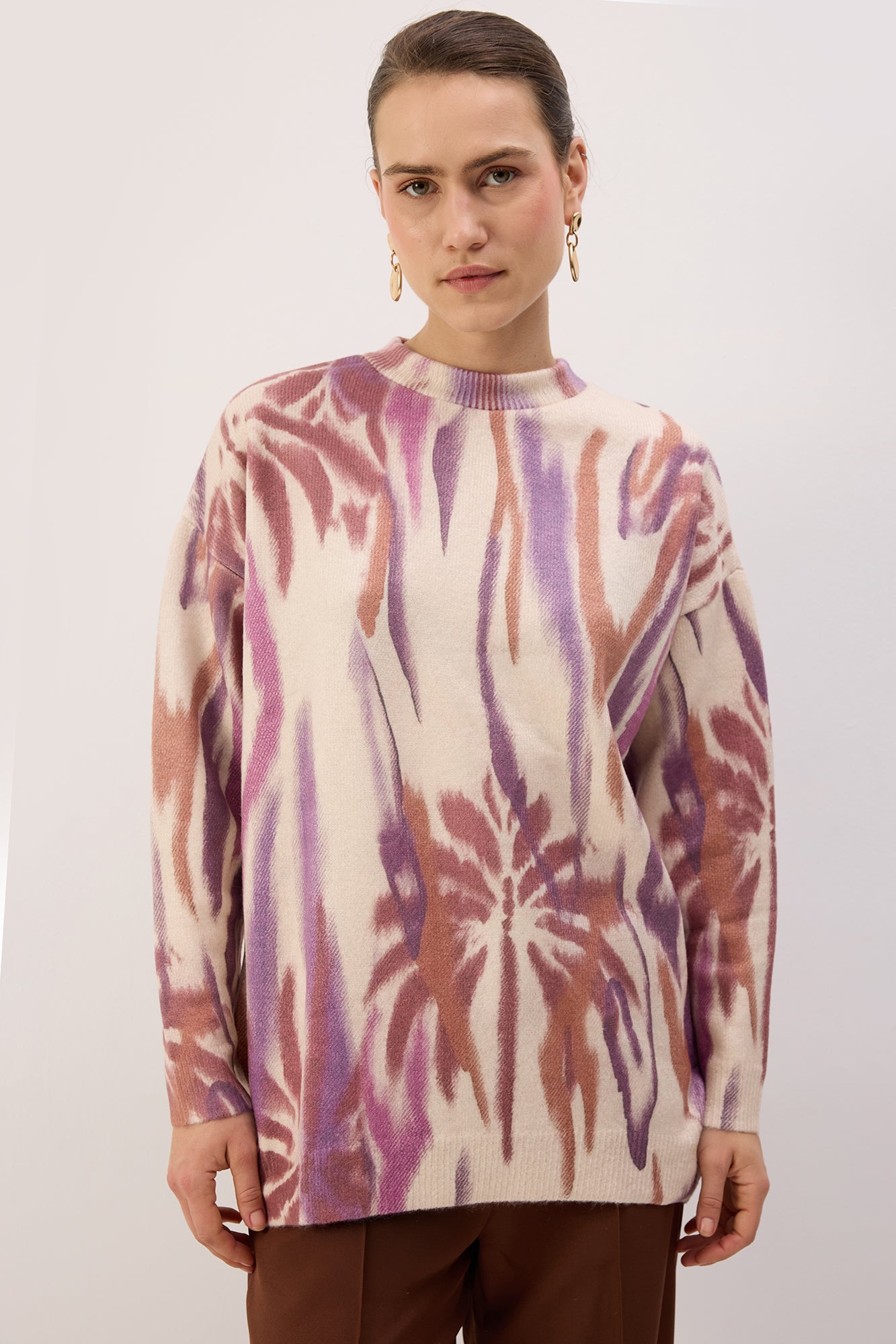 Desenli, yuvarlak yaka triko kazak.