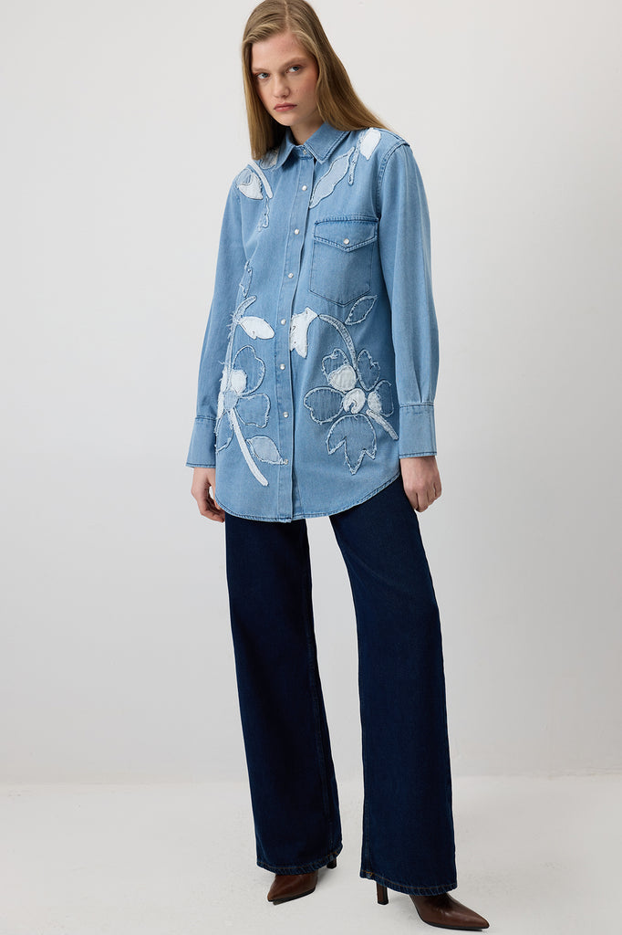 APLİKE NAKIŞLI DENIM GÖMLEK