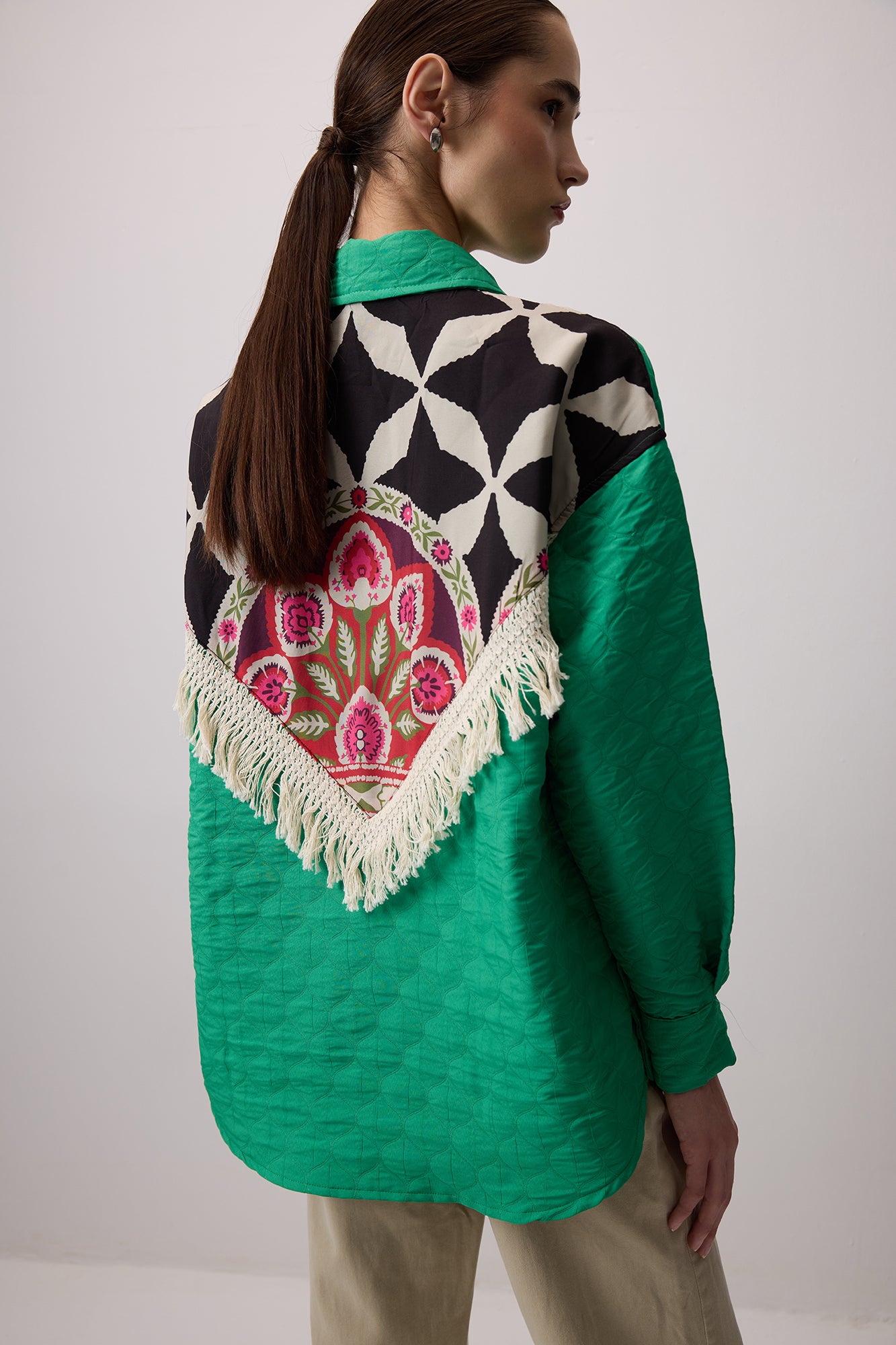 Klasik yaka. Uzun kollu. Manşetleri düğmeli. Kapitone. Arkası baskılı. Püskül detaylı. Göğüs hizasından yama cepli. Önden düğme kapamalı.