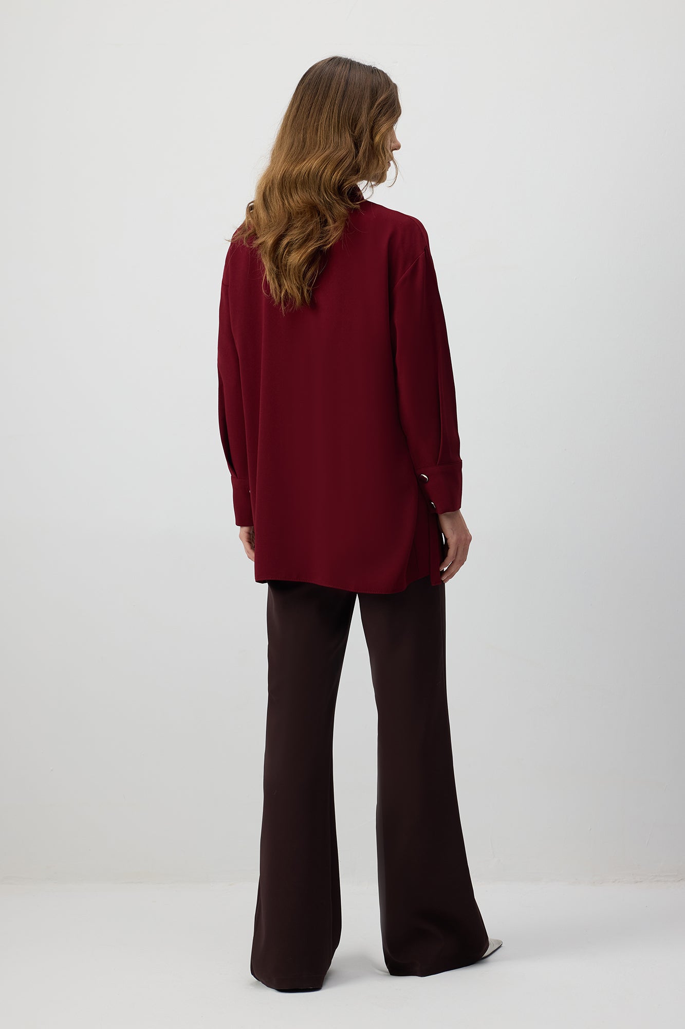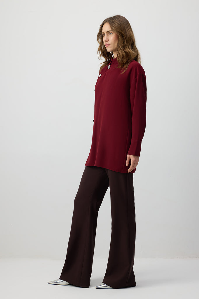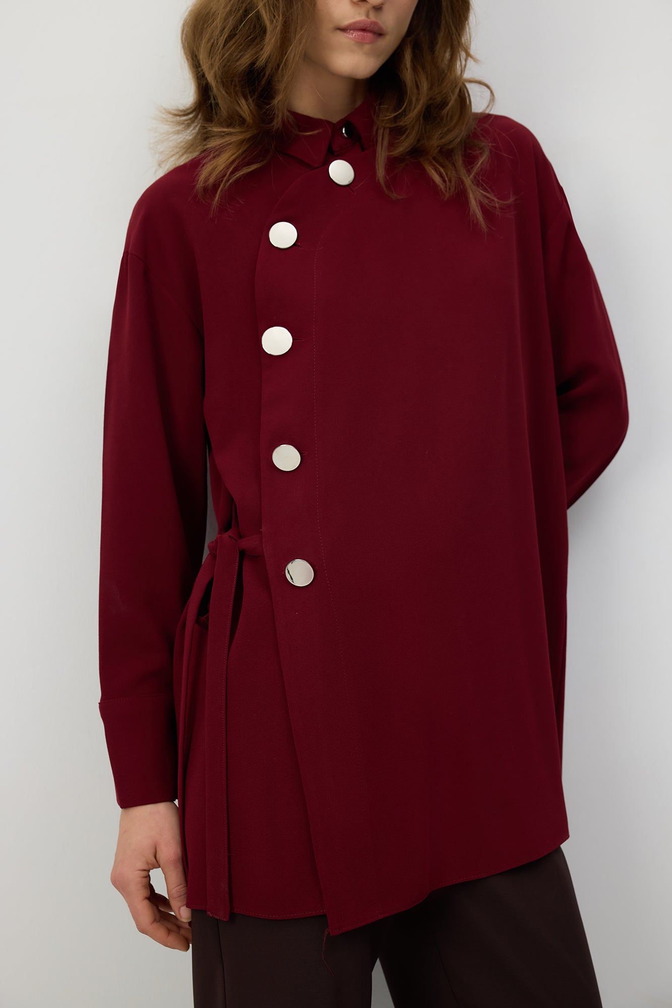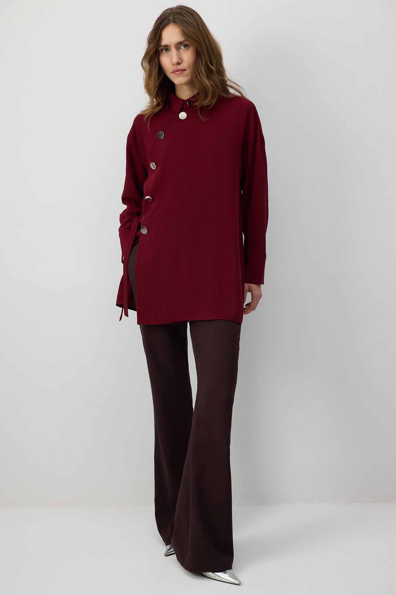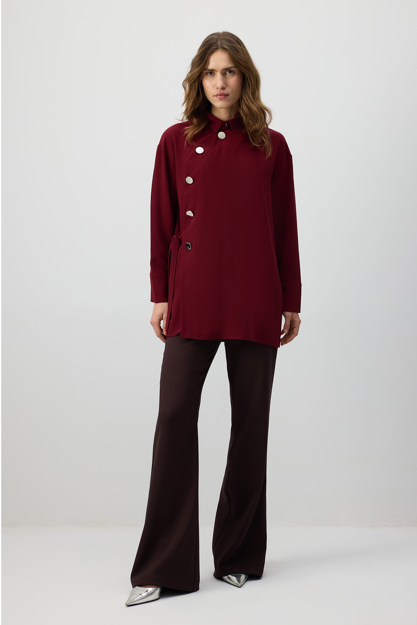 Klasik yaka. Uzun kollu ve düşük omuzlu. Manşetleri düğmeli. Asimetrik, Önden düğme kapamalı ve bağlama detaylı.