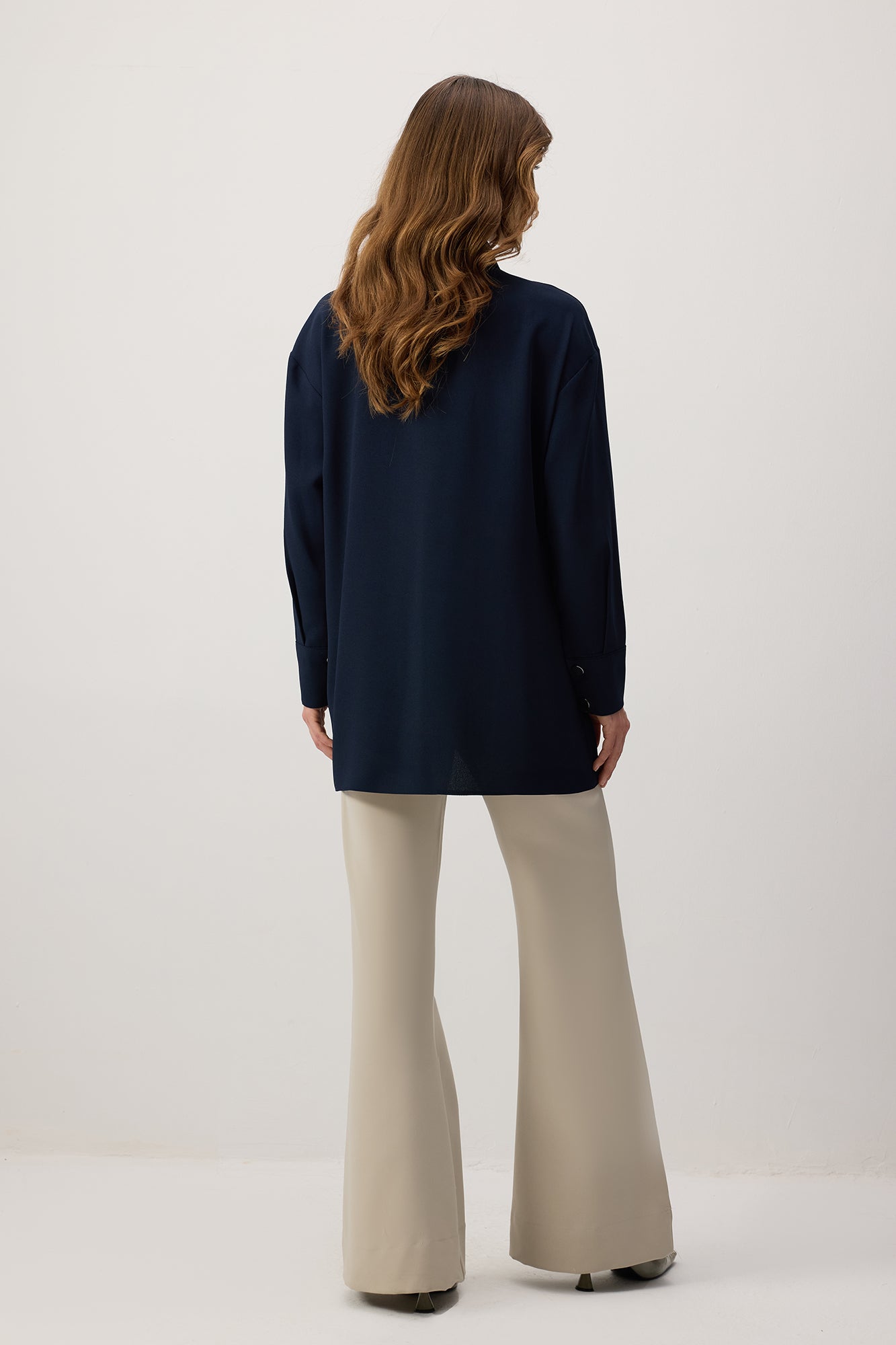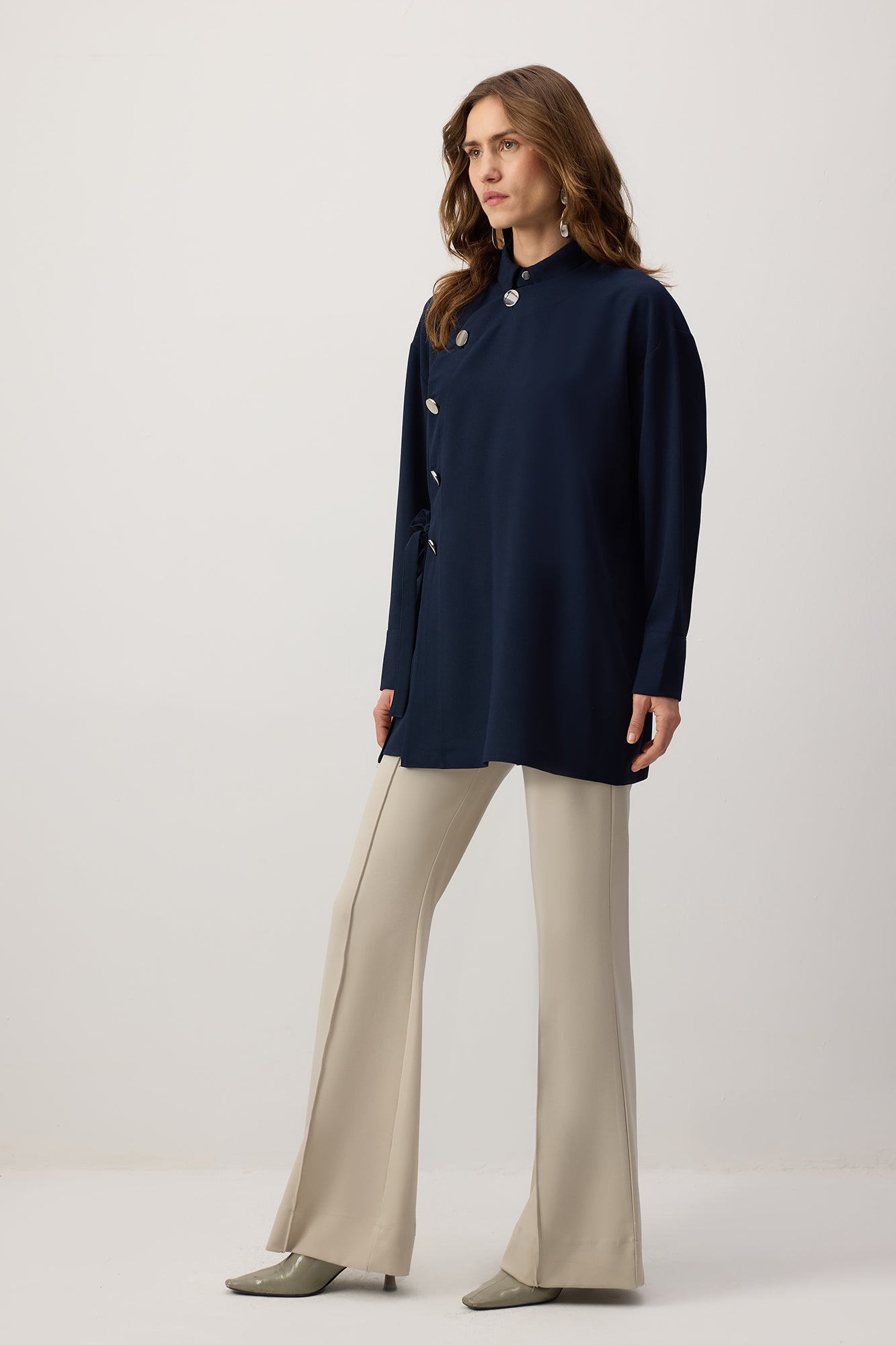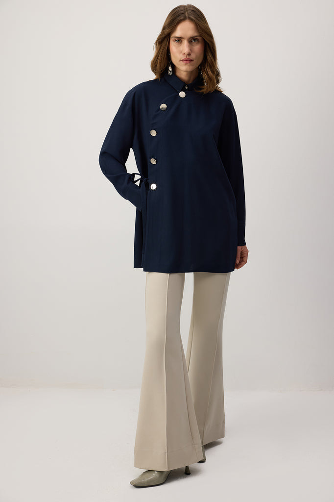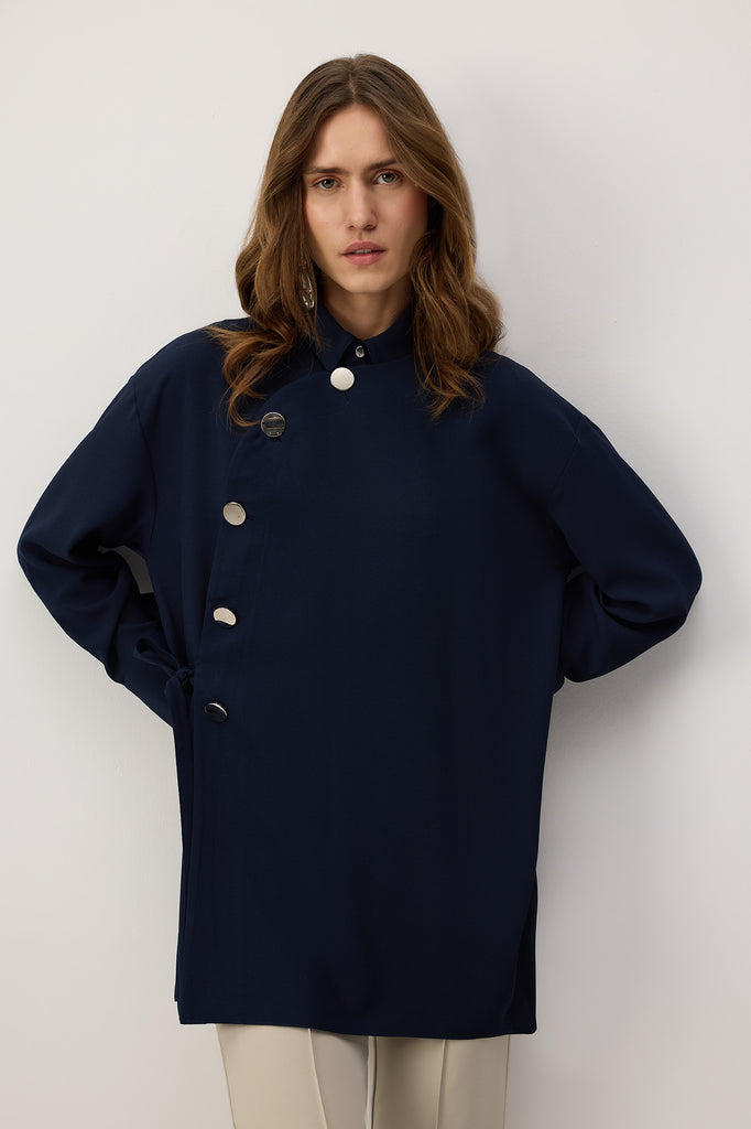 Klasik yaka. Uzun kollu ve düşük omuzlu. Manşetleri düğmeli. Asimetrik, Önden düğme kapamalı ve bağlama detaylı.