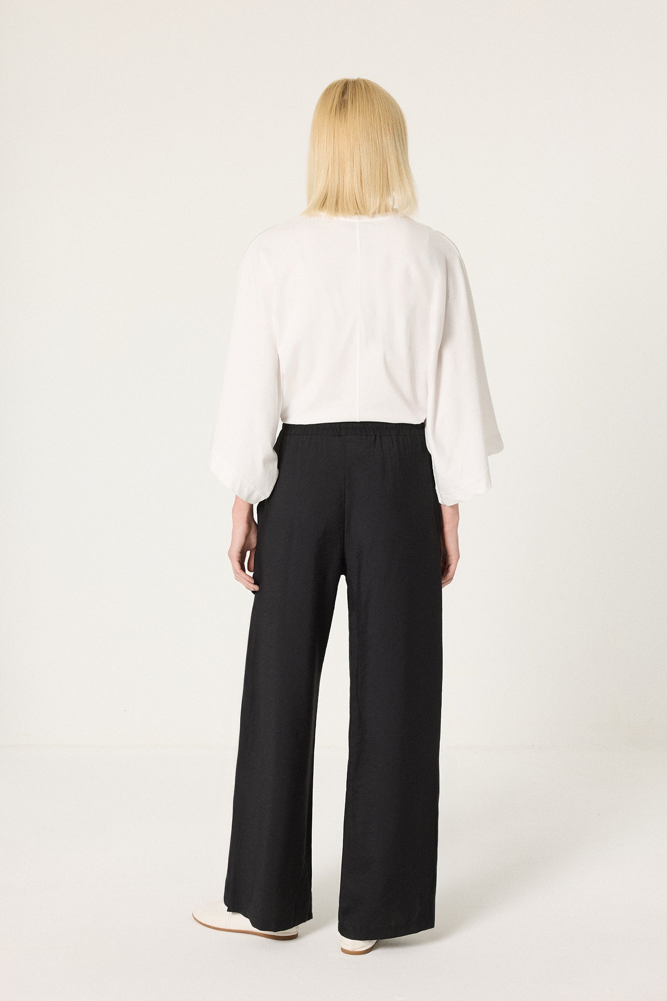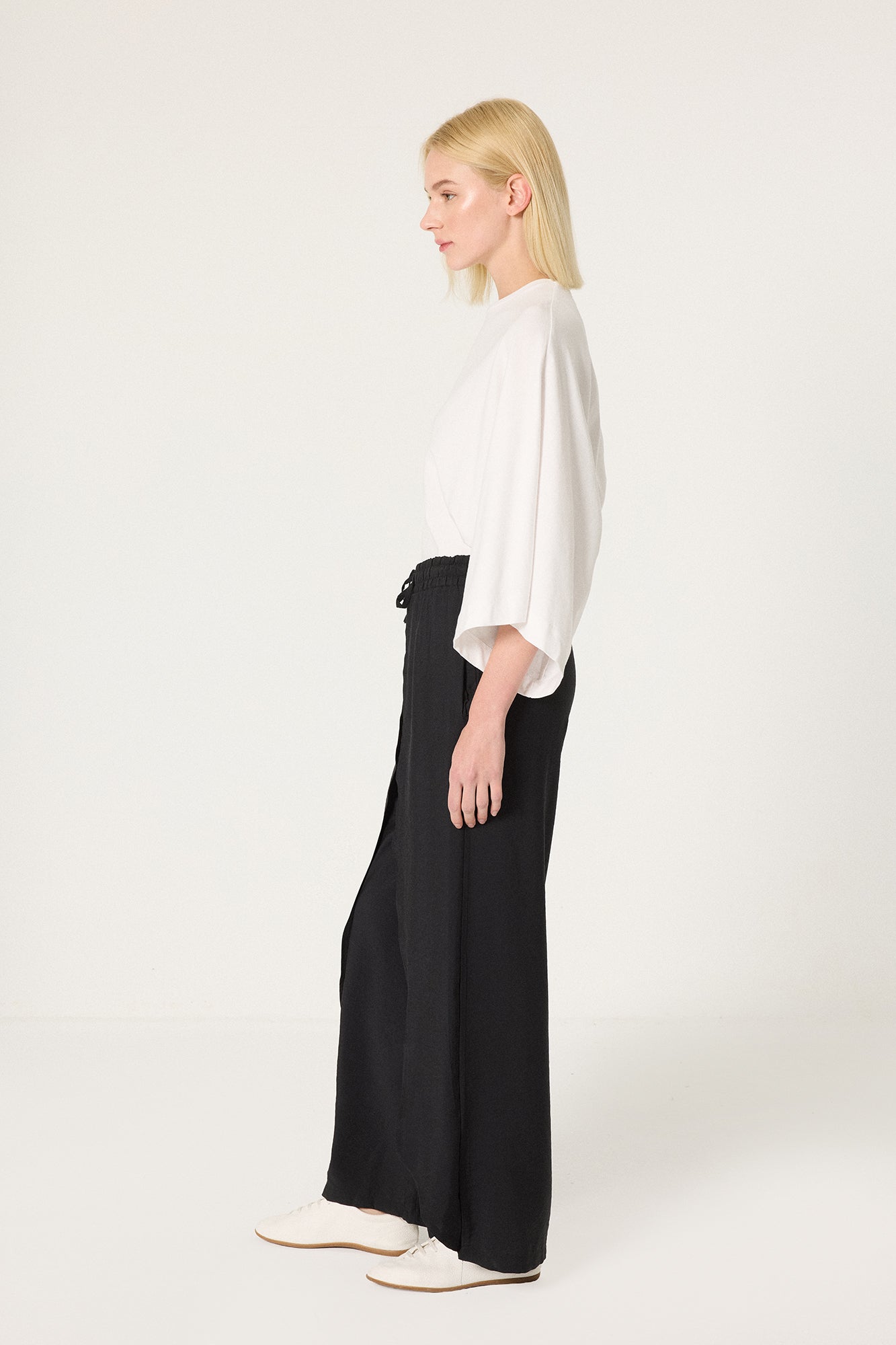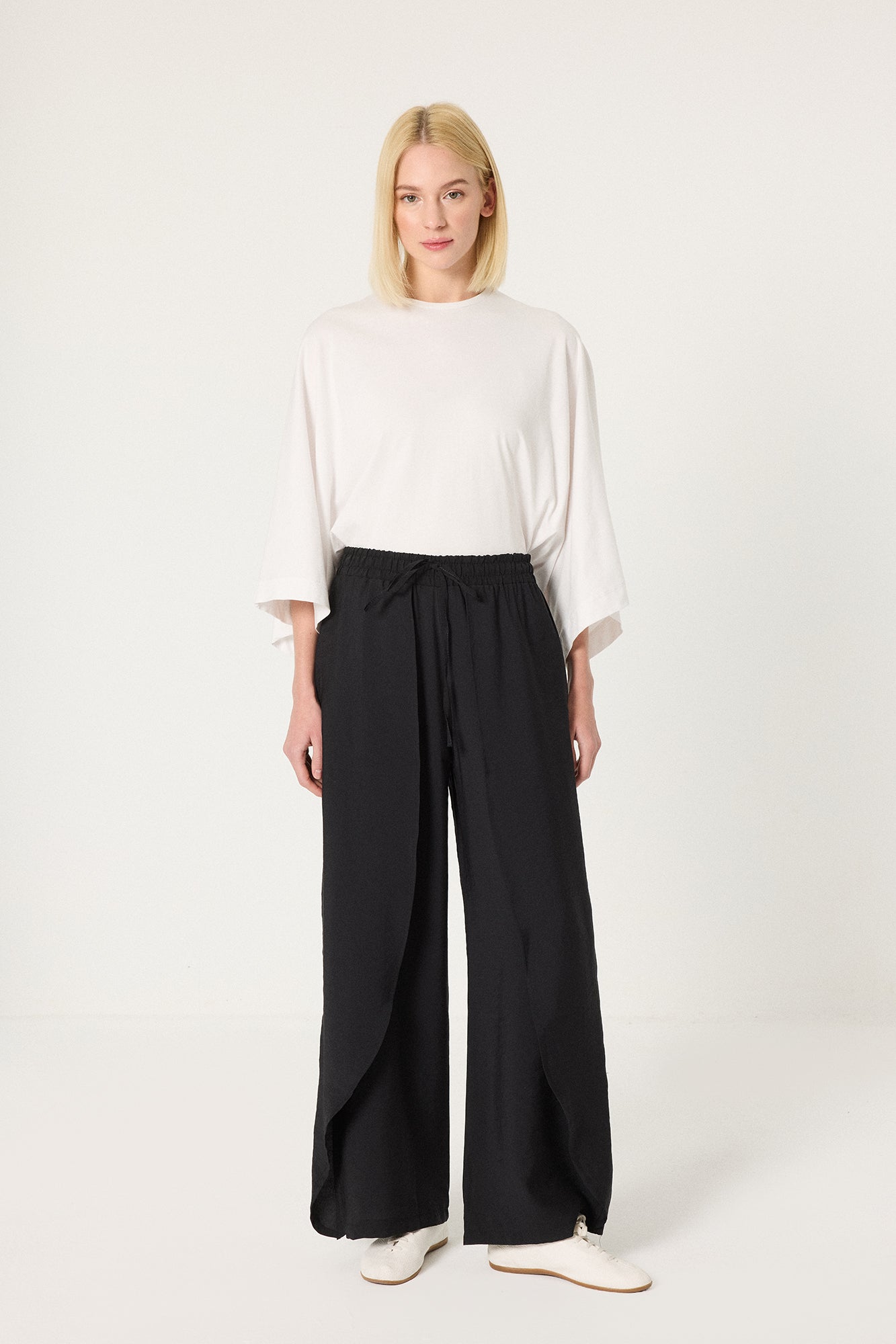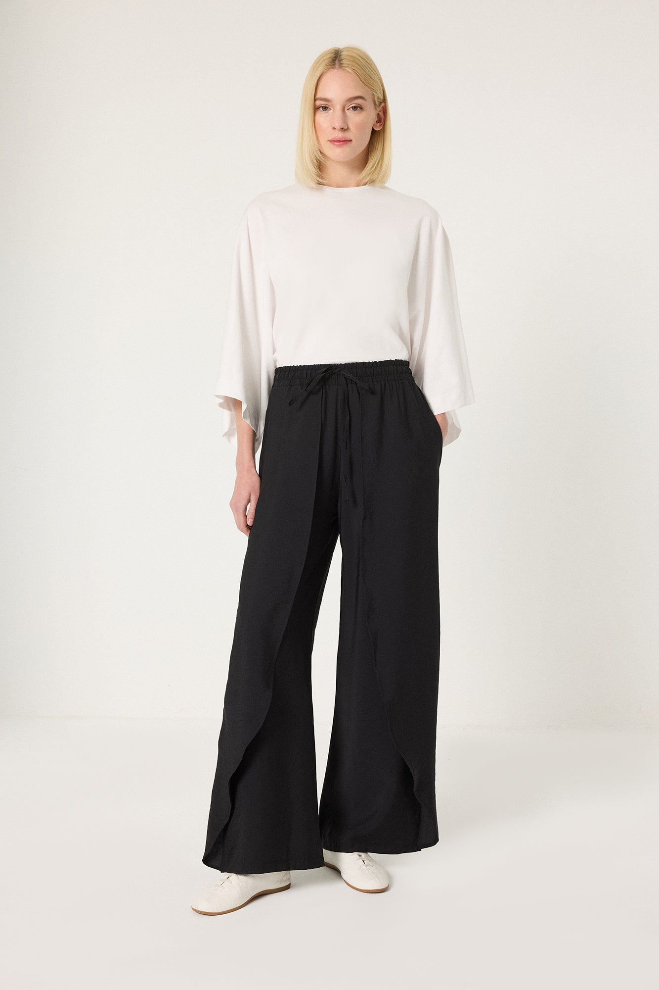 Hafif, akıcı ve dökümlü kumaş. Elastik bel ve bağcık detaylı. Yan cepli.