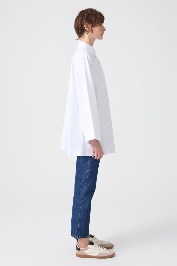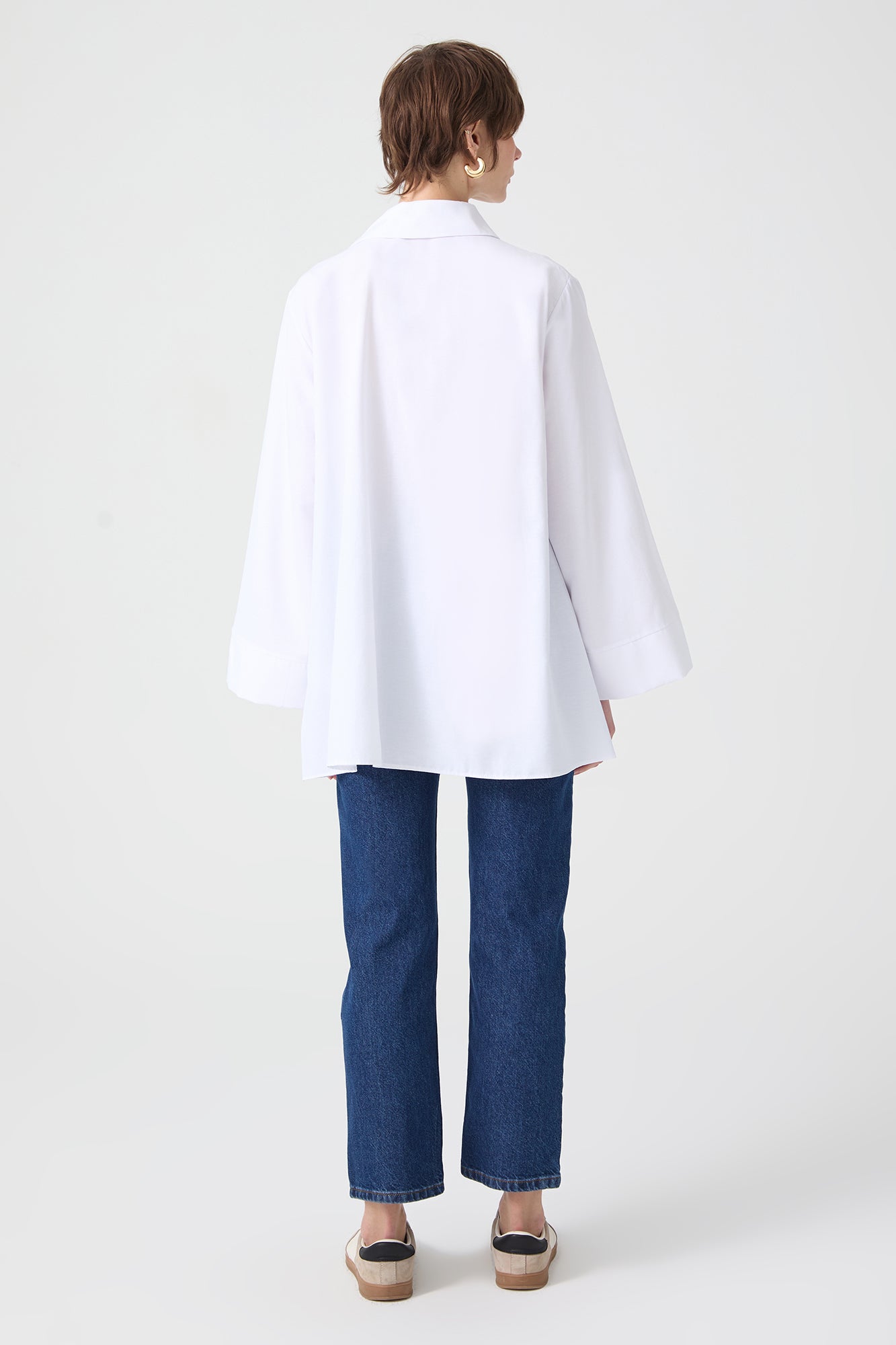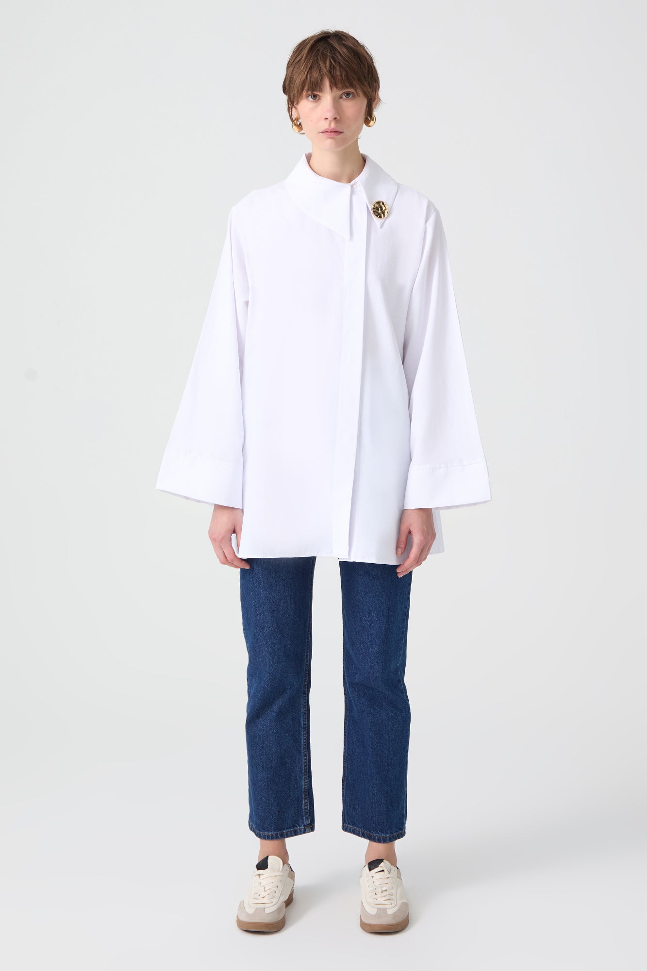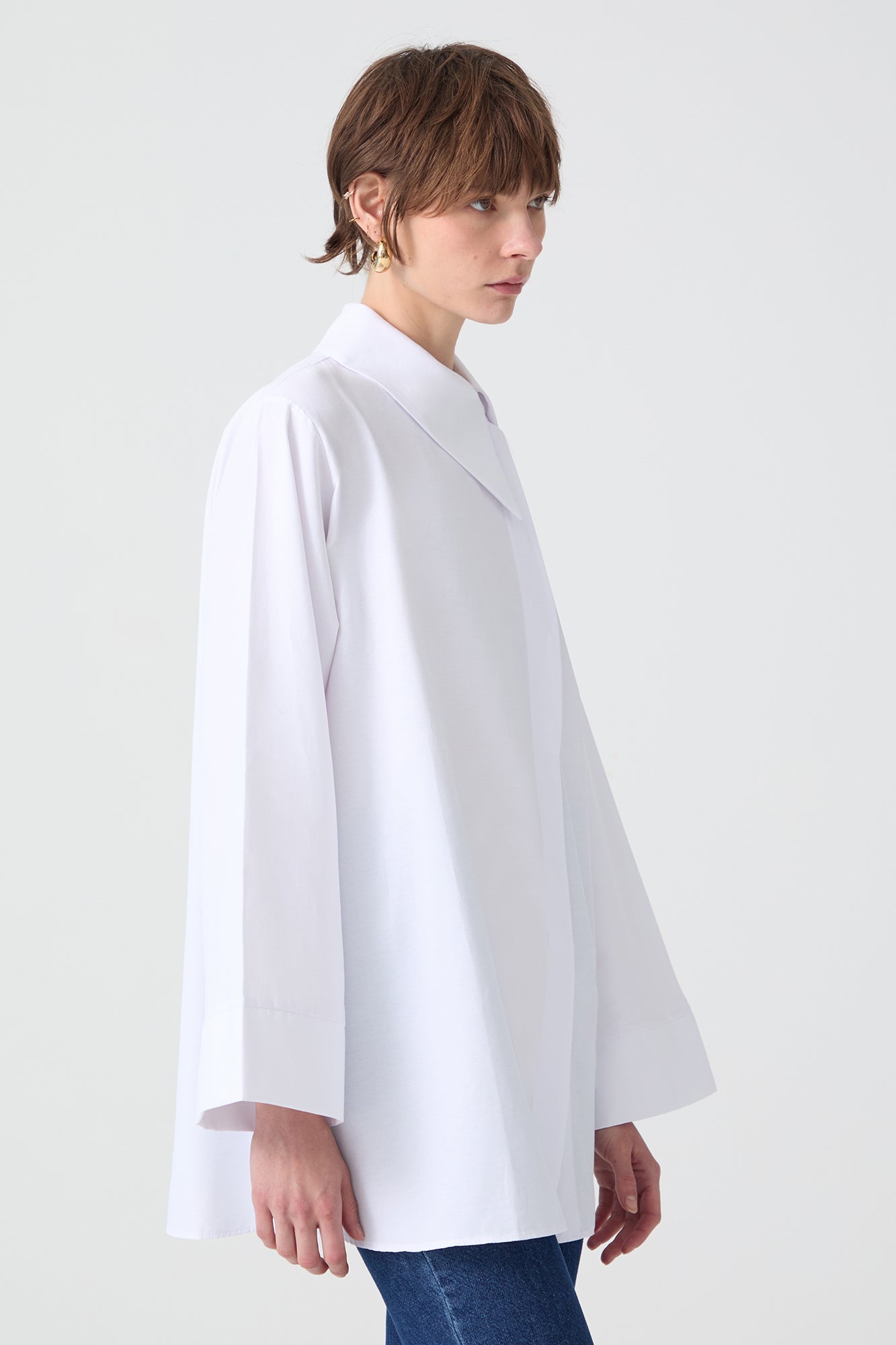 Asimetrik klasik yaka. Uzun kollu. Asimetrik önden düğme kapamalı.