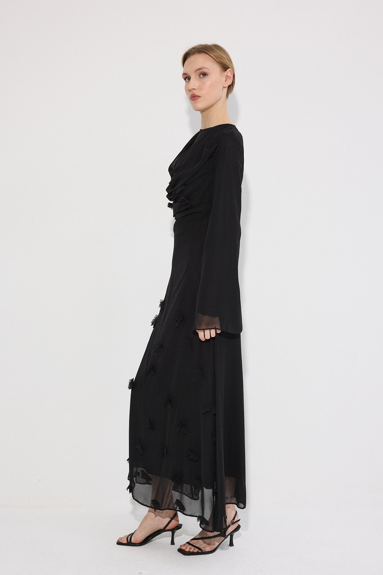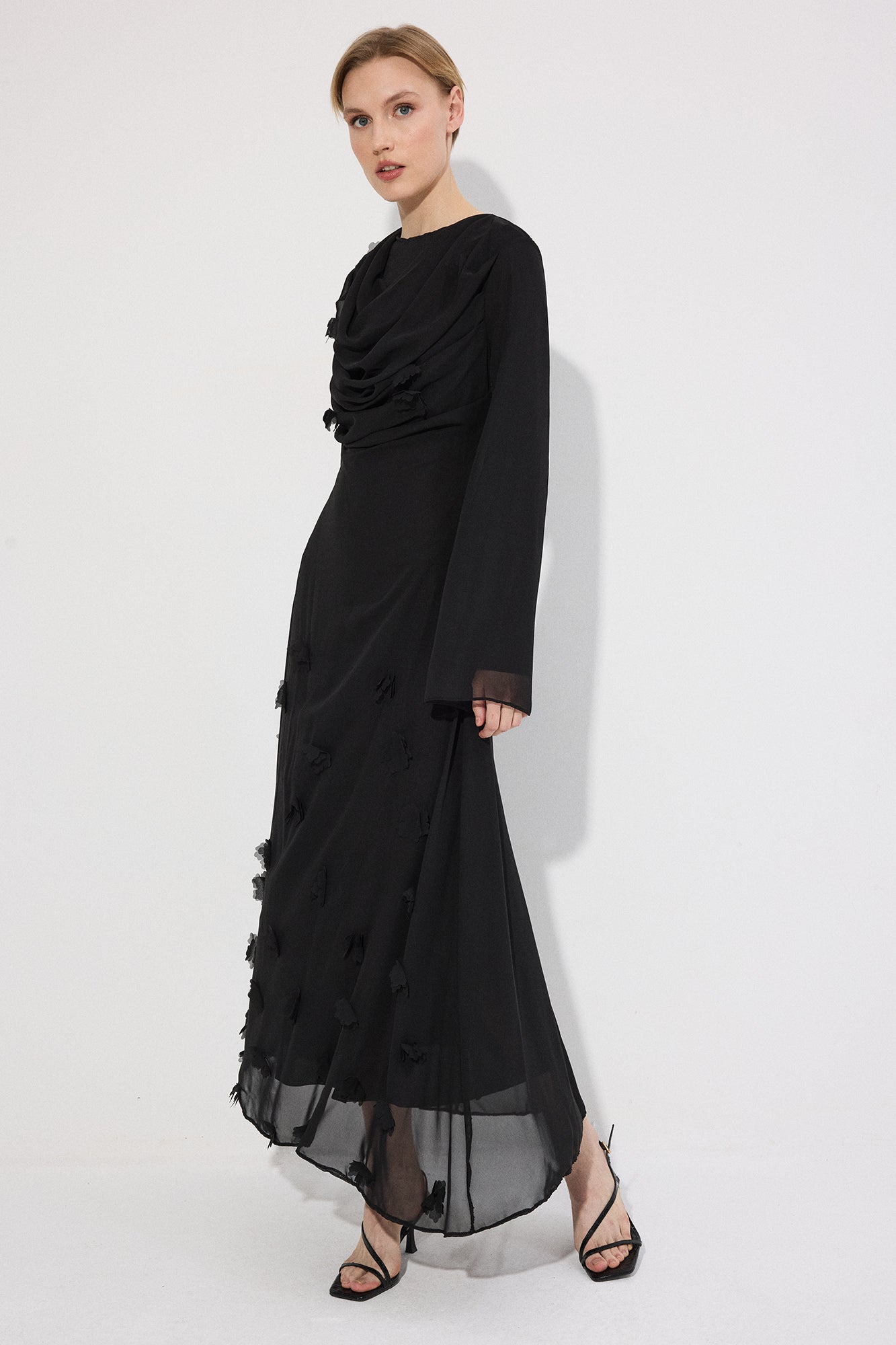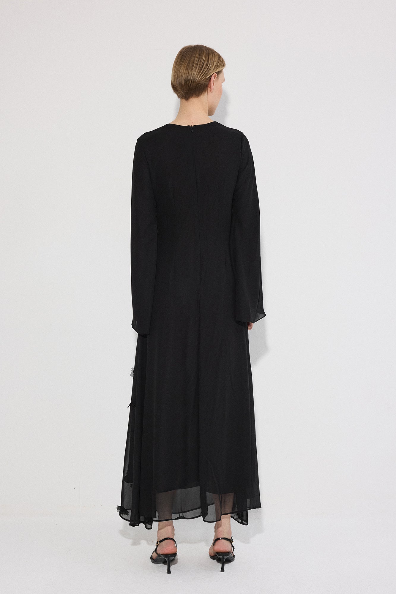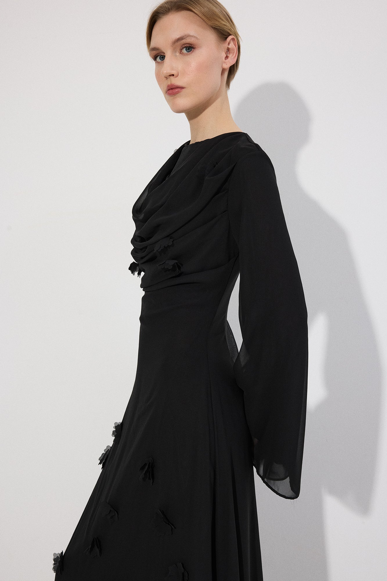 Bisiklet yaka. Ön kısmı drapeli. Uzun ve hafif volanlı kol. Kumaş üzerinde üç boyutlu çiçek/aplike detaylı. Arkadan gizli fermuar kapama.
