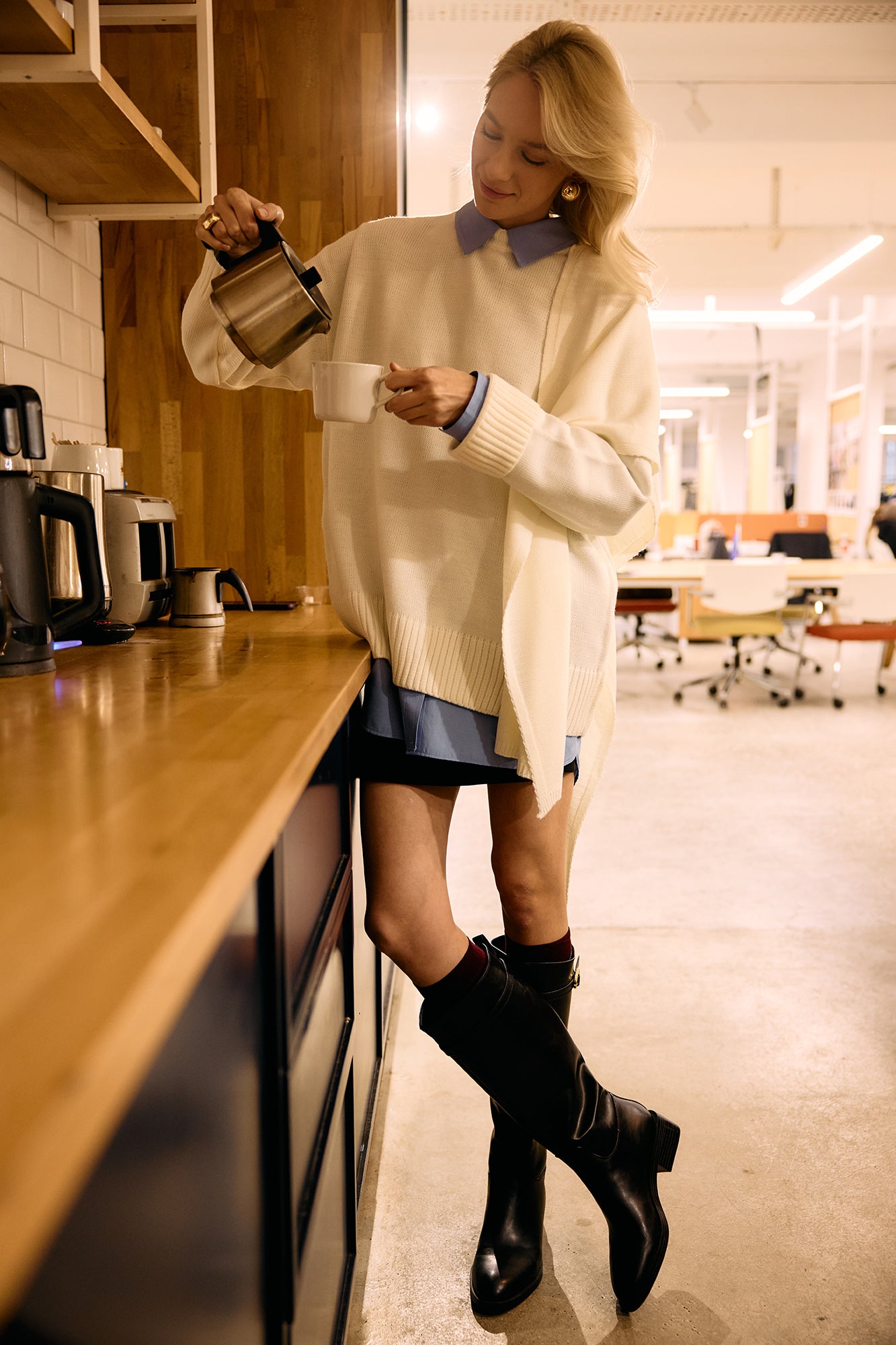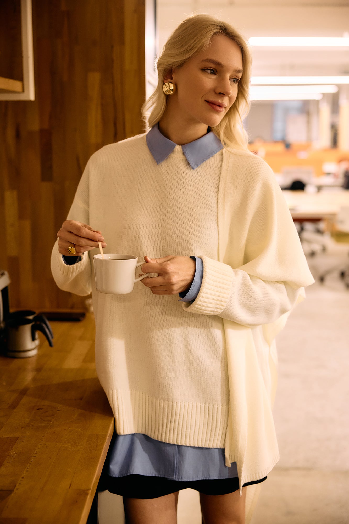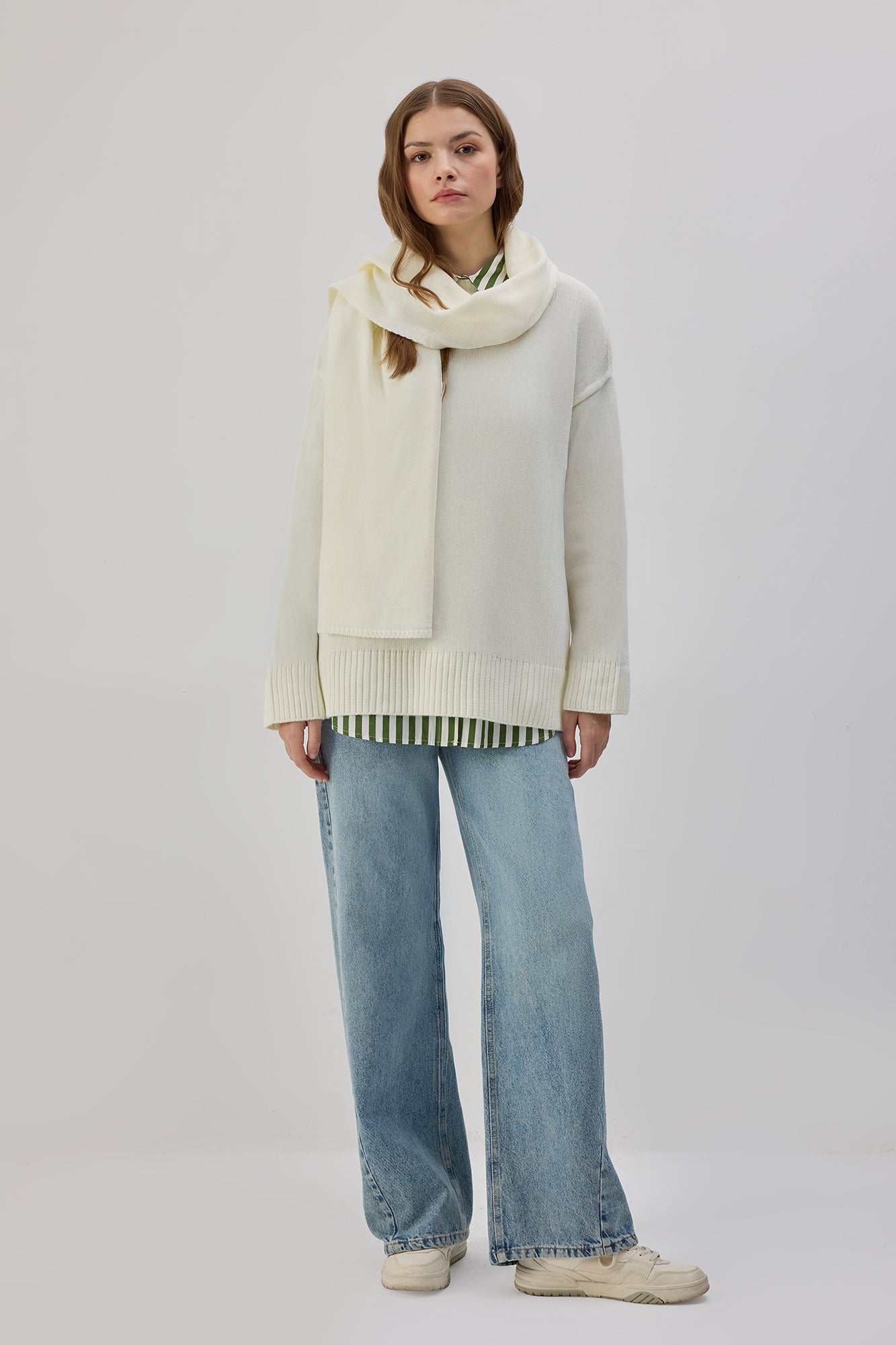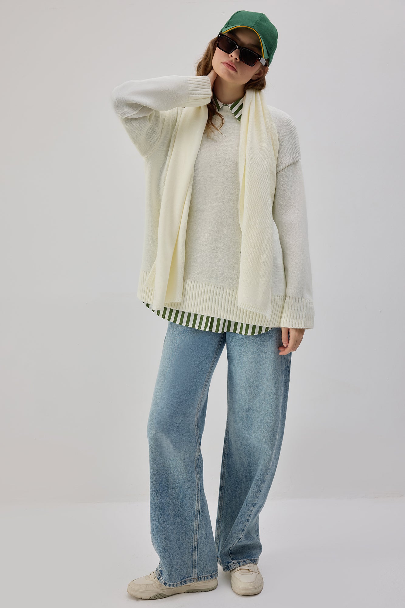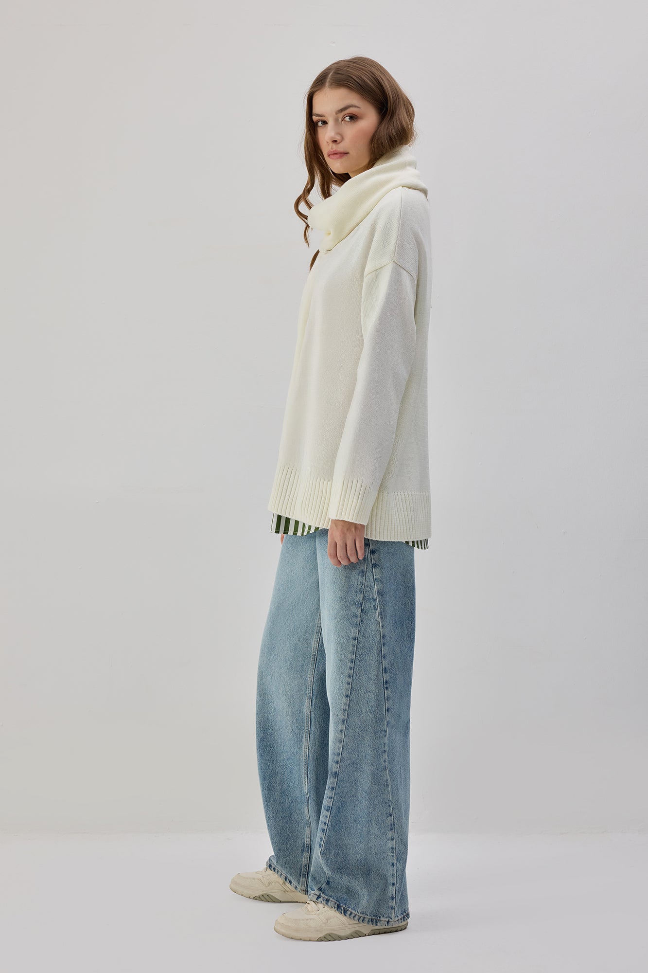 Atkı yakalı. Düşük omuzlu. Ribana kol ucu. Triko kazak.