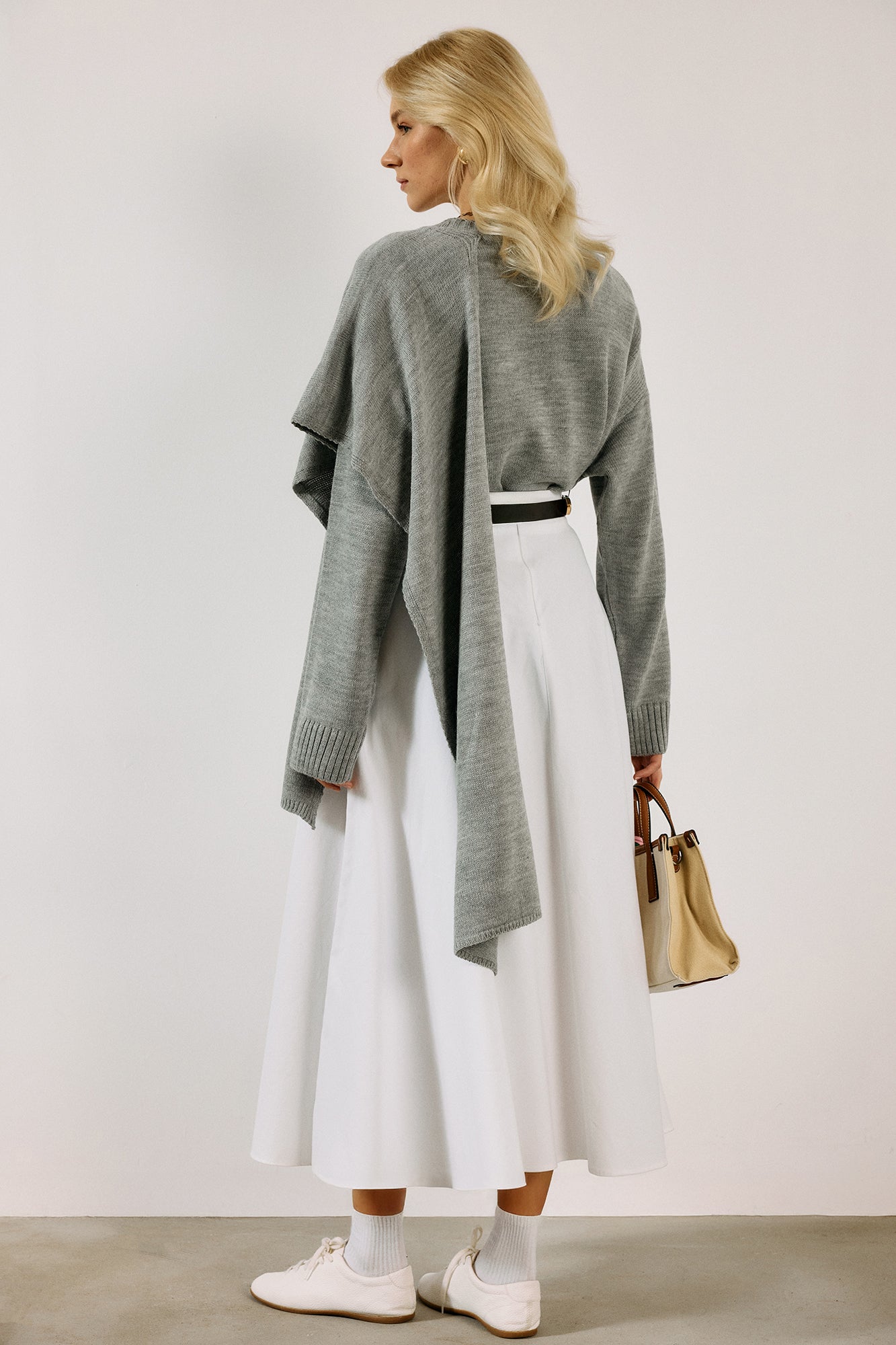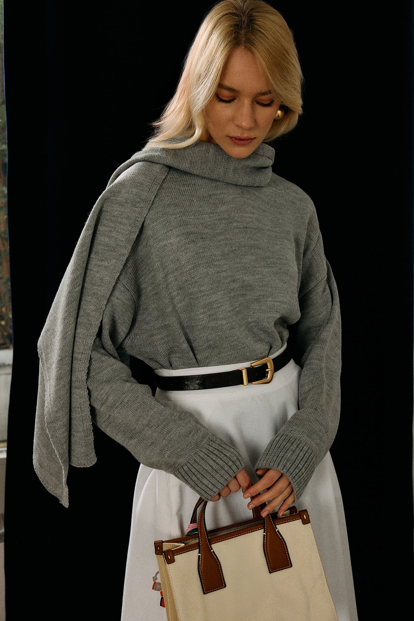 Atkı yakalı. Düşük omuzlu. Ribana kol ucu. Triko kazak.