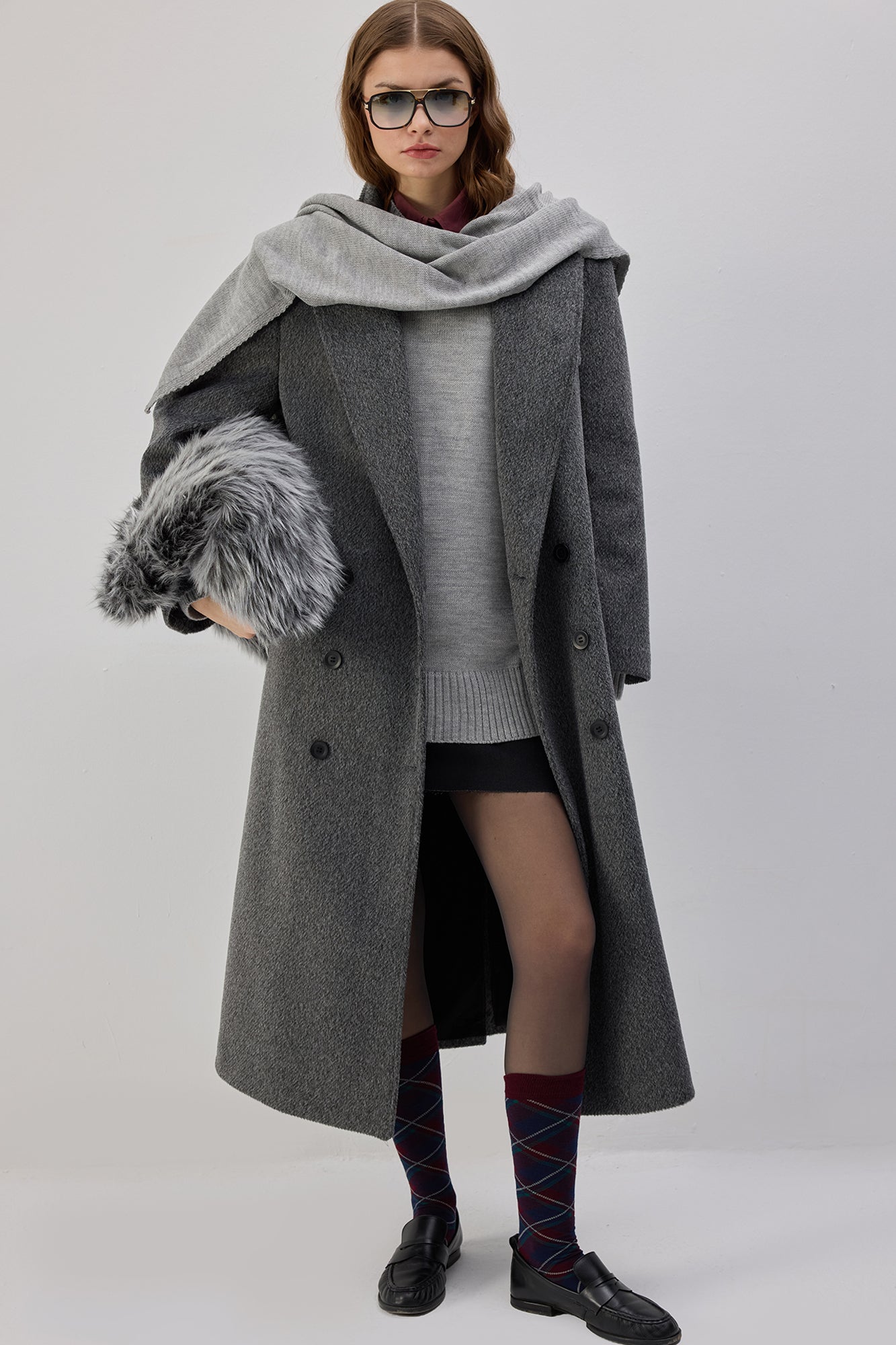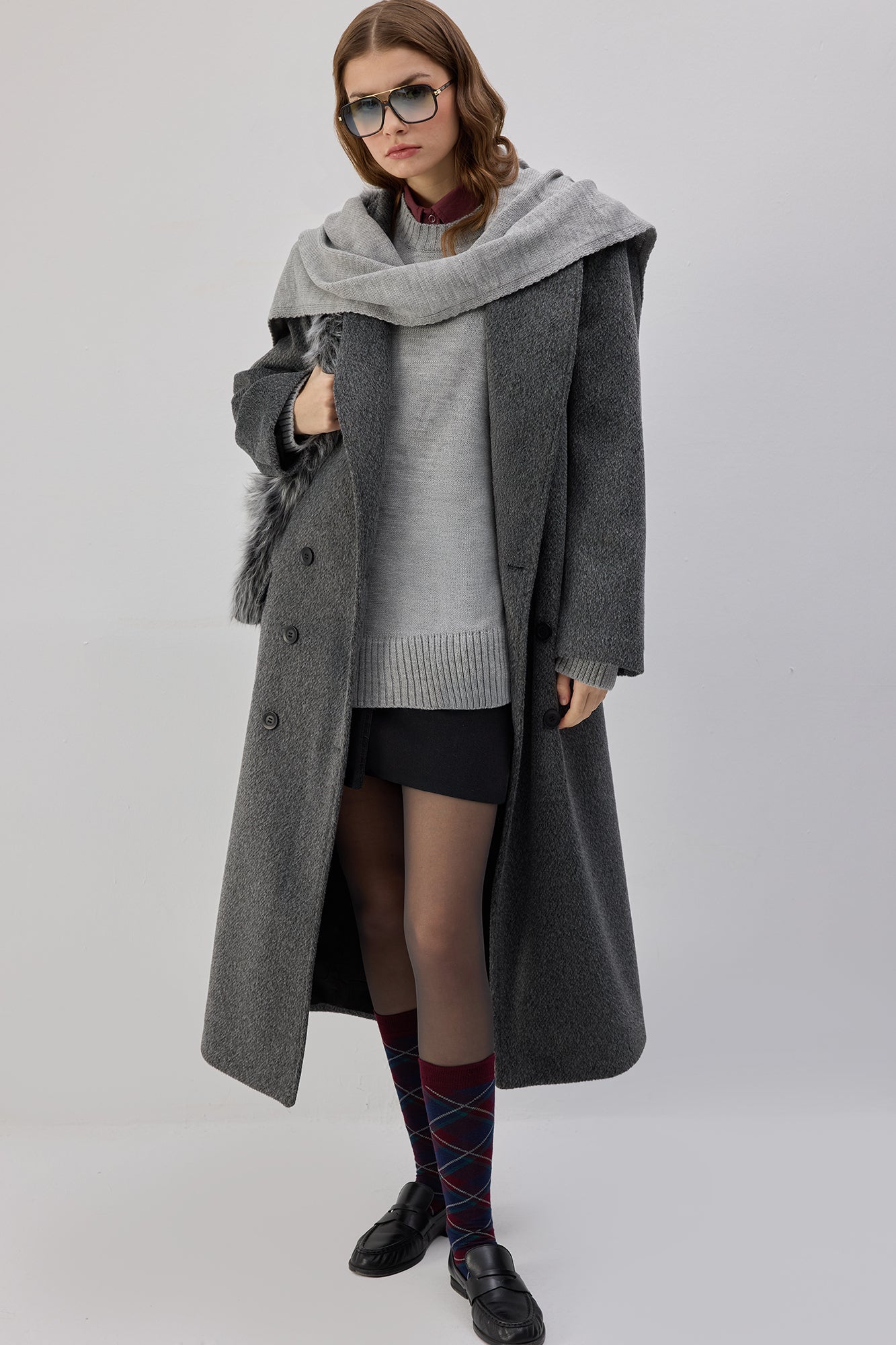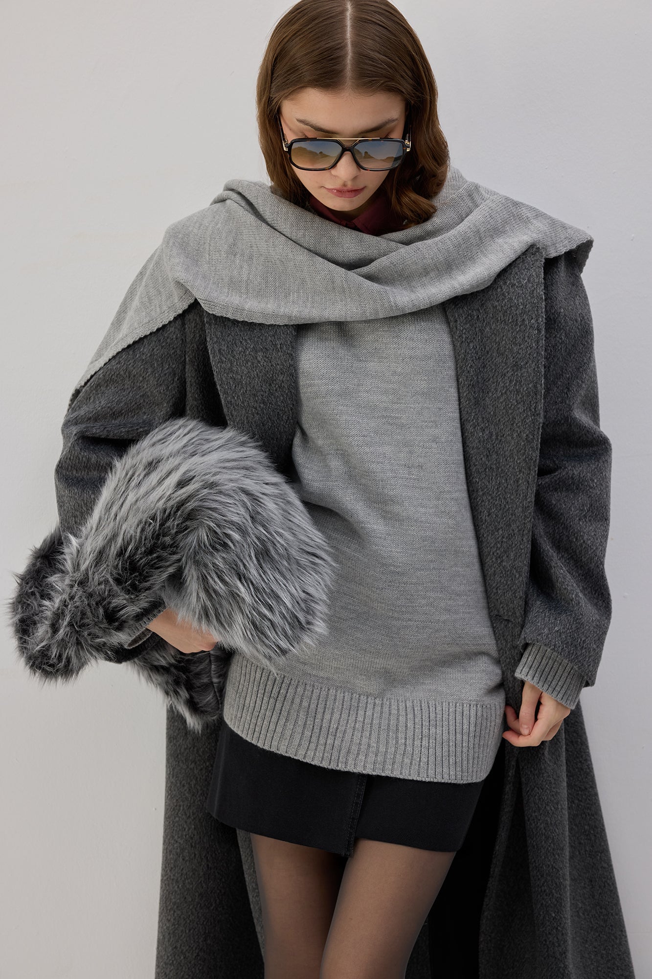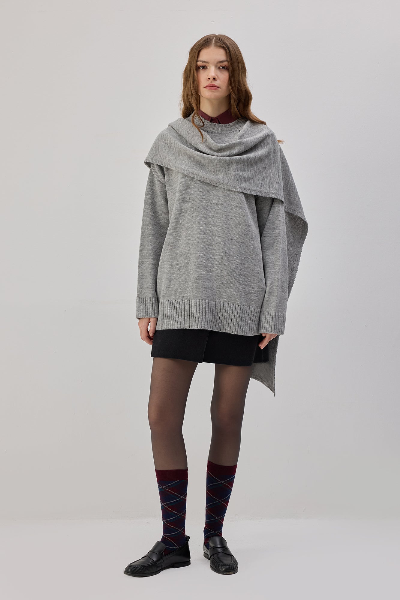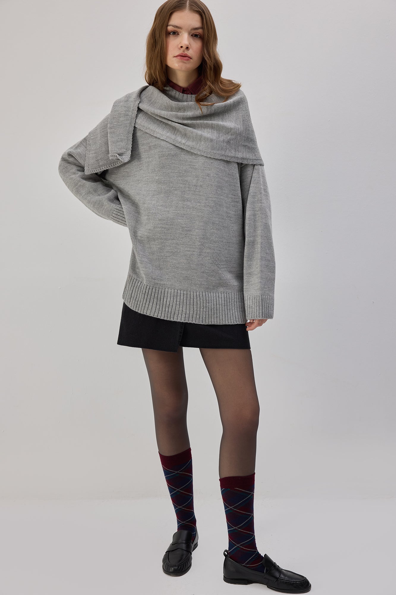Atkı yakalı. Düşük omuzlu. Ribana kol ucu. Triko kazak.