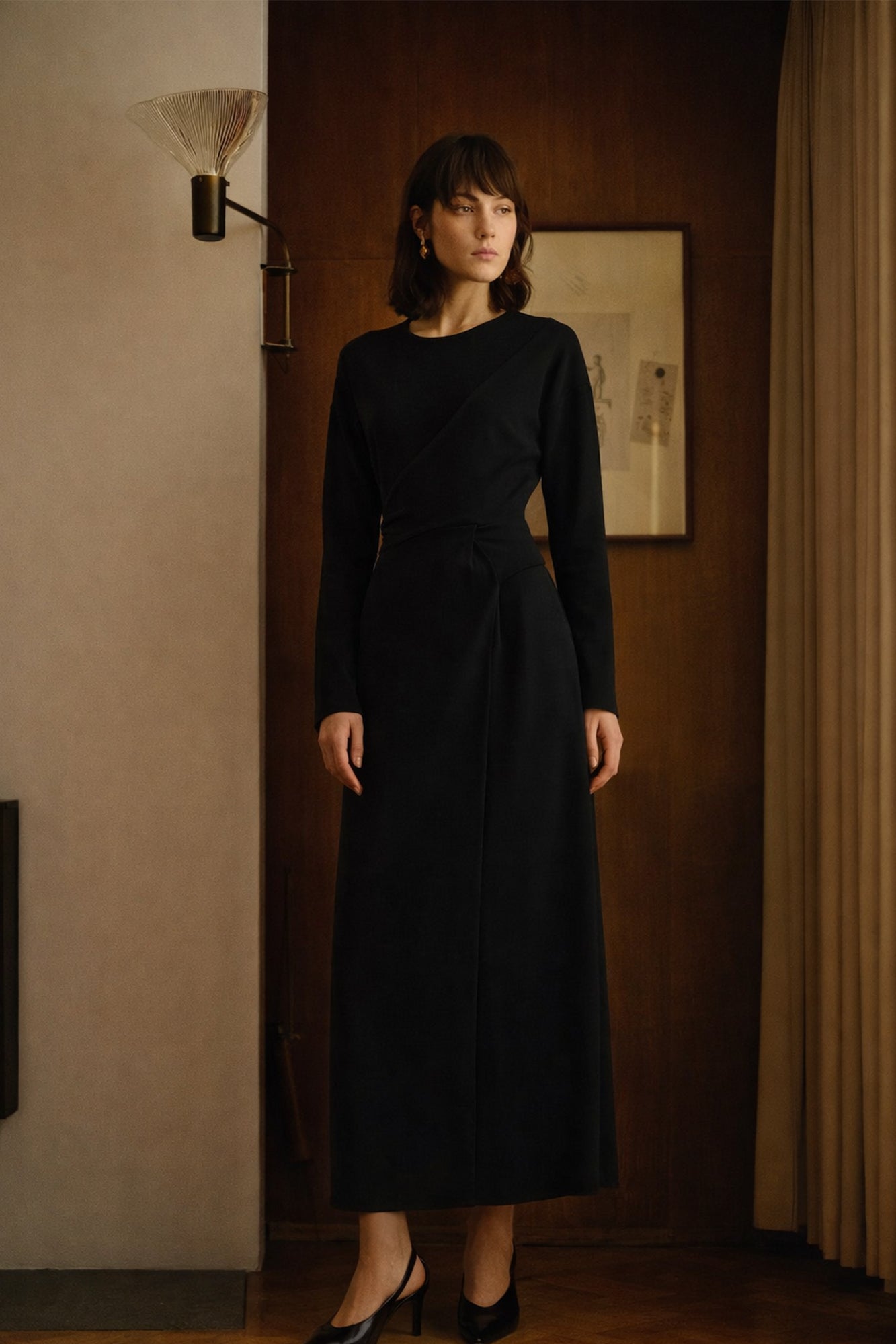 Bisiklet yaka. Düşük omuz. Uzun kollu. Bel kısmı bağlama detaylı. Scuba elbise.