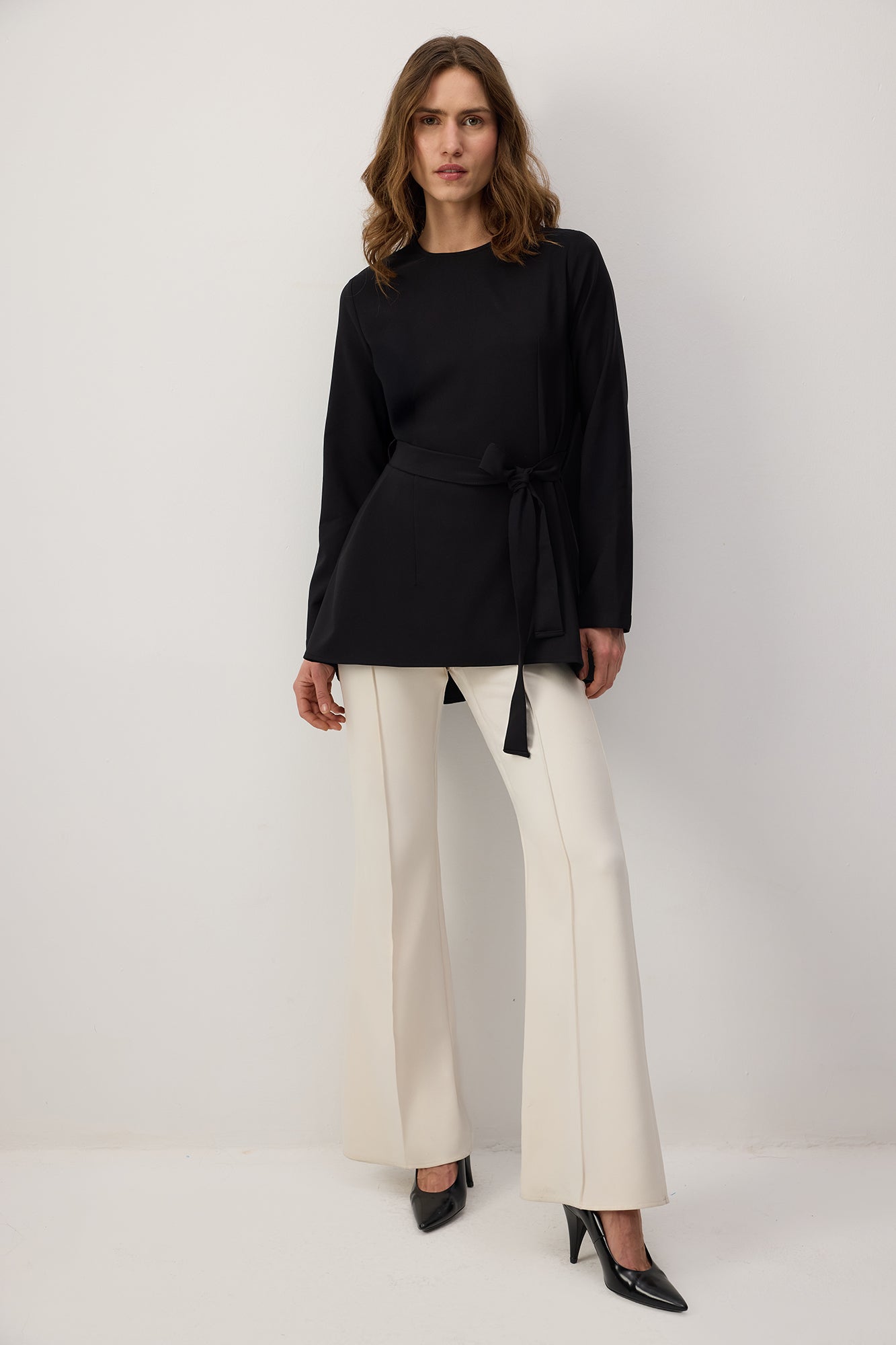 Kuşak detaylı uzun kollu bluz. Minimal tasarım. Rahat kesim.