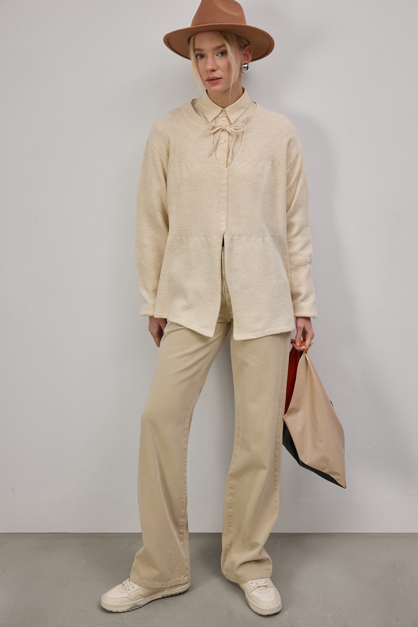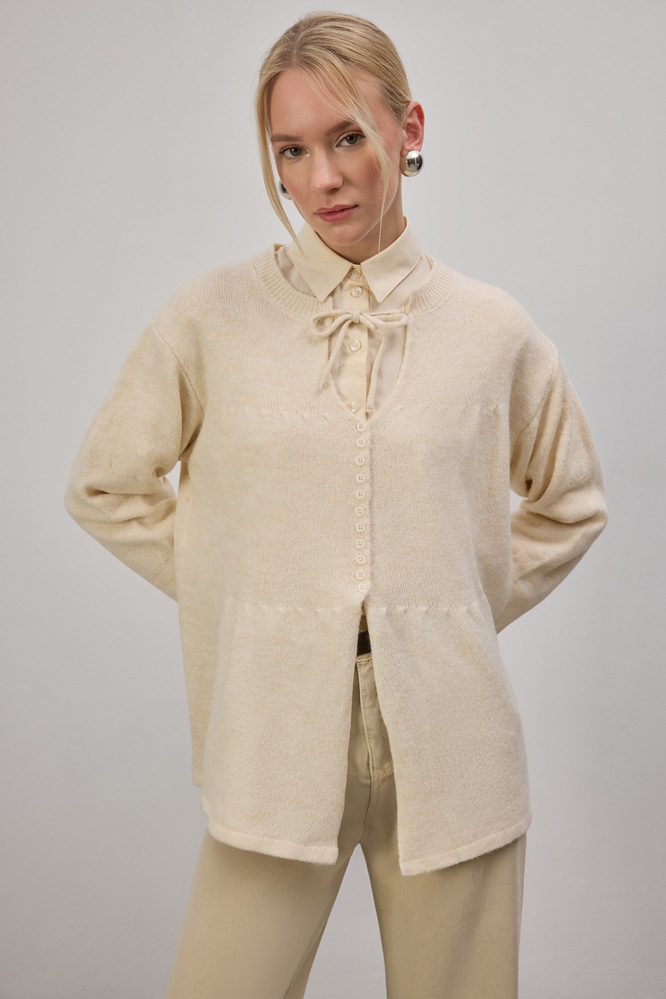 Yaka kısmı bağcıklı. Önü düğme kapamalı. Uzun kollu. Triko hırka.