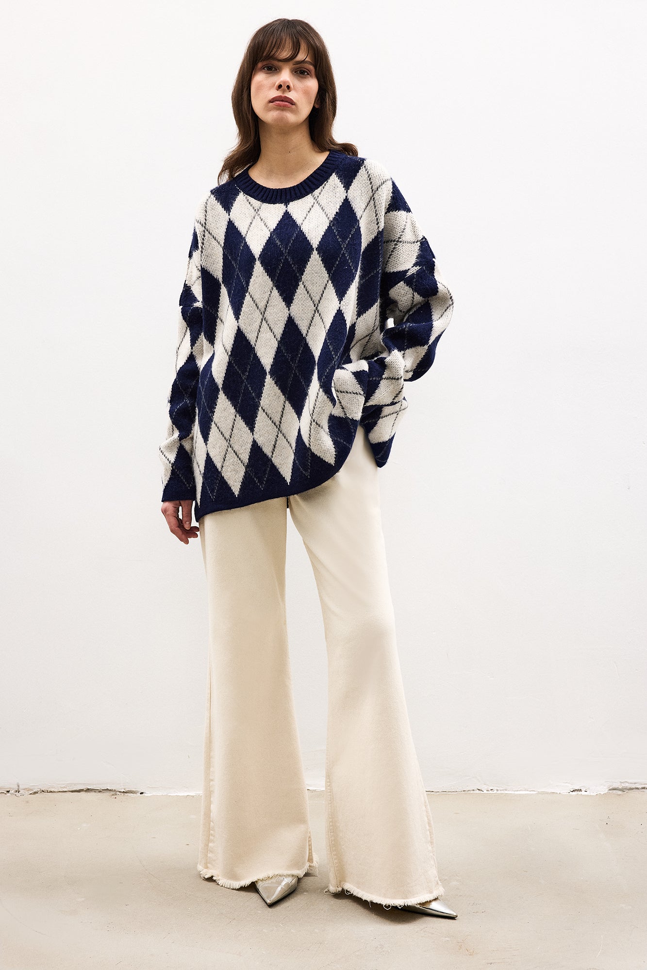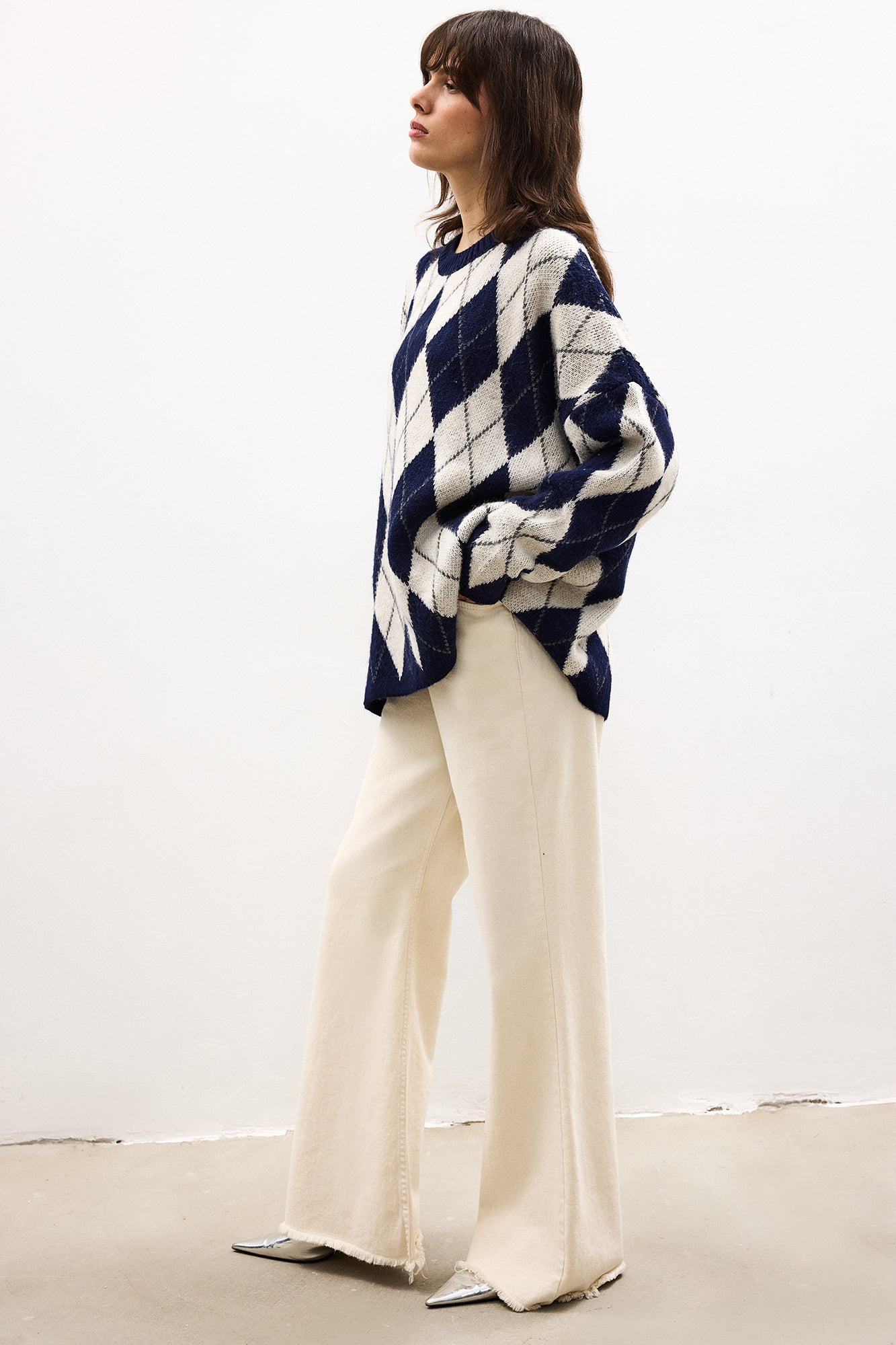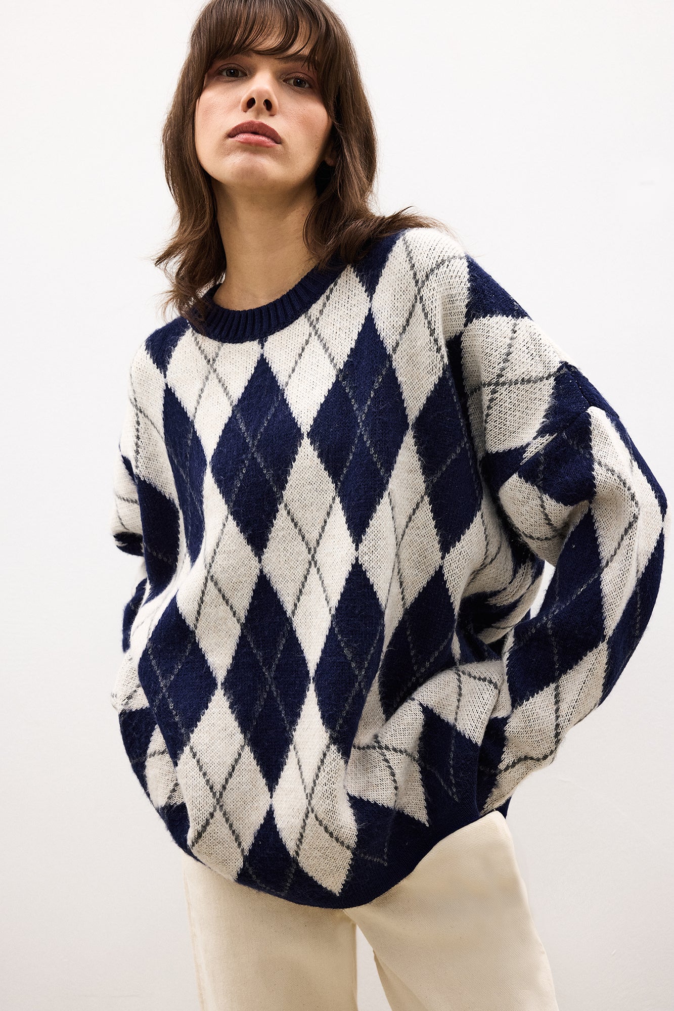 Bisiklet yaka. Uzun kollu. Baklava desenli. Triko.