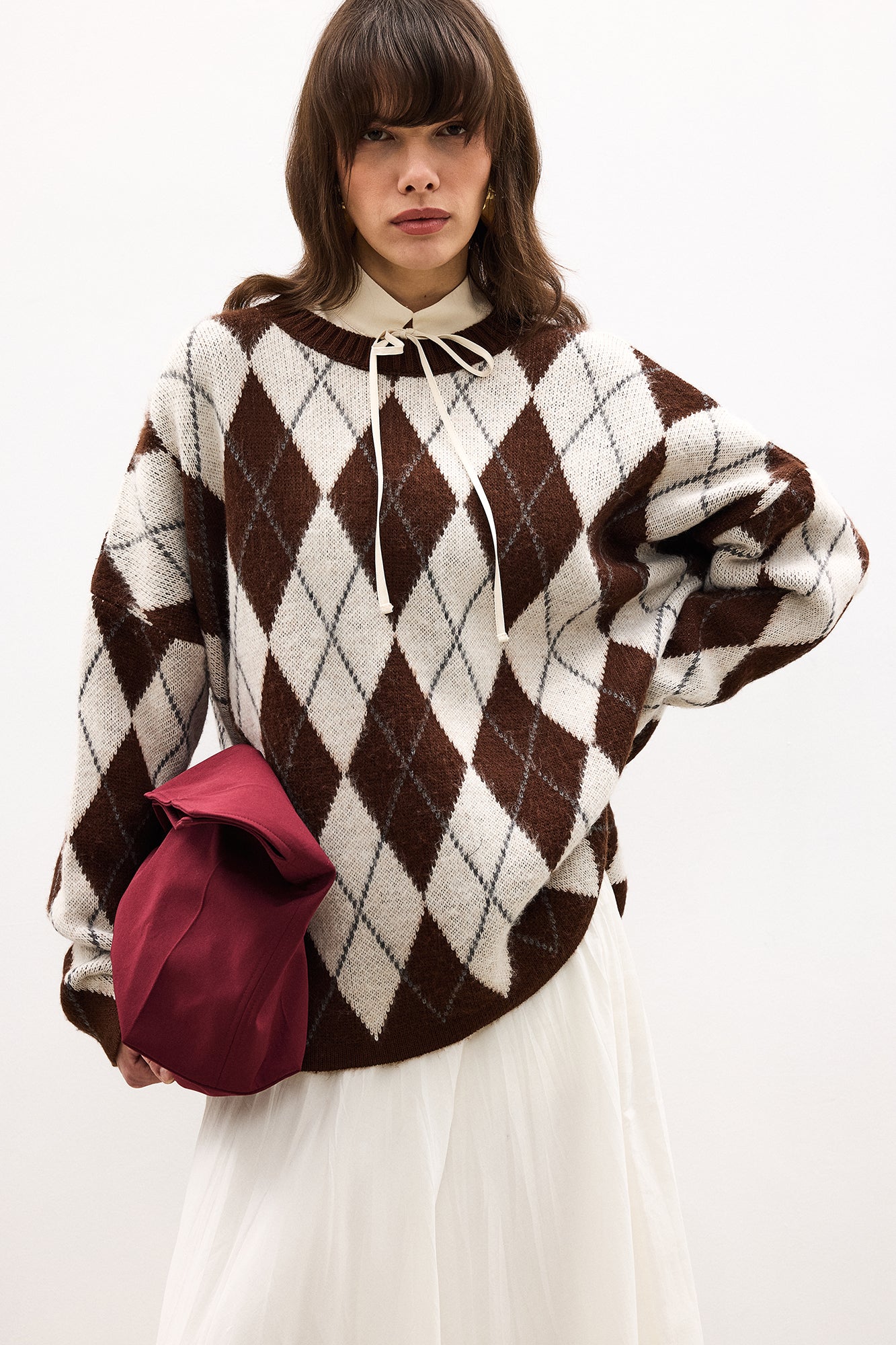 Bisiklet yaka. Uzun kollu. Baklava desenli. Triko.