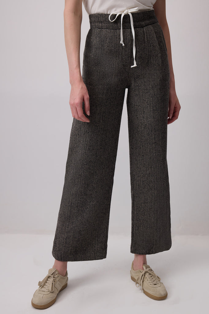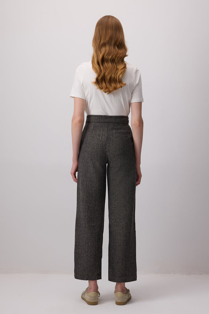 Kontrast kumaştan, ayarlanabilen bağcıklı çift bel bantlı. Yüksek bel. Pensli. Balık sırtı desenli. Pantolon.