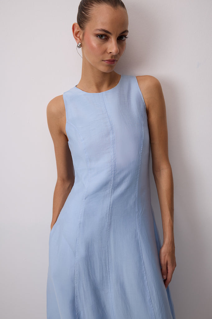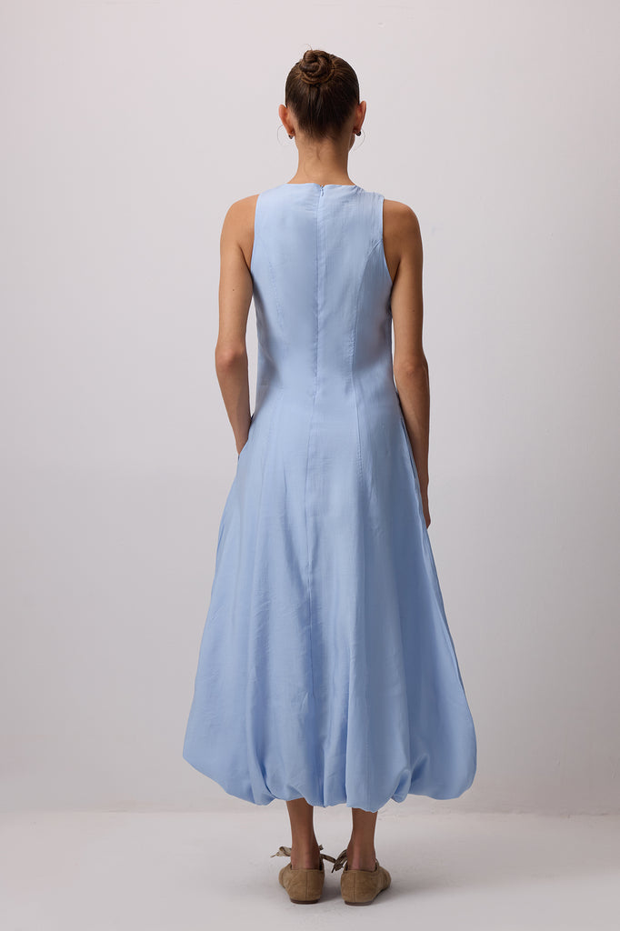 Bisiklet yaka. Kolsuz. Balon eteki. Arka tek düğme kapamalı. Jile.