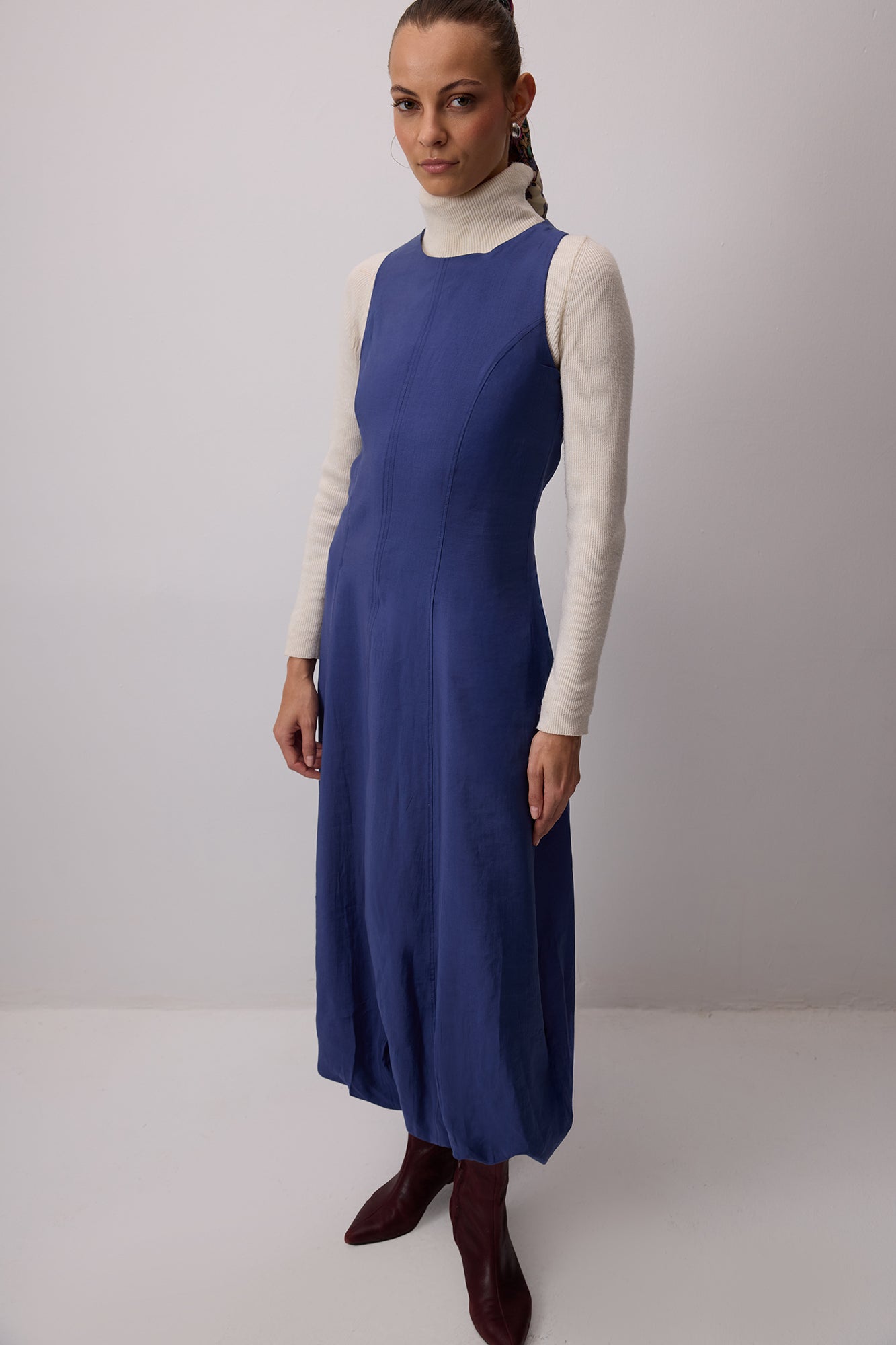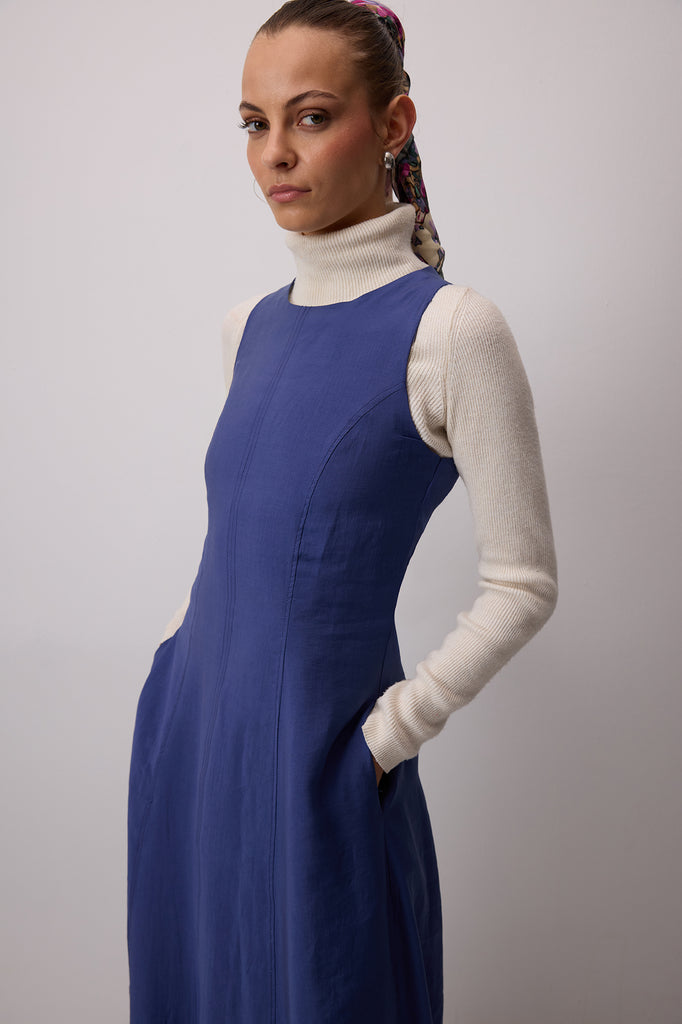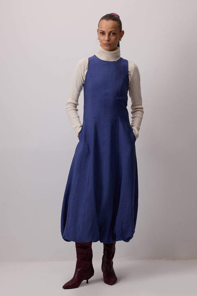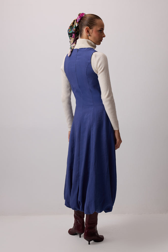 Bisiklet yaka. Kolsuz. Balon eteki. Arka tek düğme kapamalı. Jile.