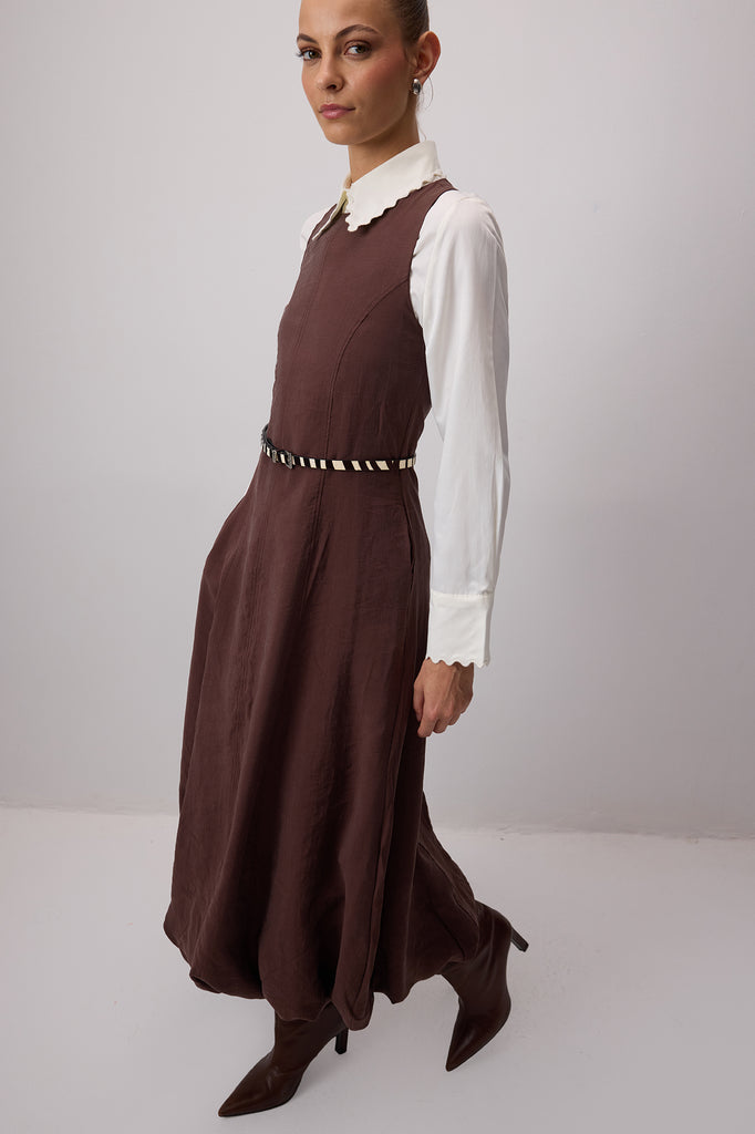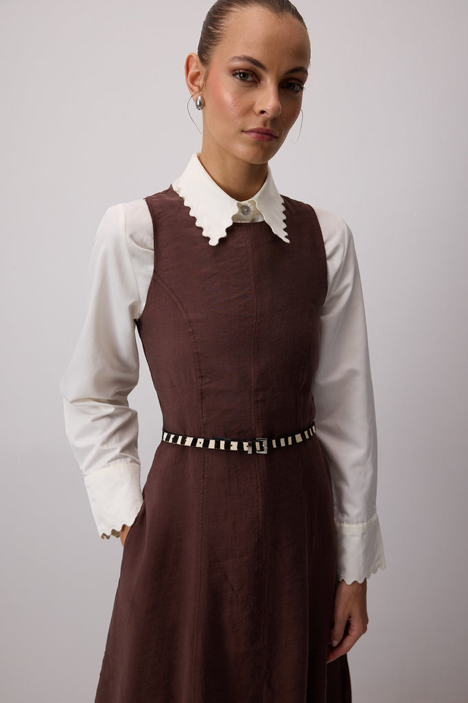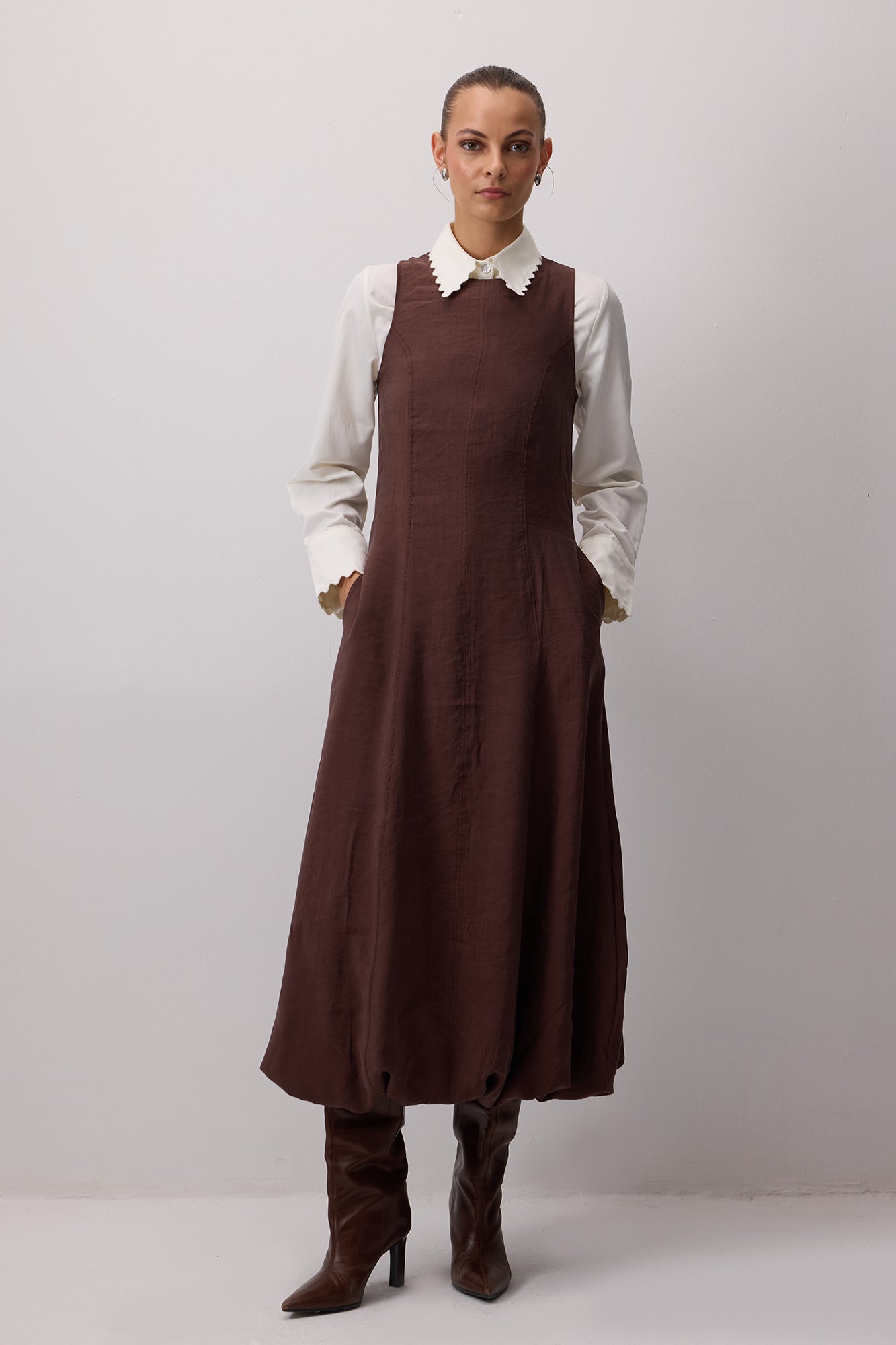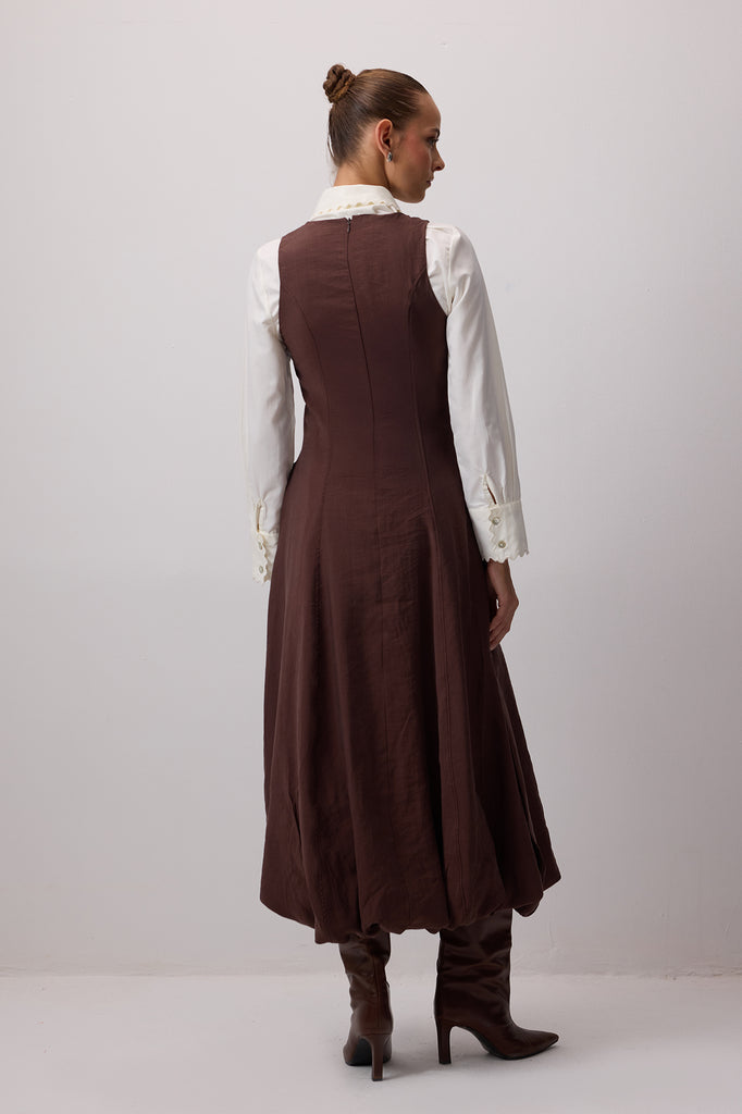 Bisiklet yaka. Kolsuz. Balon eteki. Arka tek düğme kapamalı. Jile.