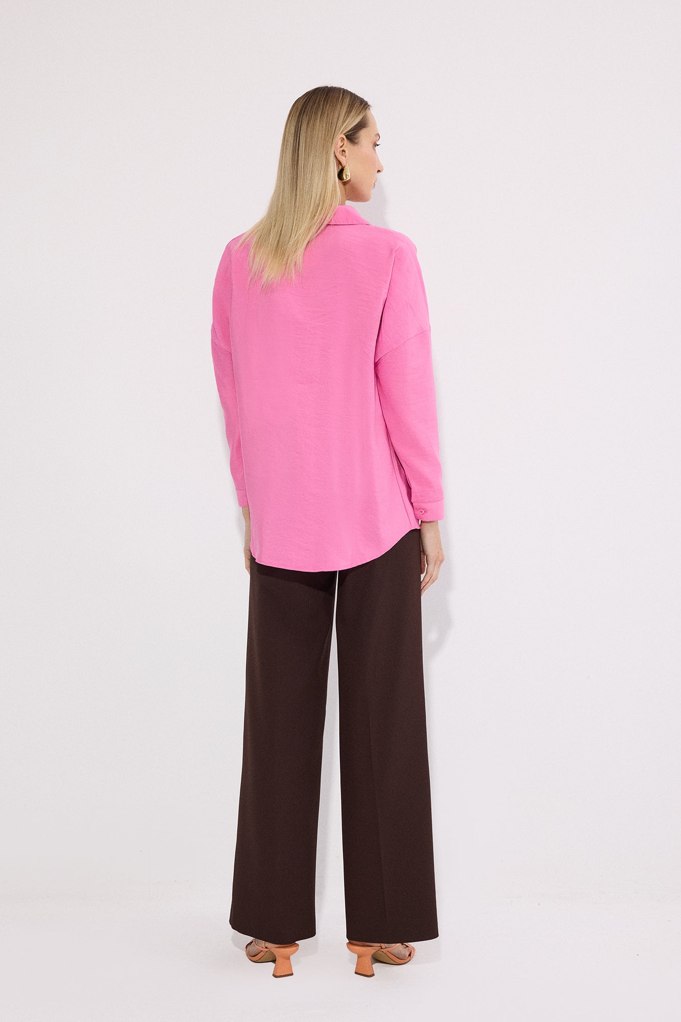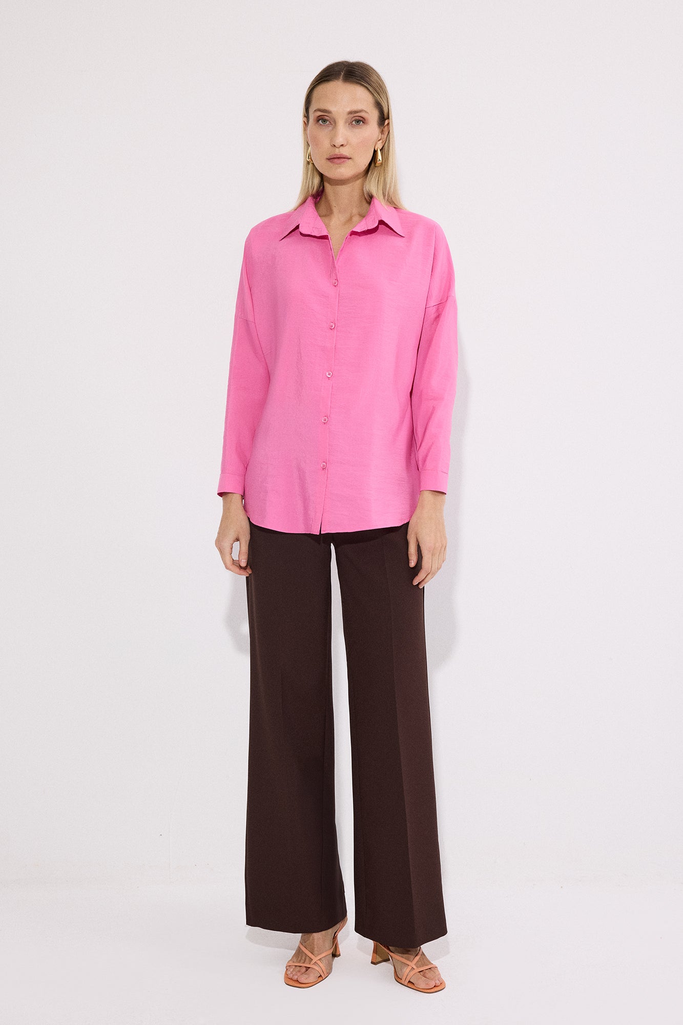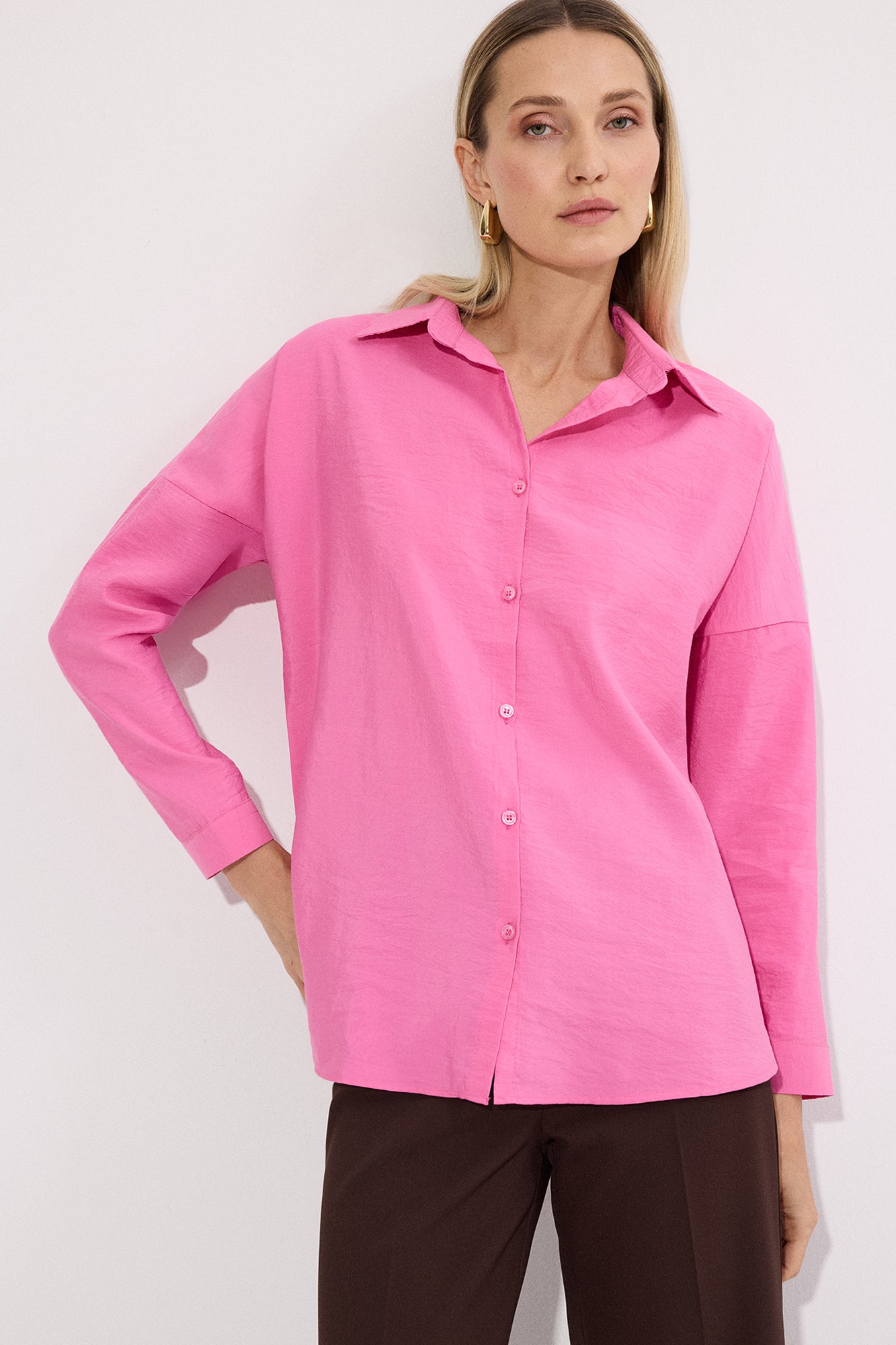 Gömlek yaka. Uzun kol. Önü düğme kapamalı. Düşük omuz. Kupra gömlek.