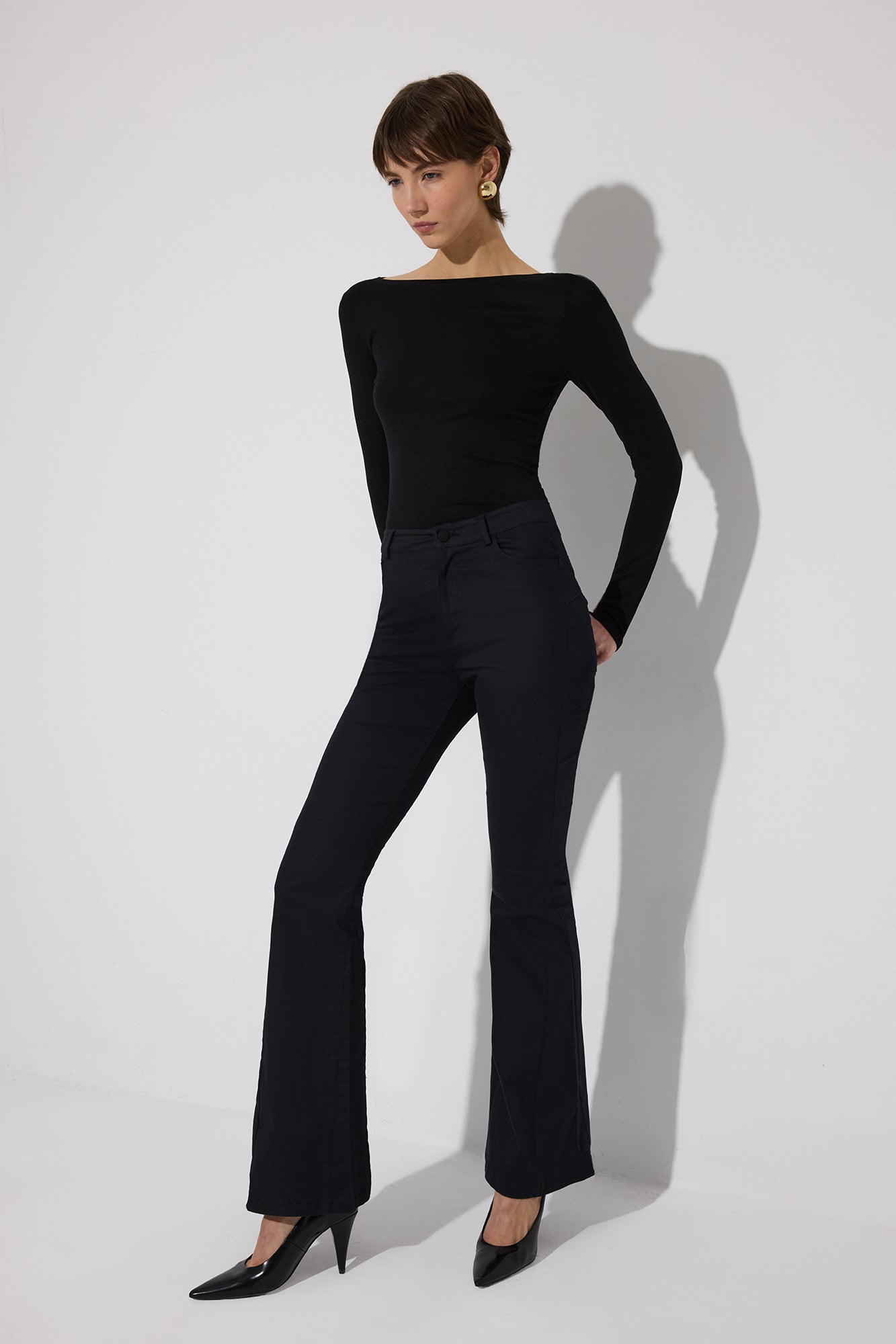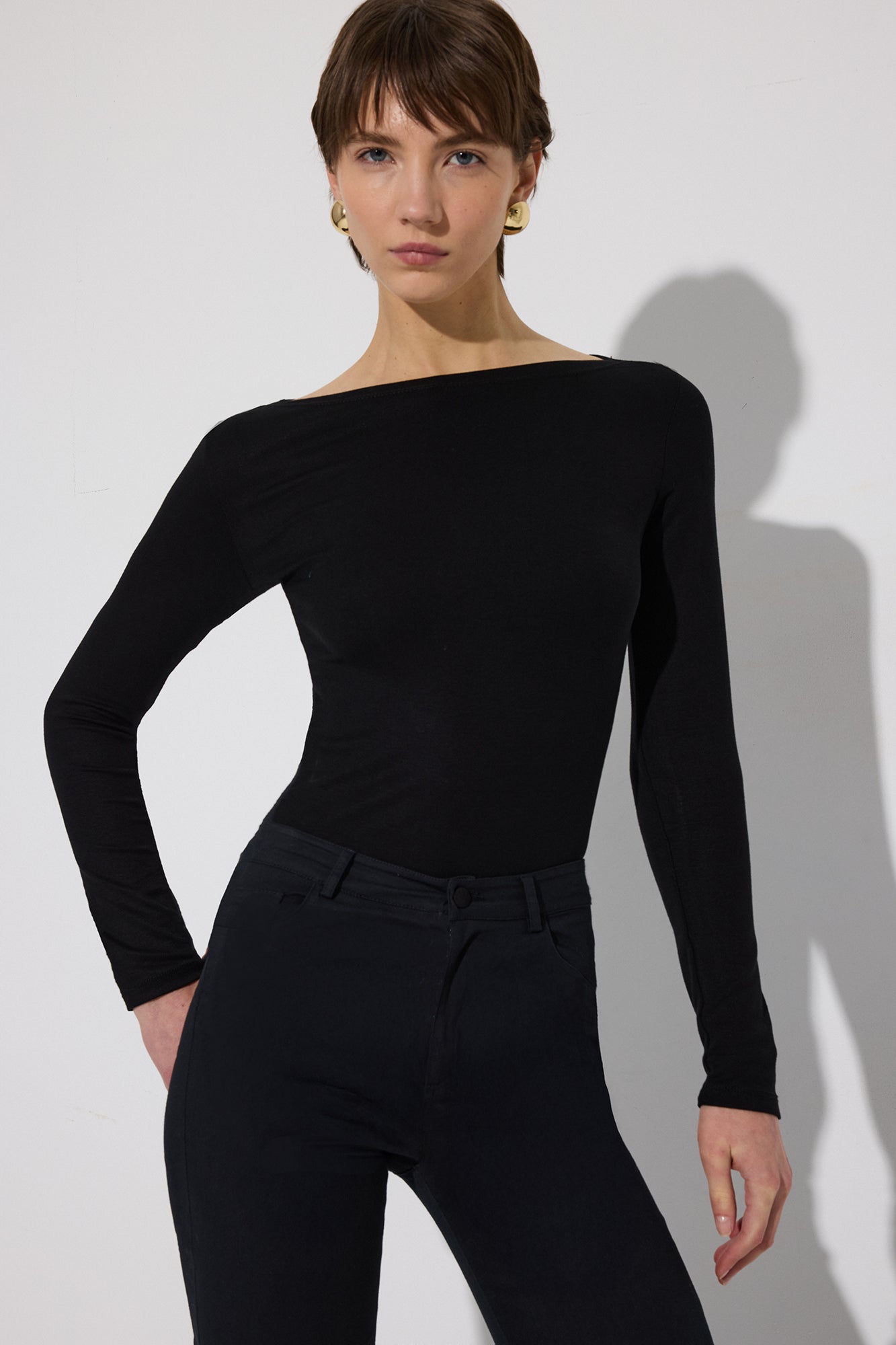 Kayık yaka. Uzun kollu. Vücuda oturan. Basıc body.
