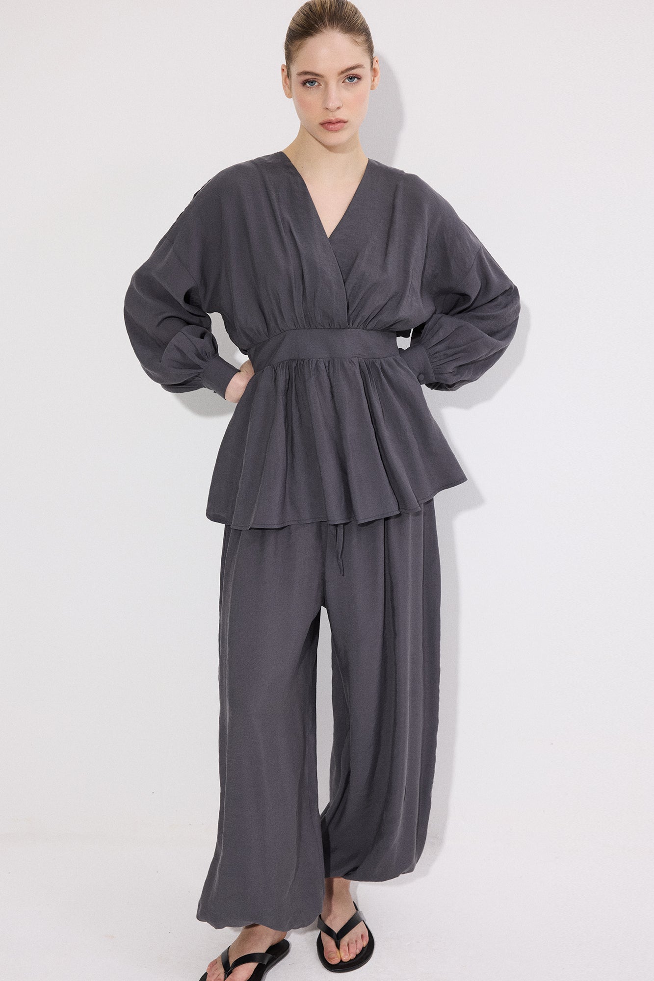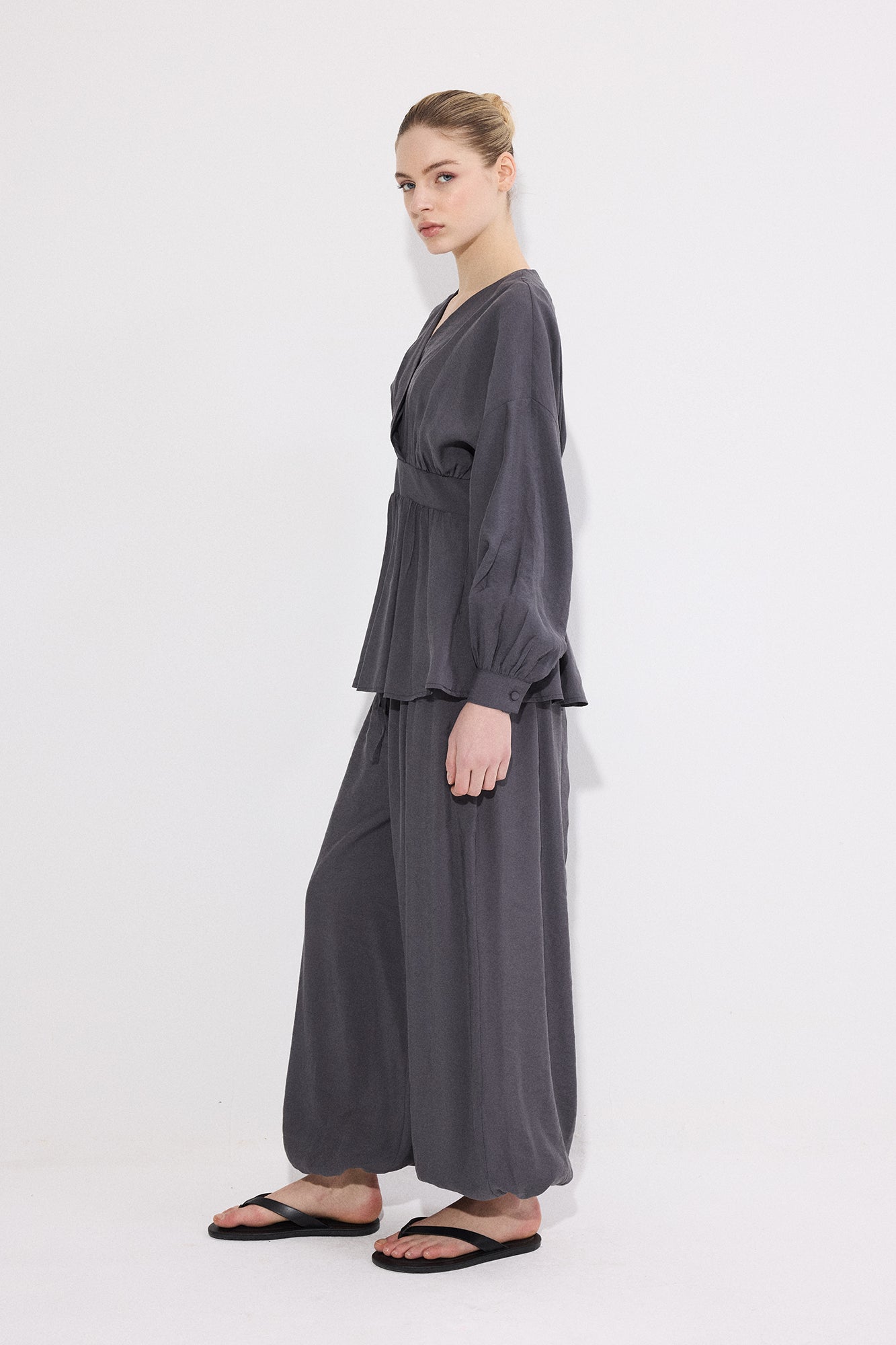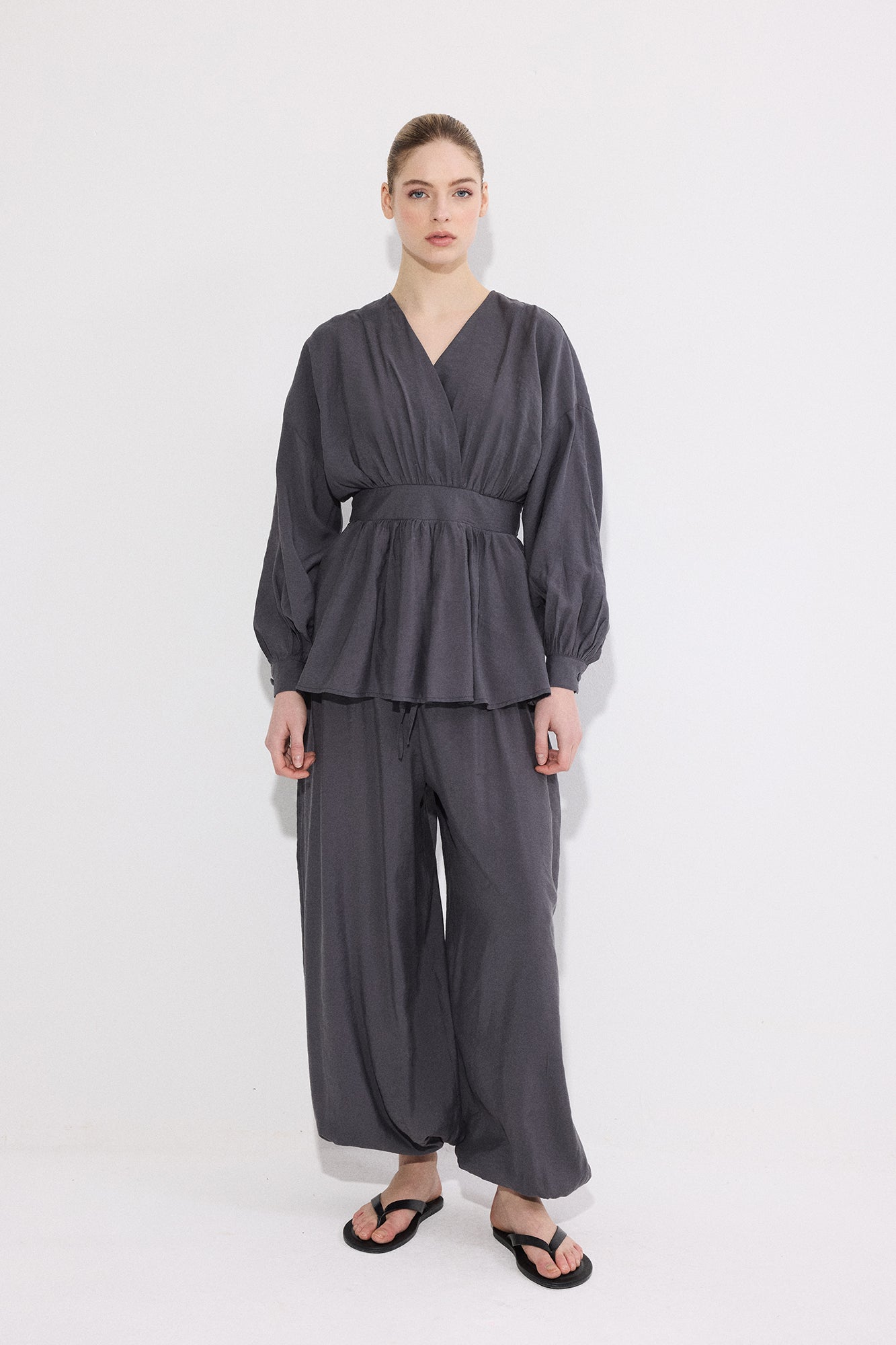 V yaka. Uzun kol. Bel bağlama detaylı. Yan fermuar kapamalı. Lastikli bel pantolon.