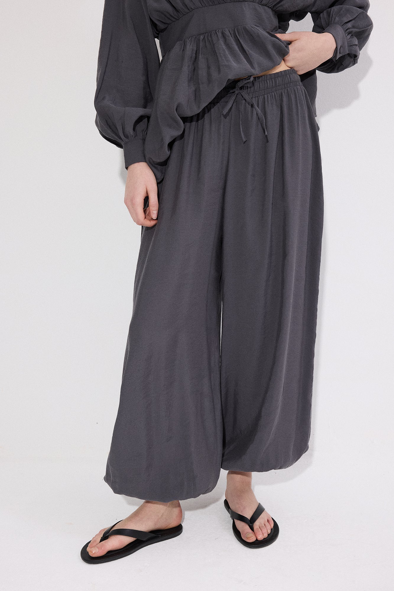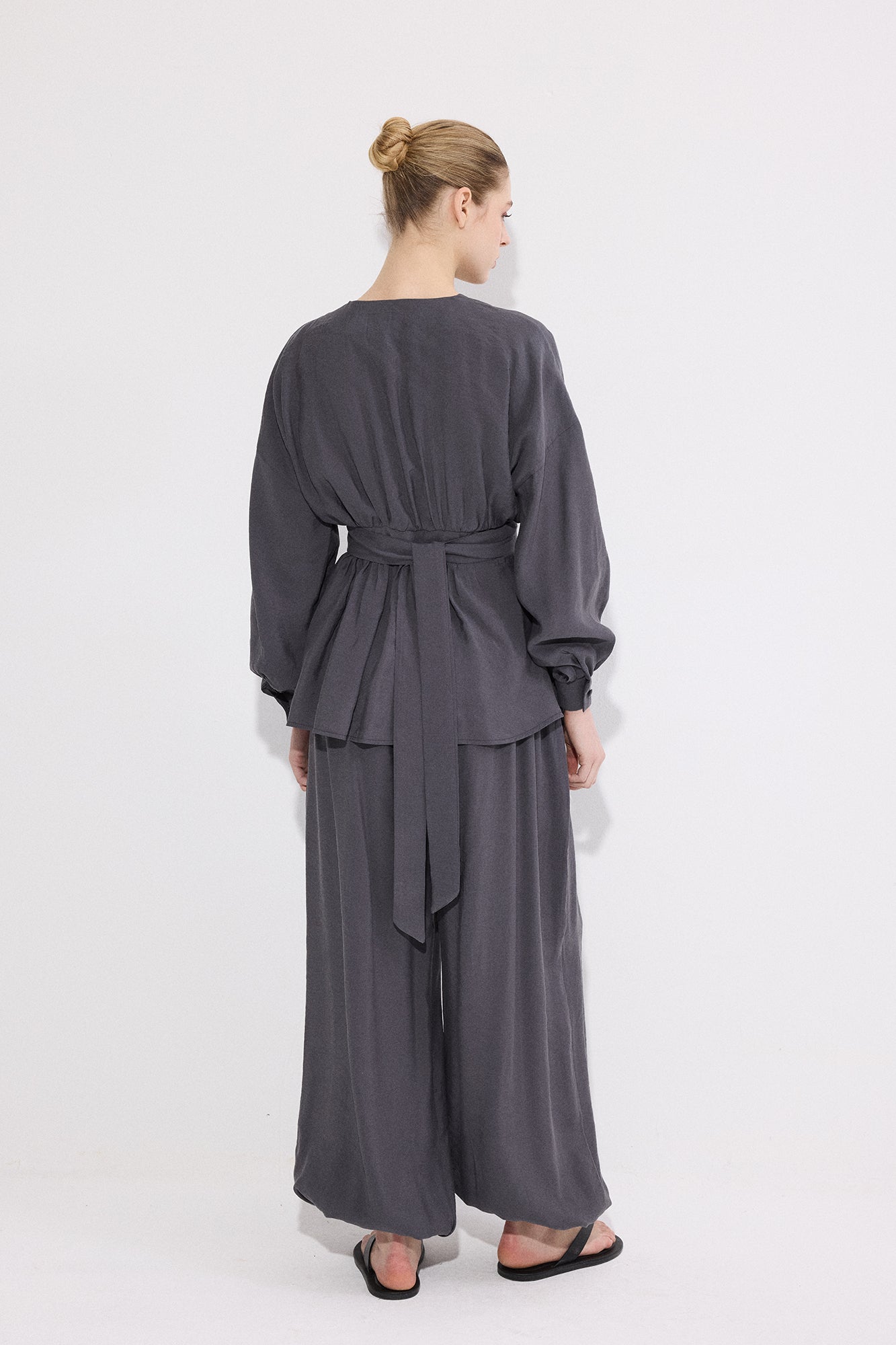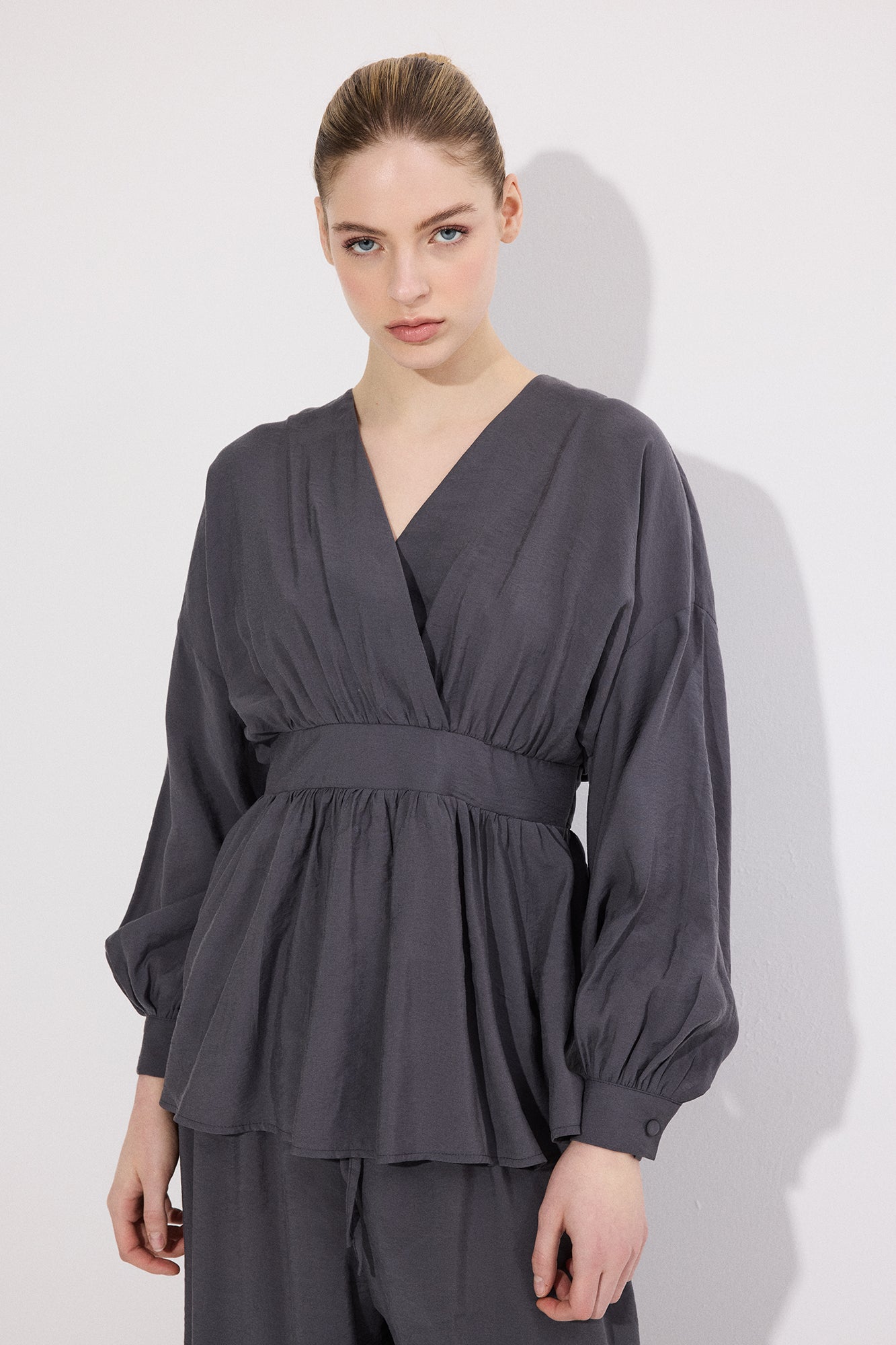 V yaka. Uzun kol. Bel bağlama detaylı. Yan fermuar kapamalı. Lastikli bel pantolon.