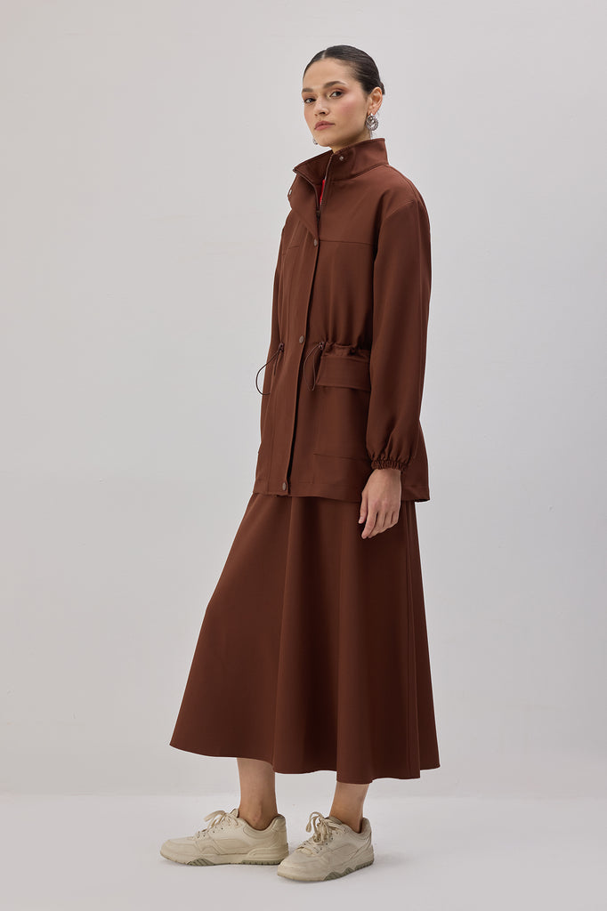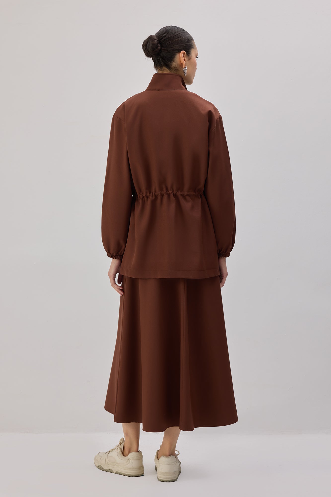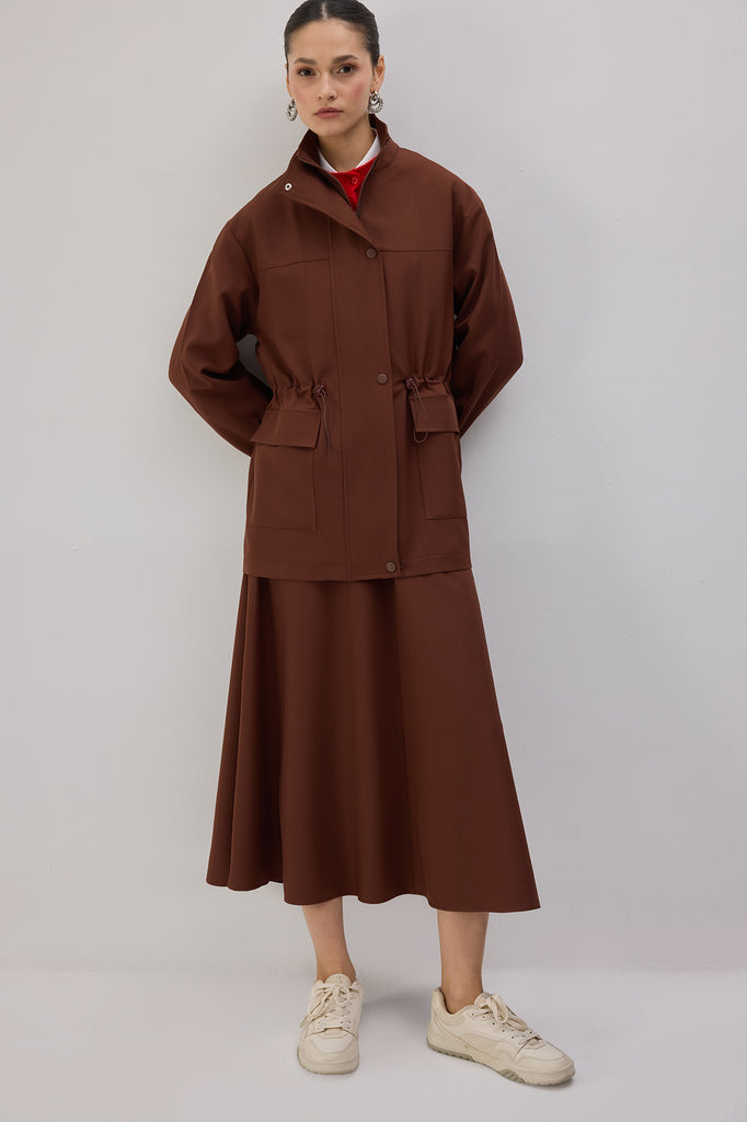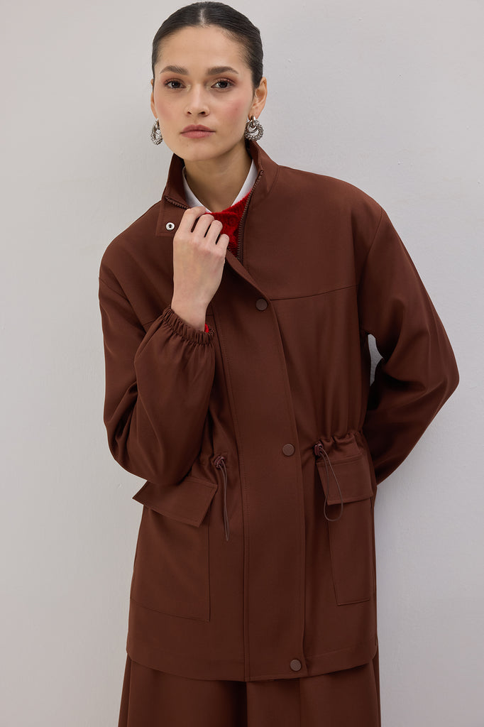Ayarlanabilir büzgülü bel. Cepli. Önden fermuarlı. Çıtçıt kapamalı. Lastik kol.