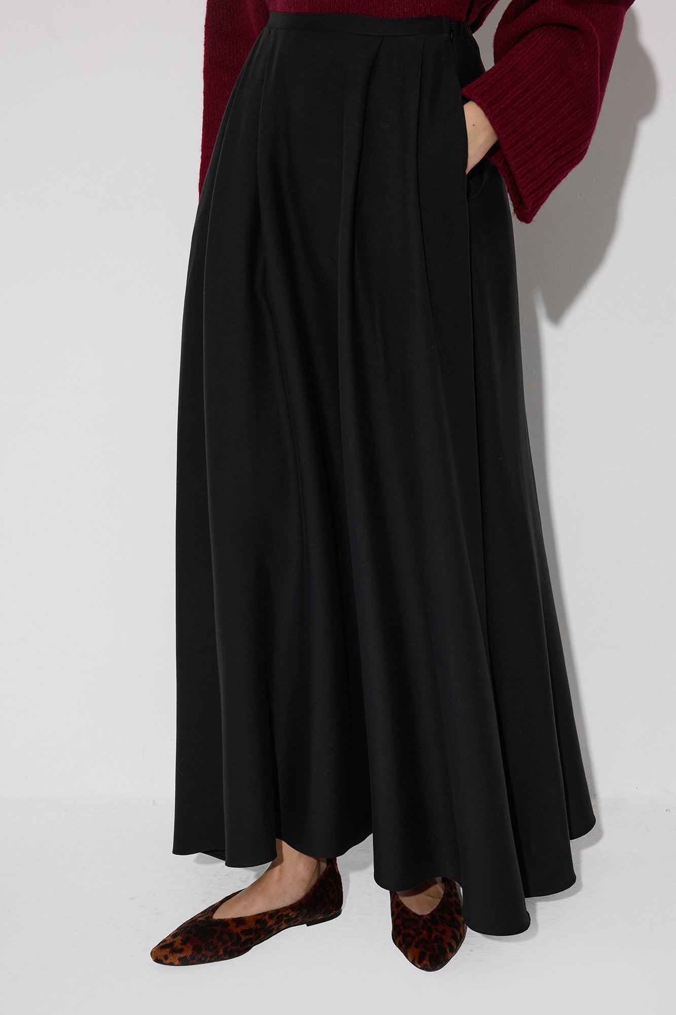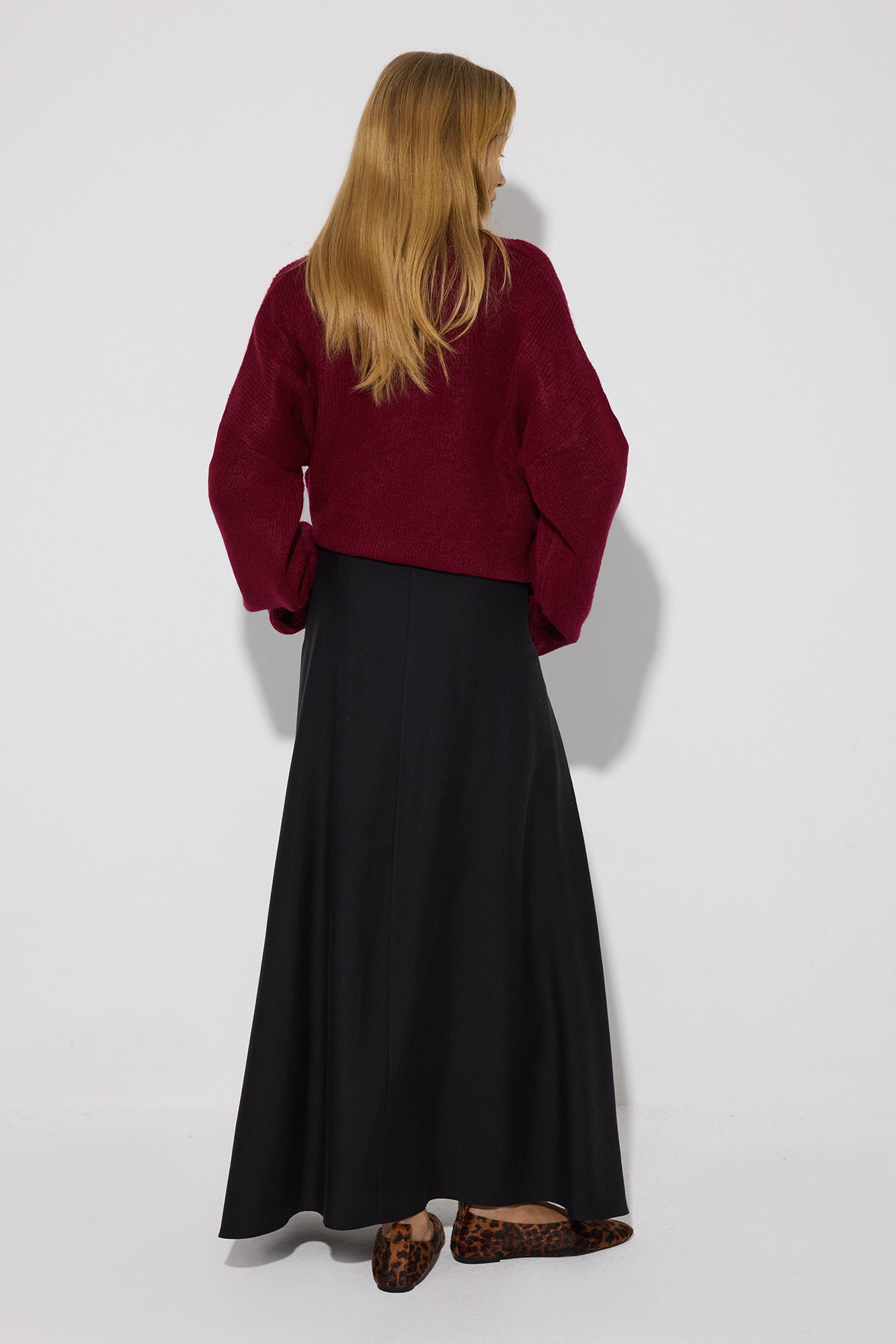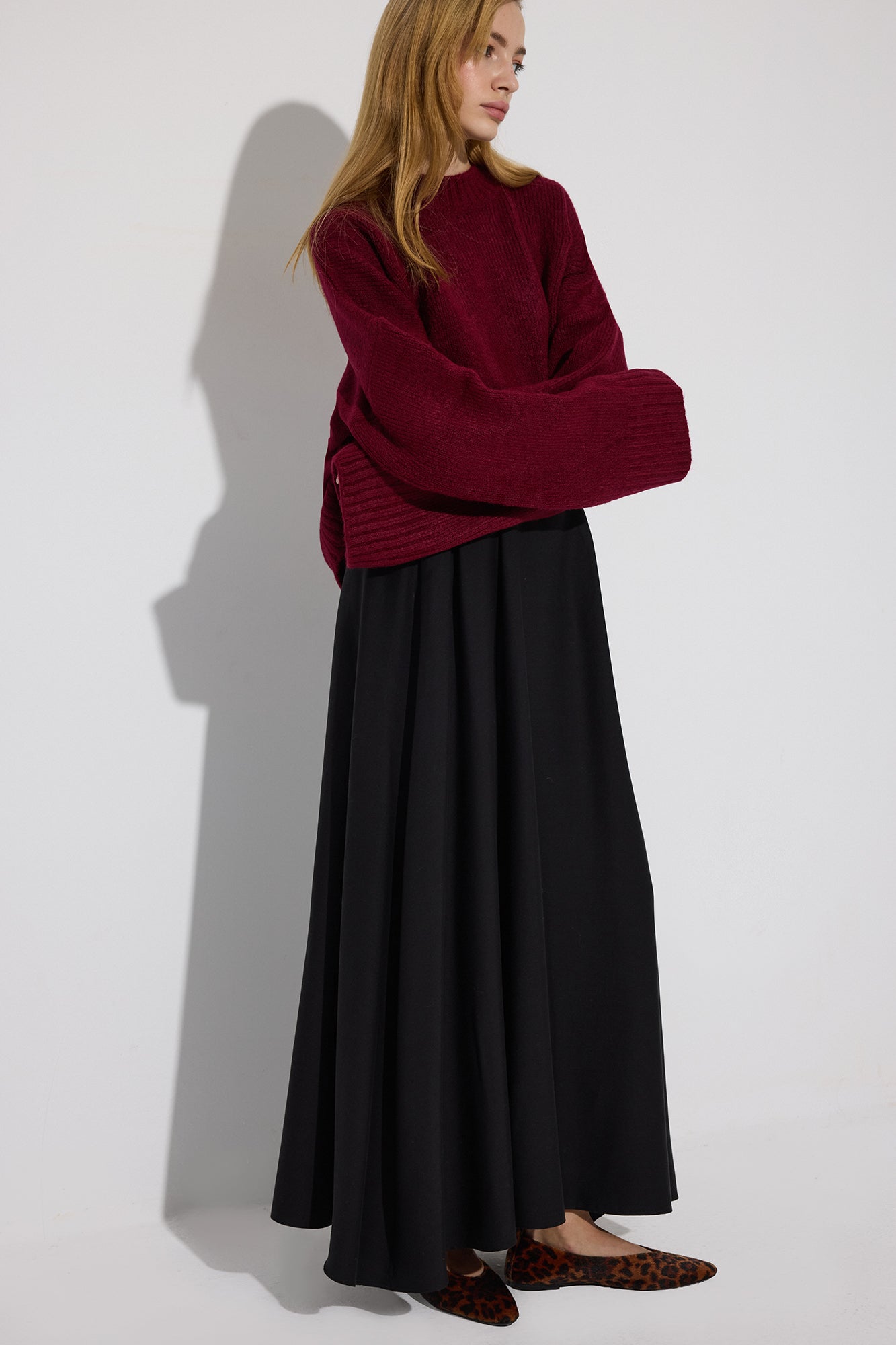 Beli lastikli. Yüksek bel. Pile detaylı. Maxi boy. Yan cepli.
