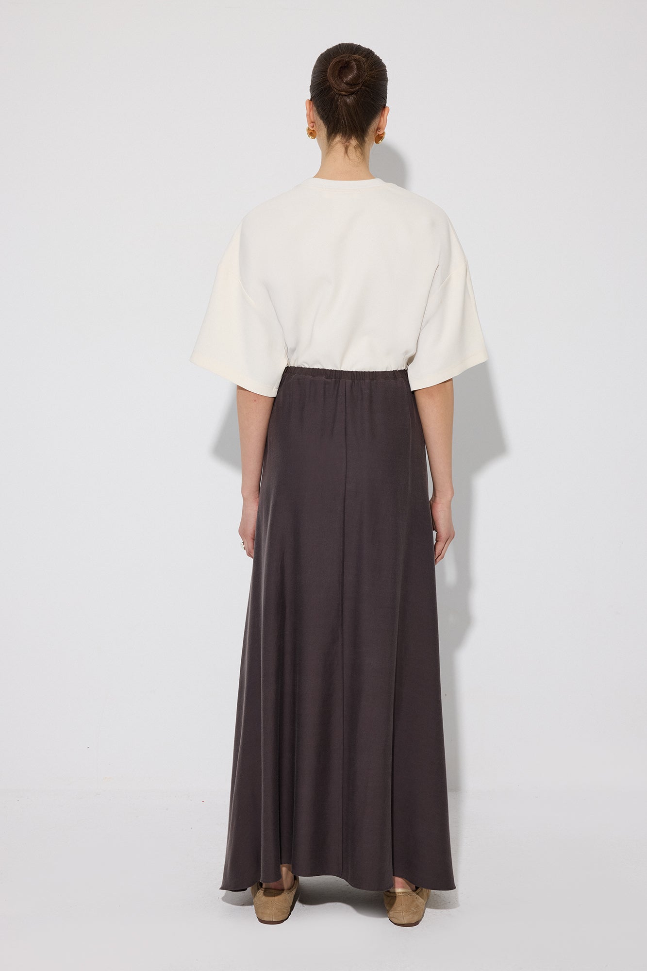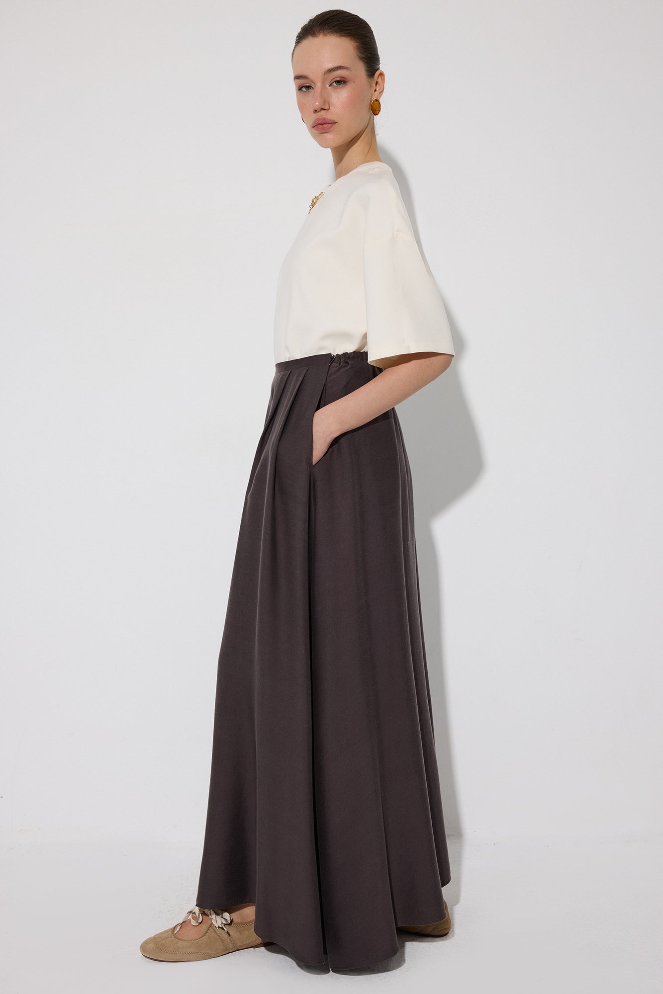 Beli lastikli. Yüksek bel. Pile detaylı. Maxi boy. Yan cepli.