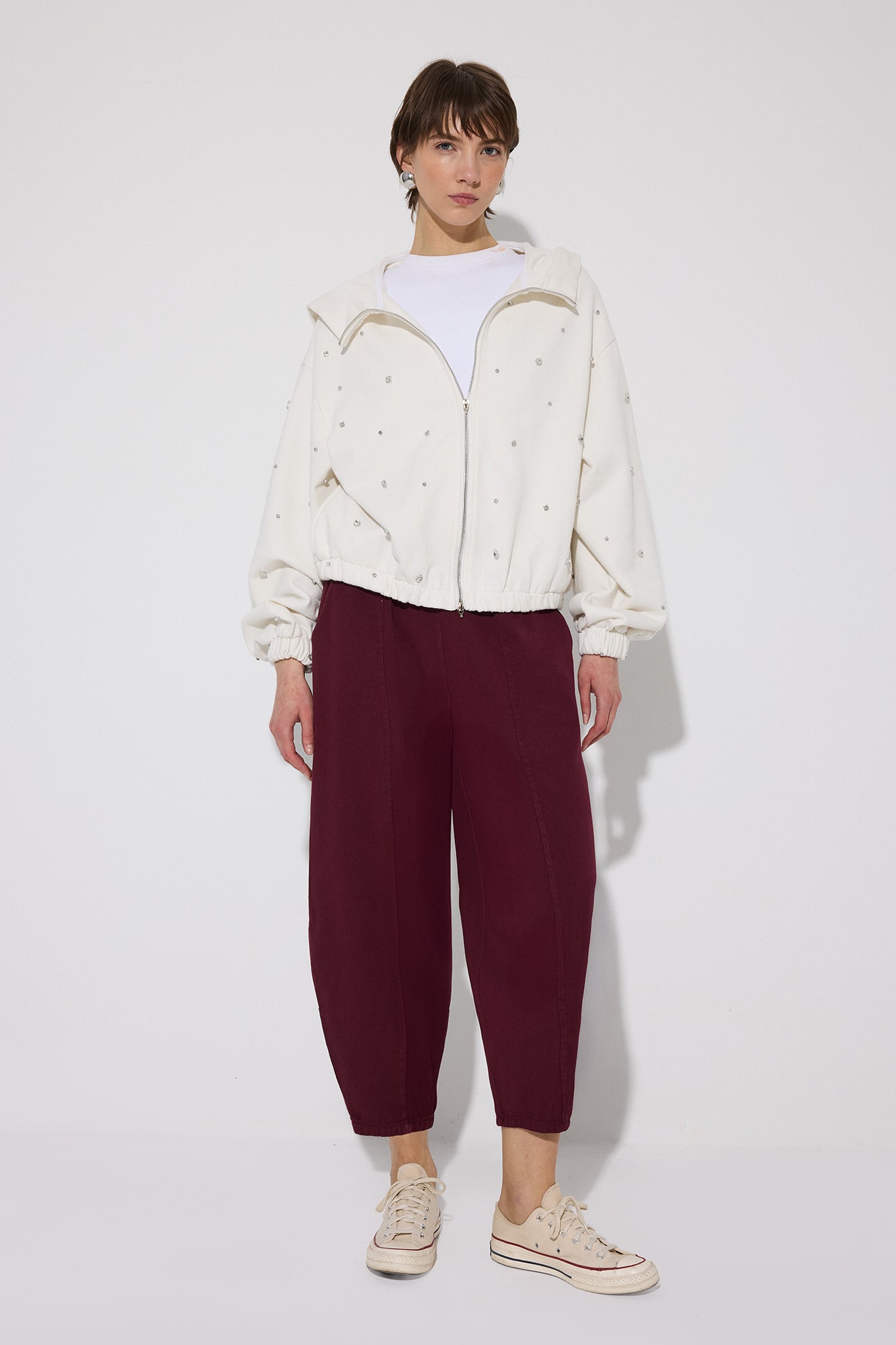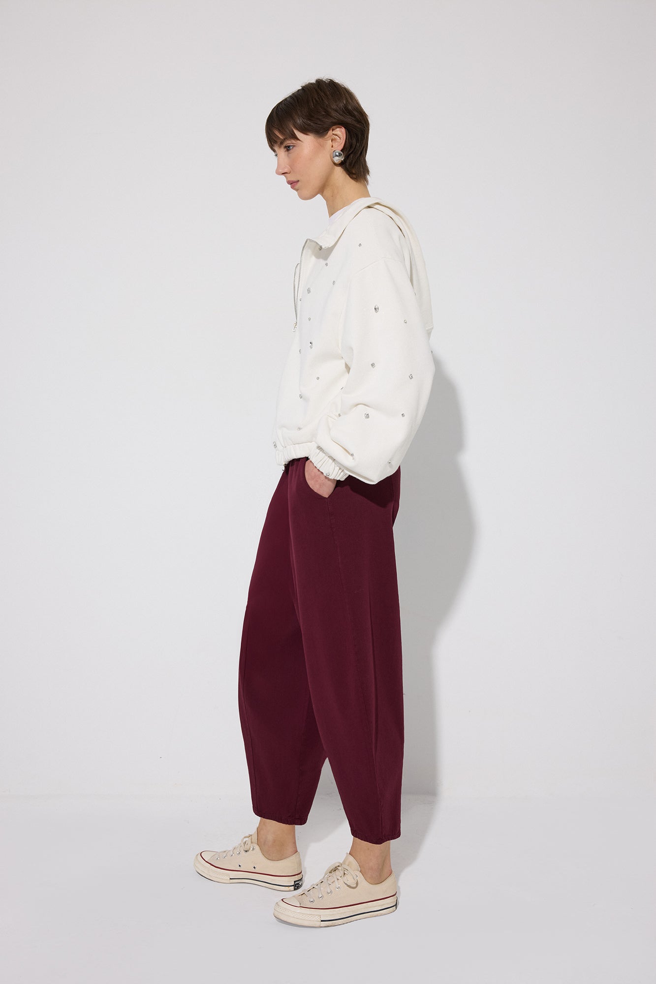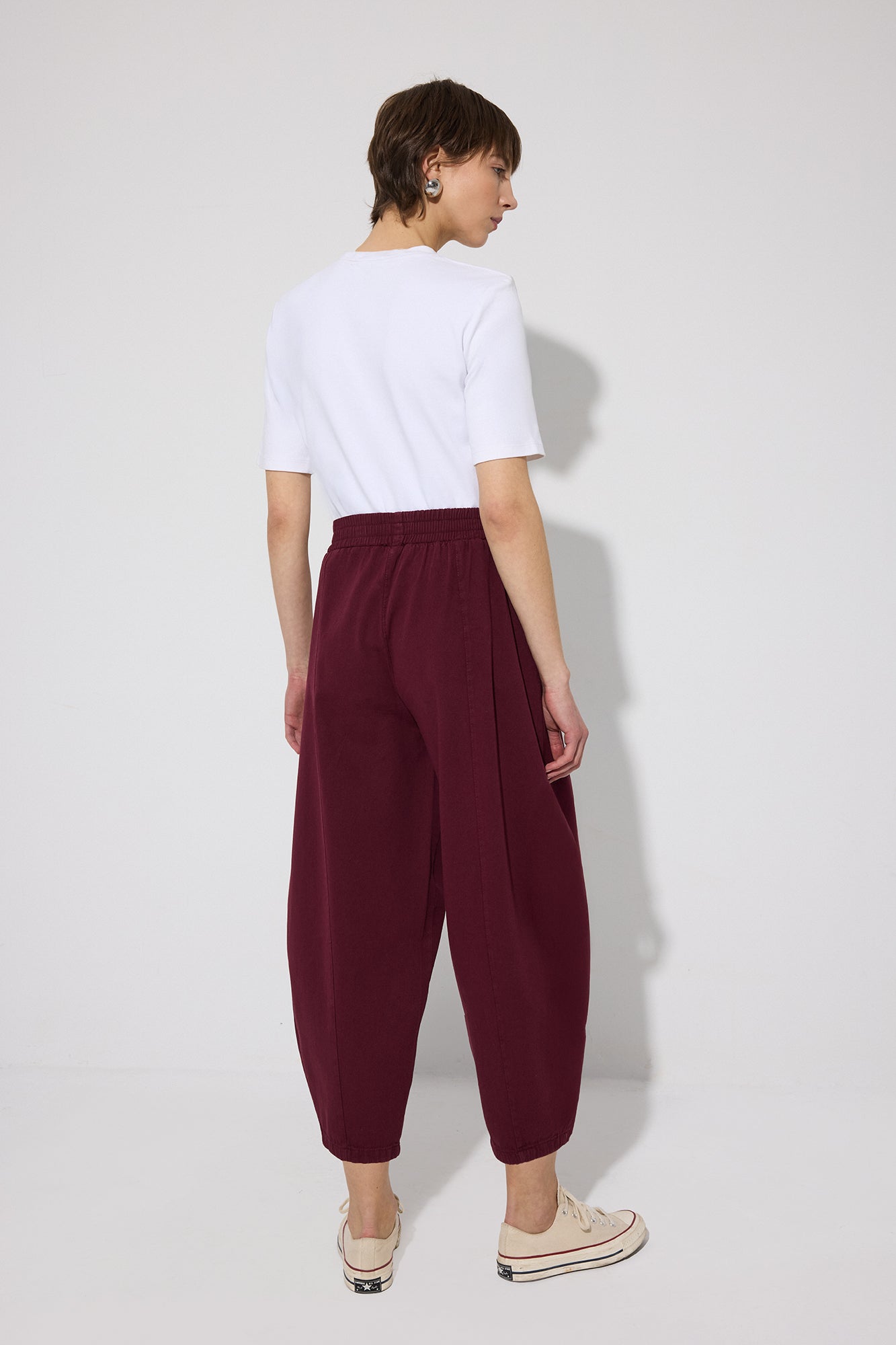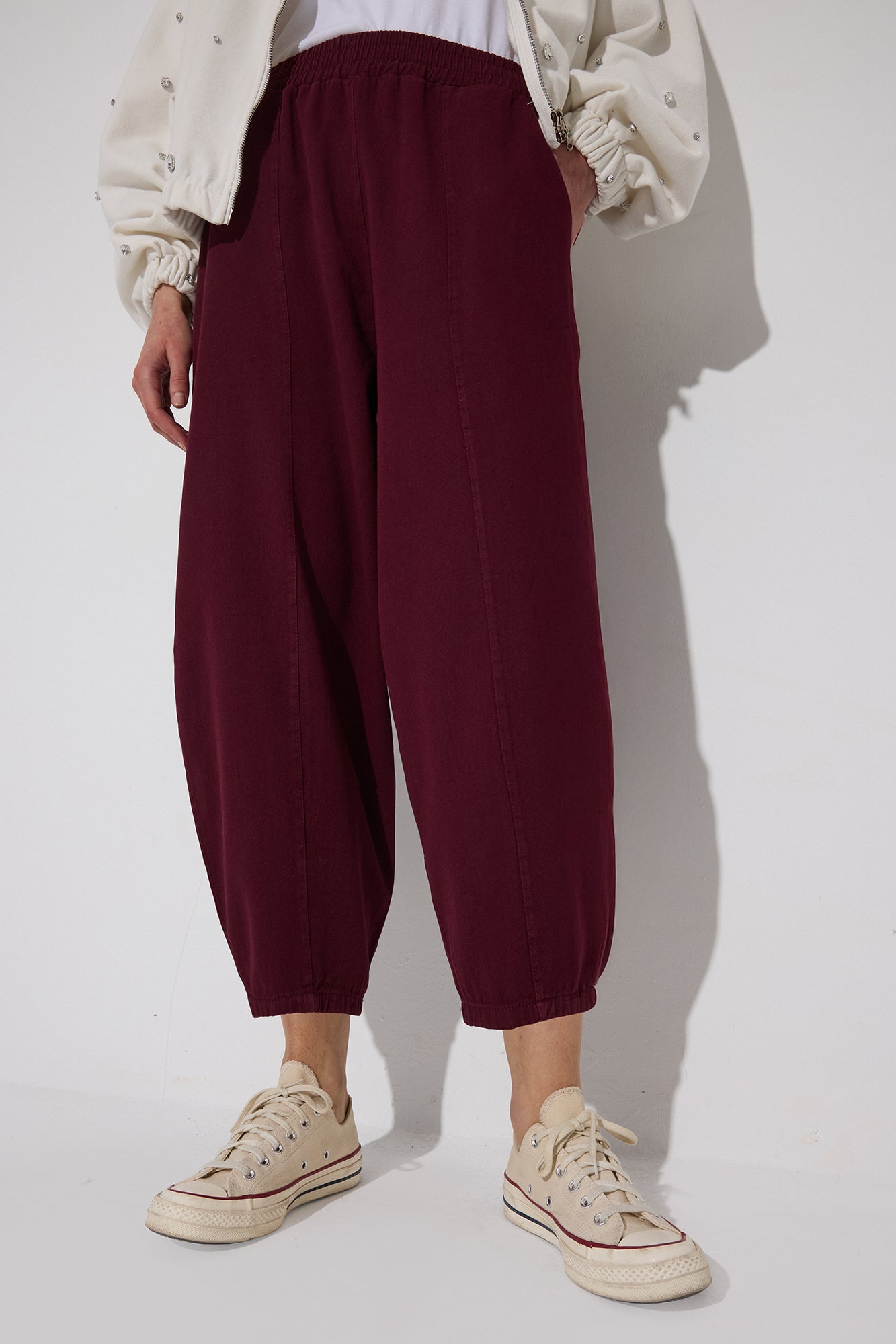Lastikli yüksek bel. Yan cepli. Balon pantolon.