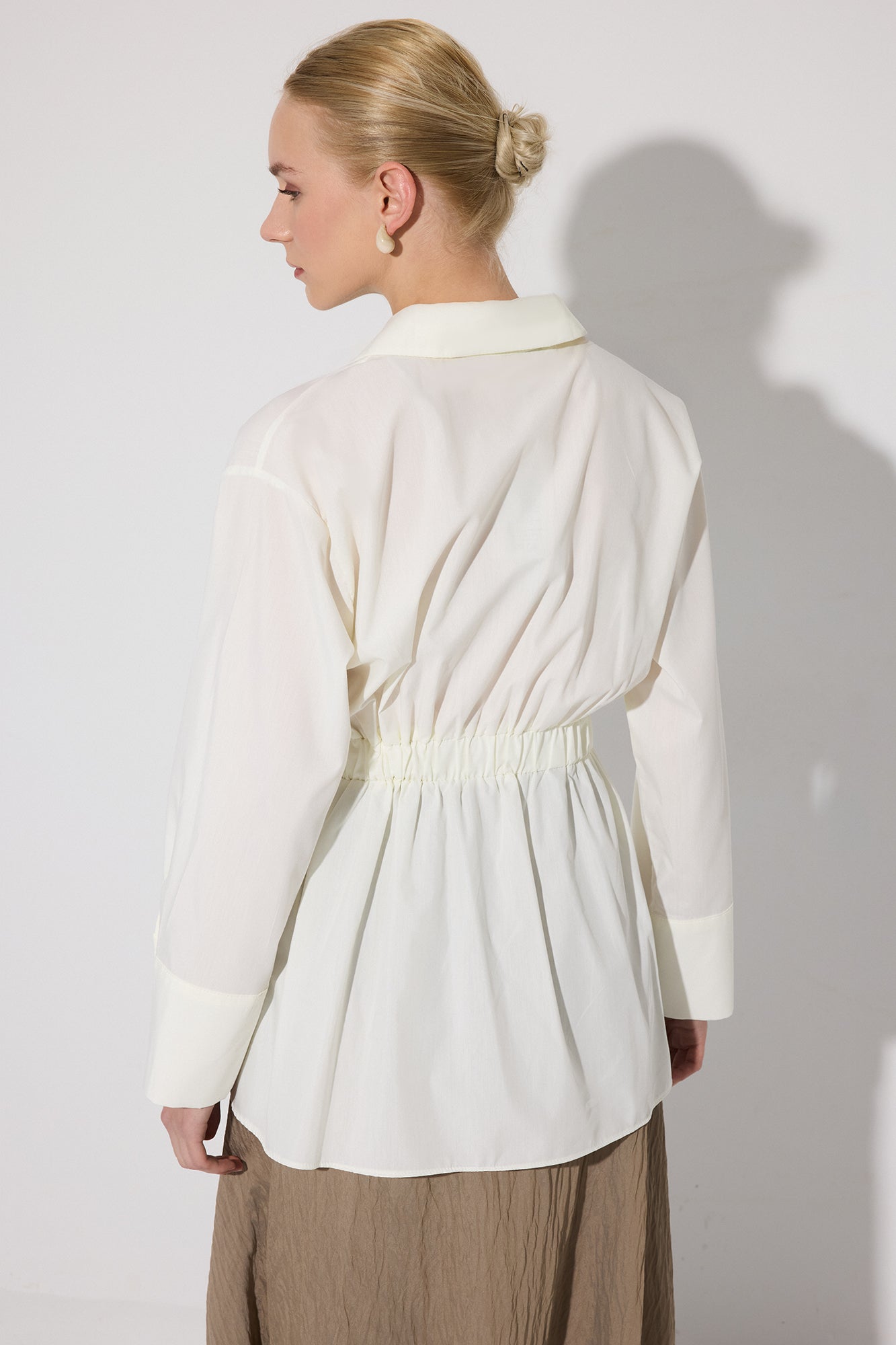 Gömlek yaka. Önü düğme kapamalı. Uzun manşetli kol. Bel kısmı büzgü ve drape detaylı.