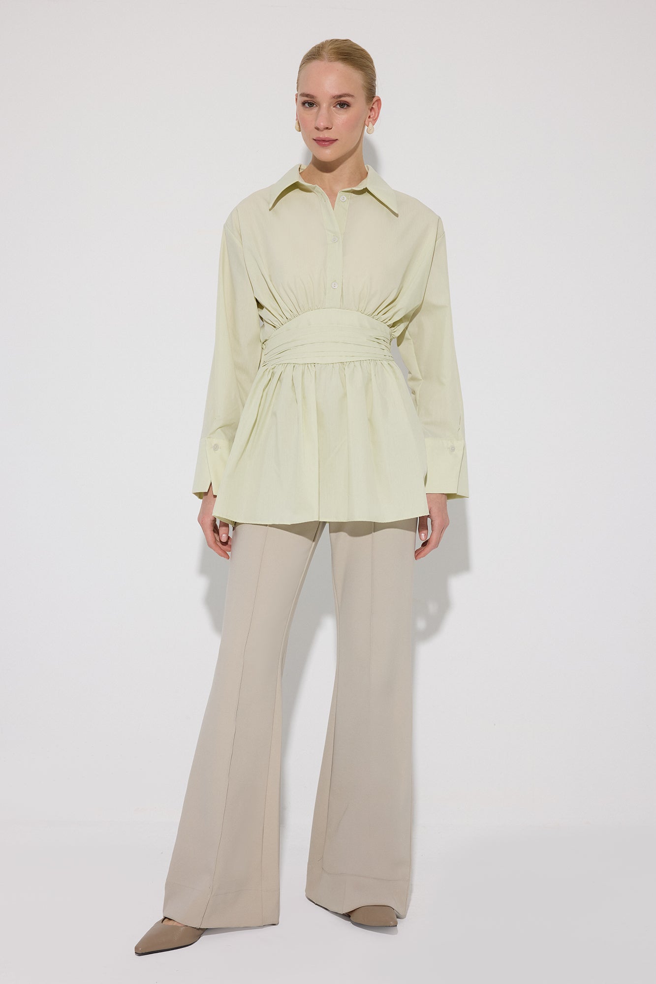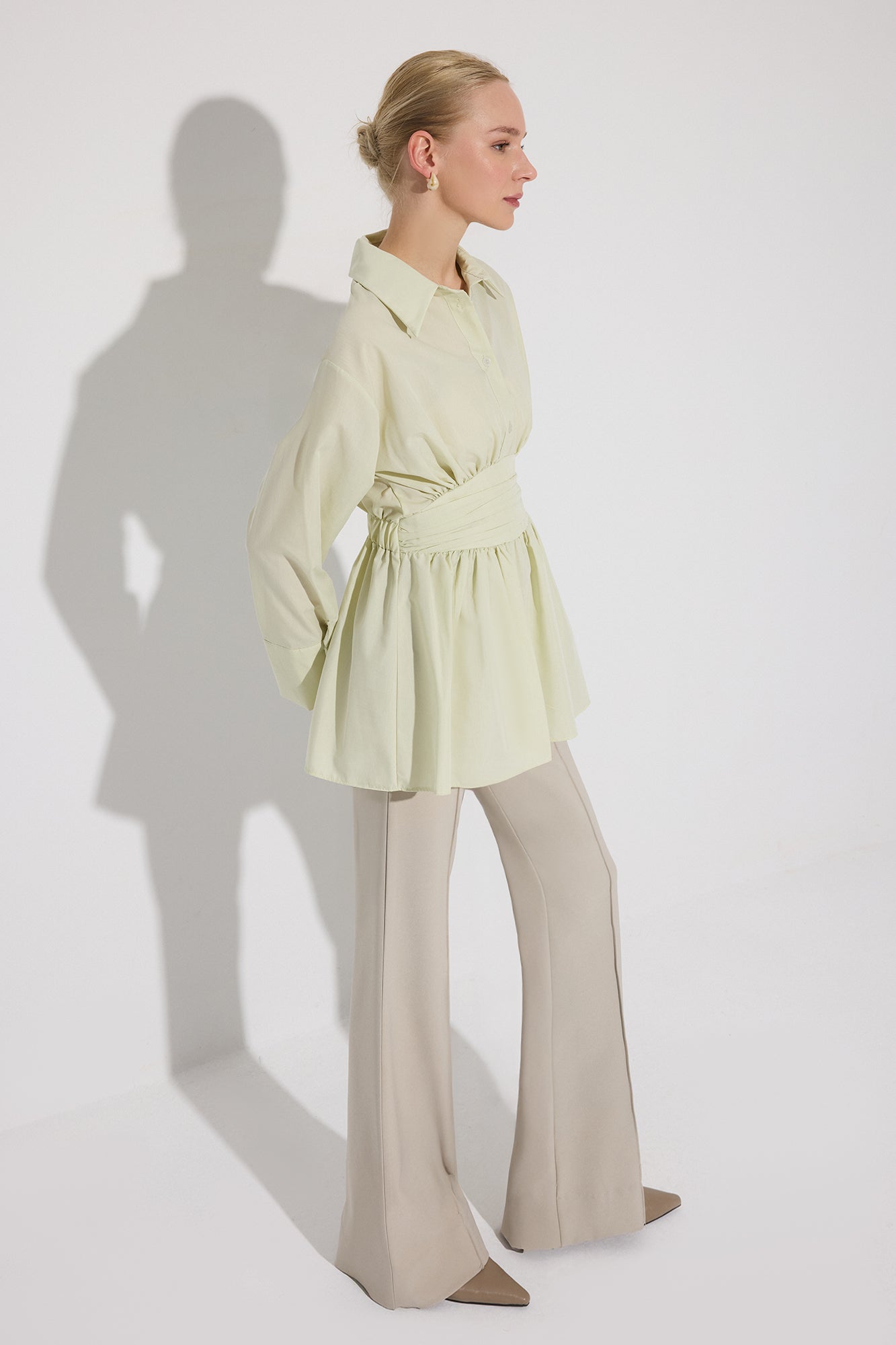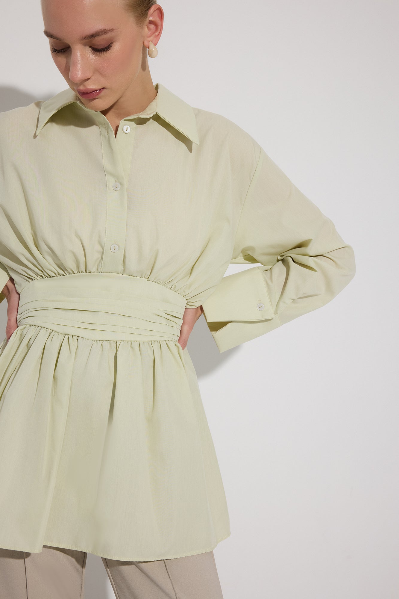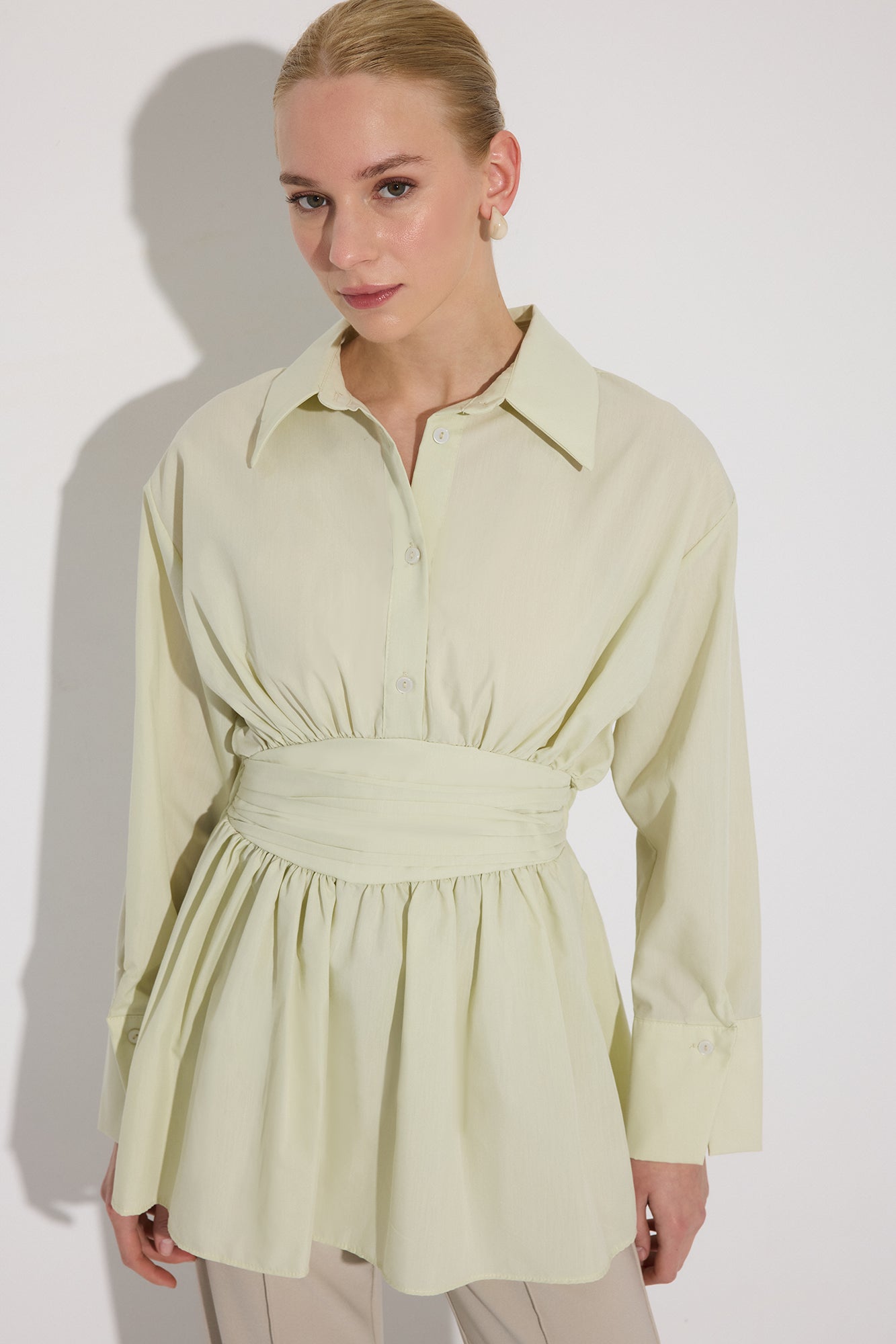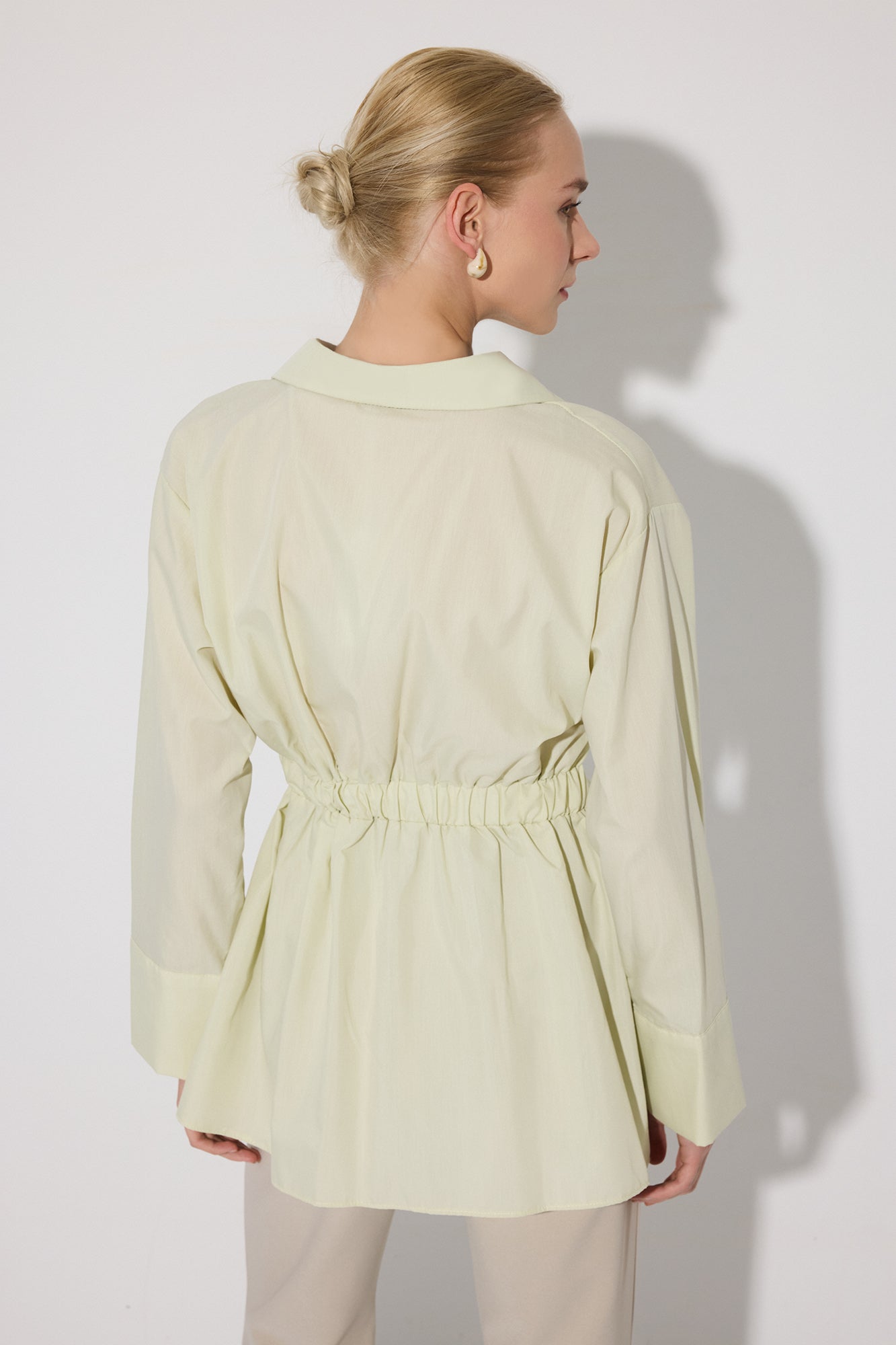 Gömlek yaka. Önü düğme kapamalı. Uzun manşetli kol. Bel kısmı büzgü ve drape detaylı.