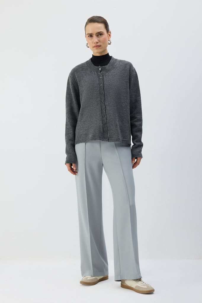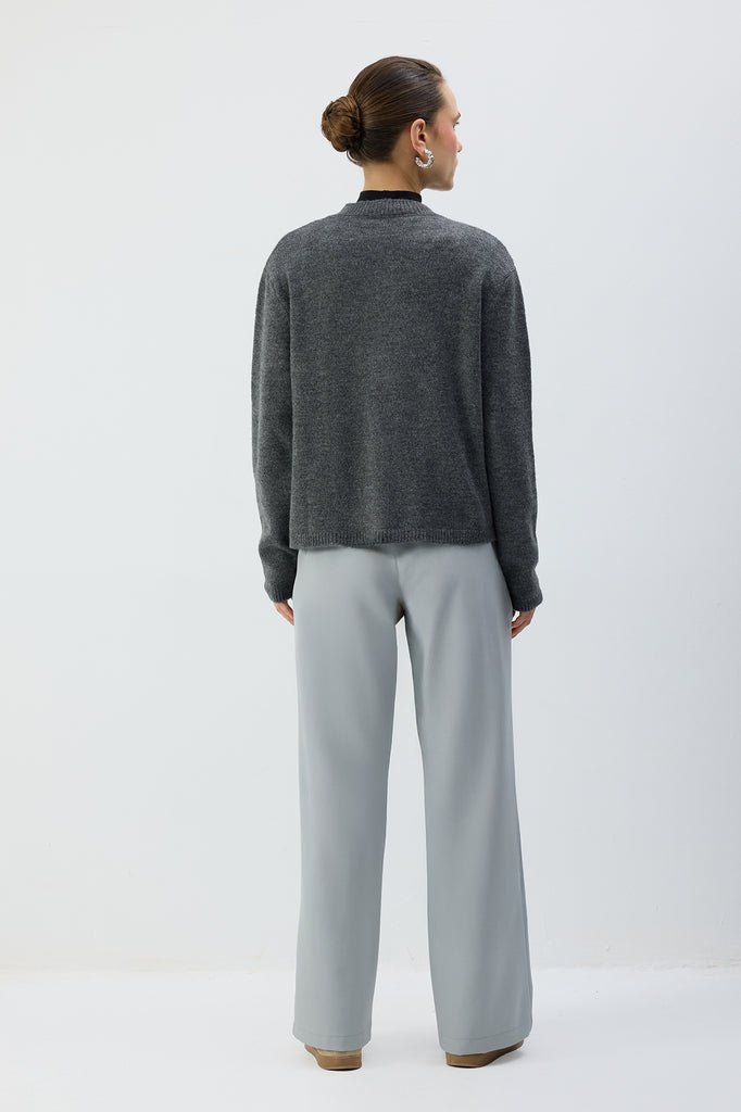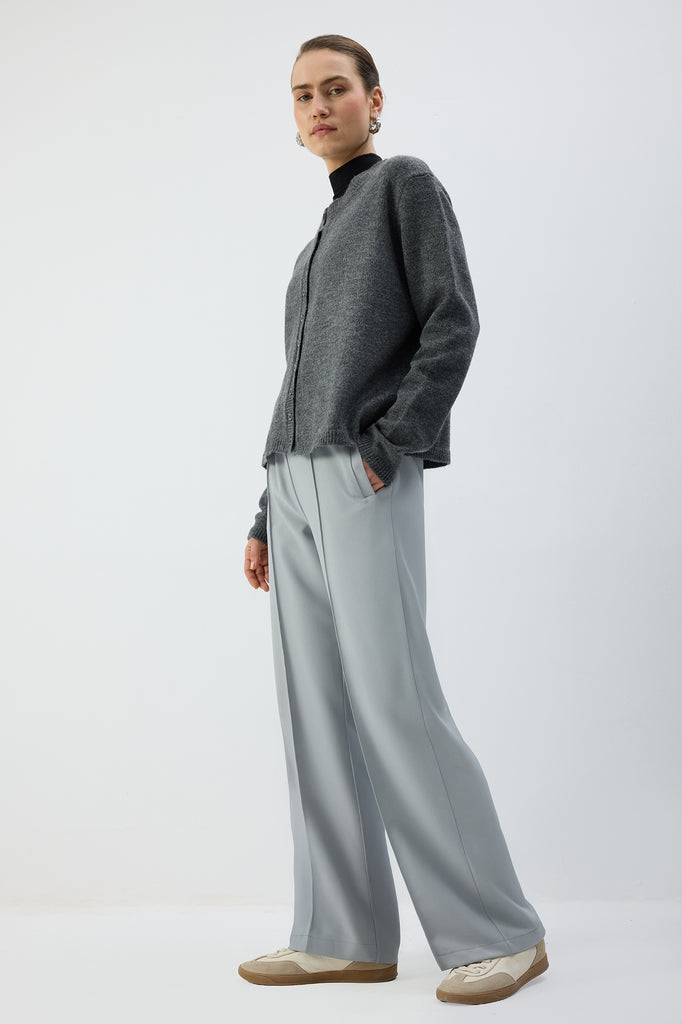Lastikli bel, düz kesim, yan cepli pantolon.