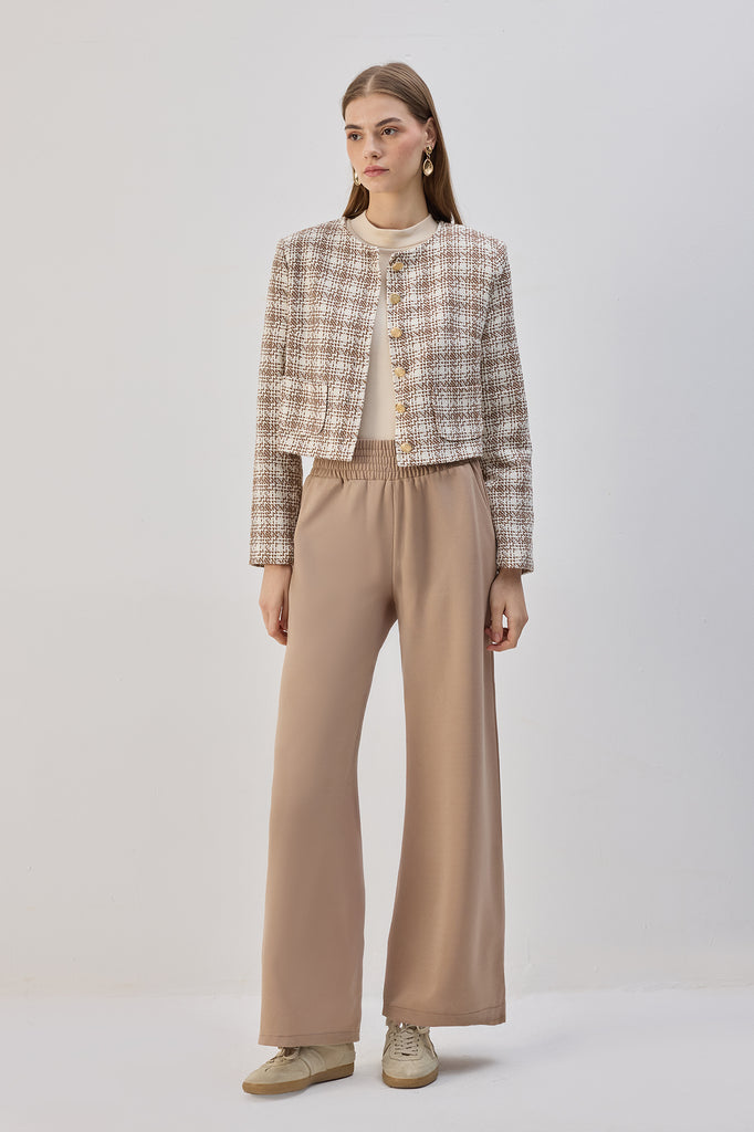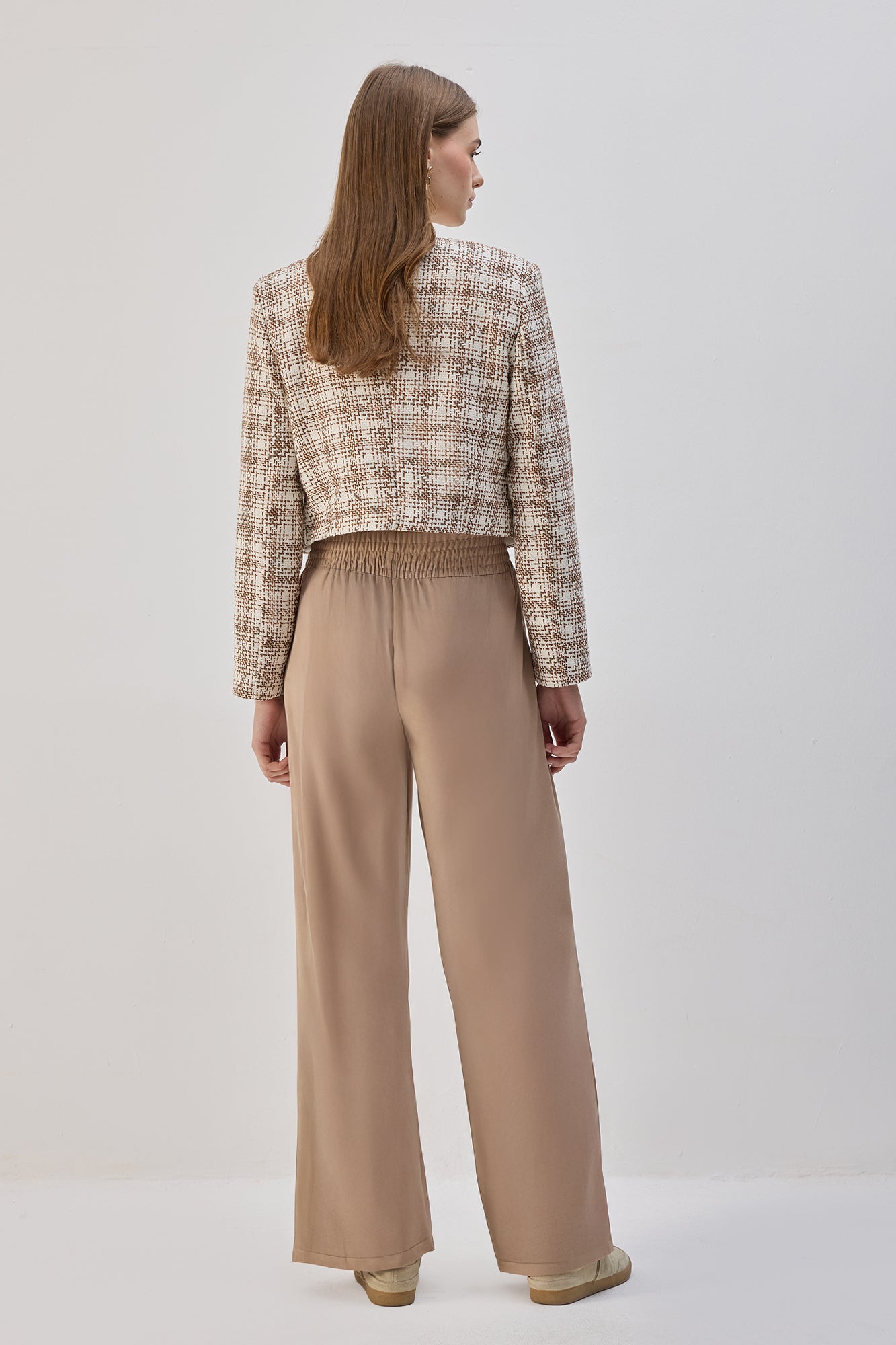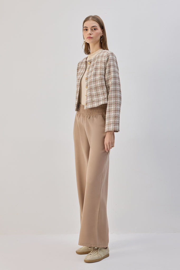 Yüksek belli, geniş paça, esnek pantolon.