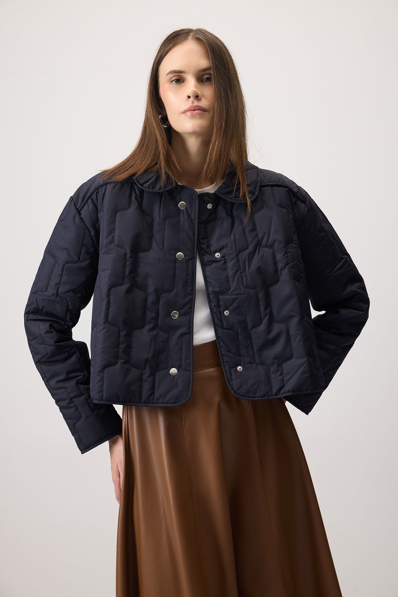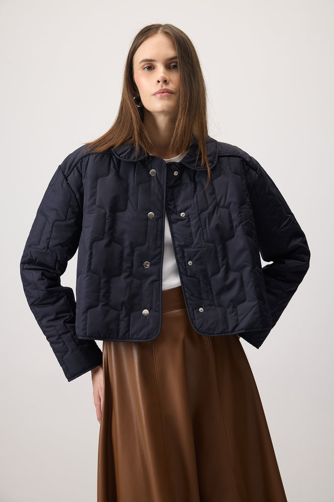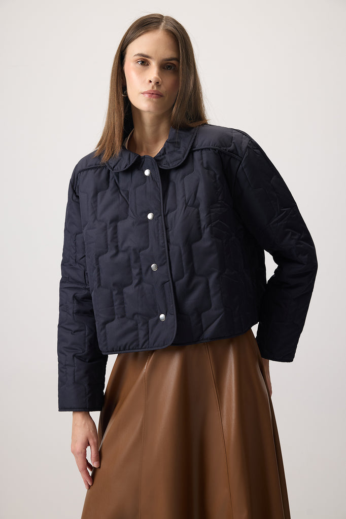 Kısa kesim, kapitone dokulu, çıtçıt kapamalı ceket.