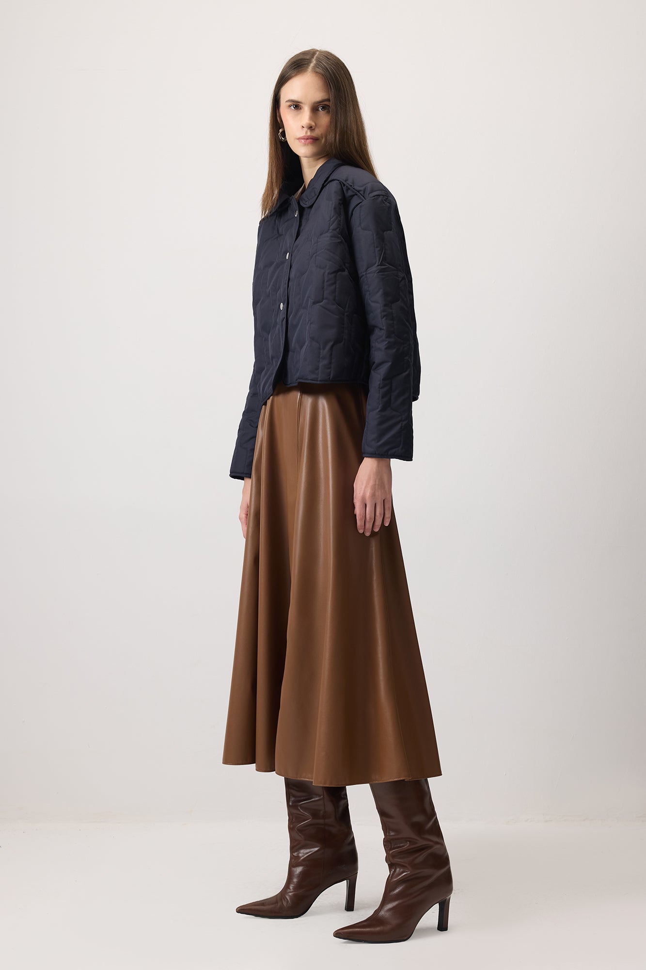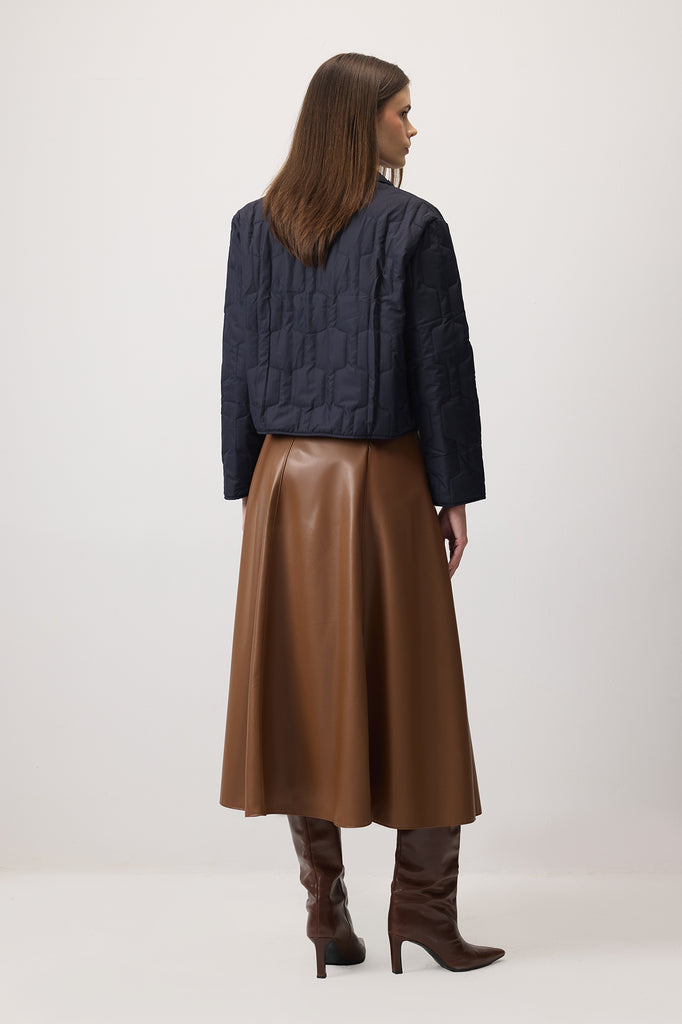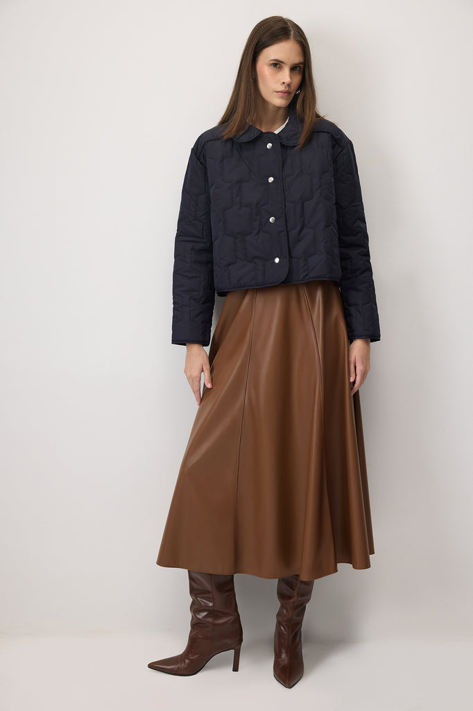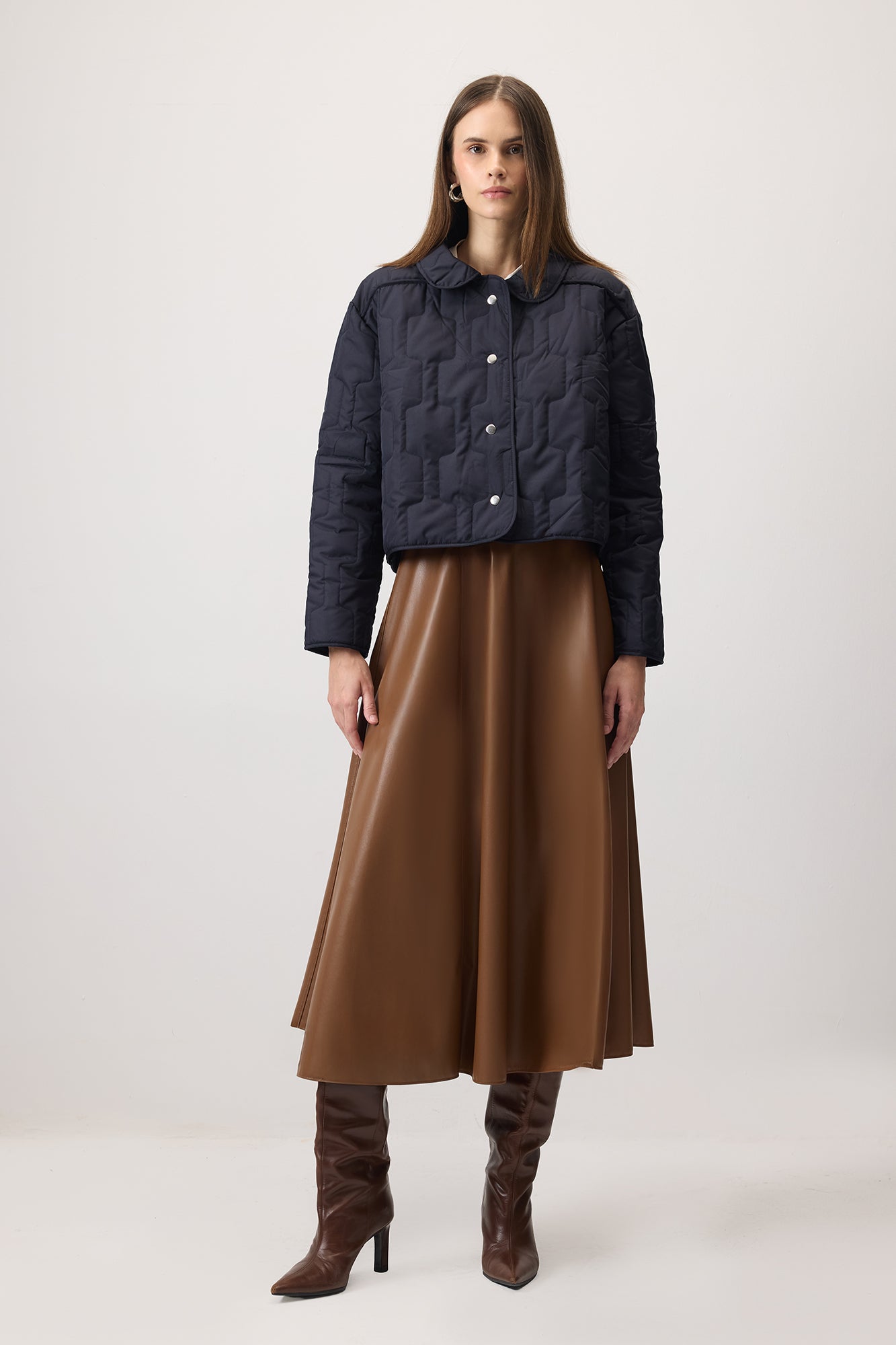 Kısa kesim, kapitone dokulu, çıtçıt kapamalı ceket.