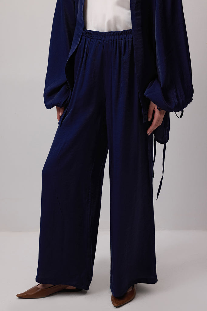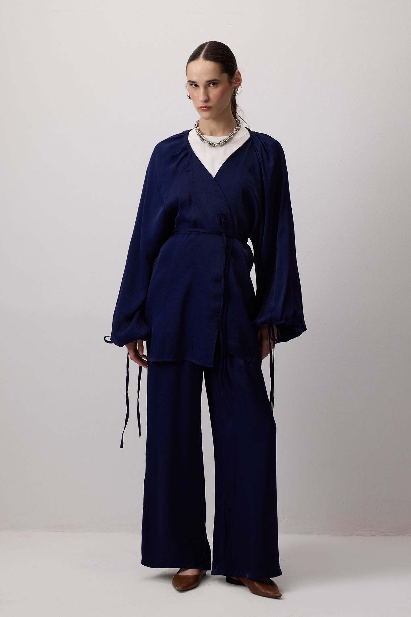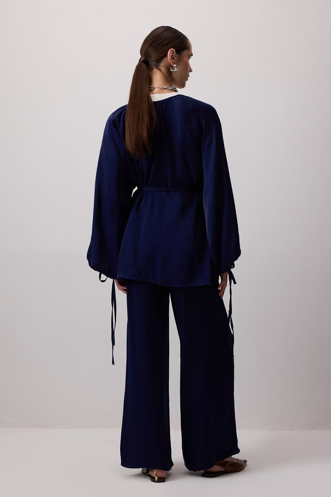 V yaka. Uzun kollu. Elastik ve bağlama detaylı manşet. Kruvaze kapamalı, bağlama detaylı. Uzun boy. Elastik bel. Bol paça. Pantolon.