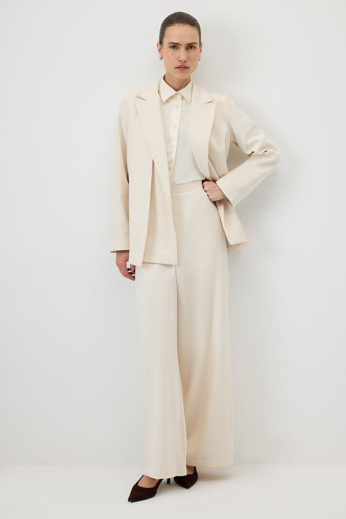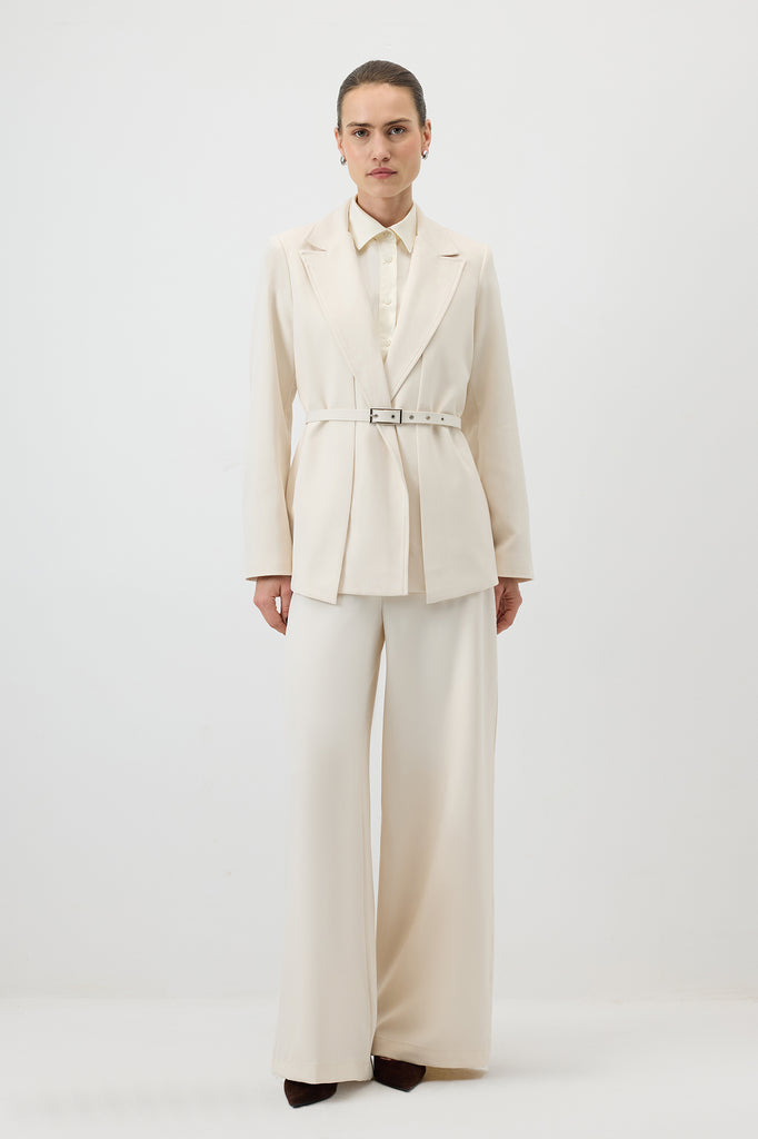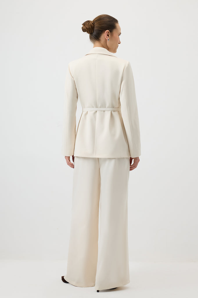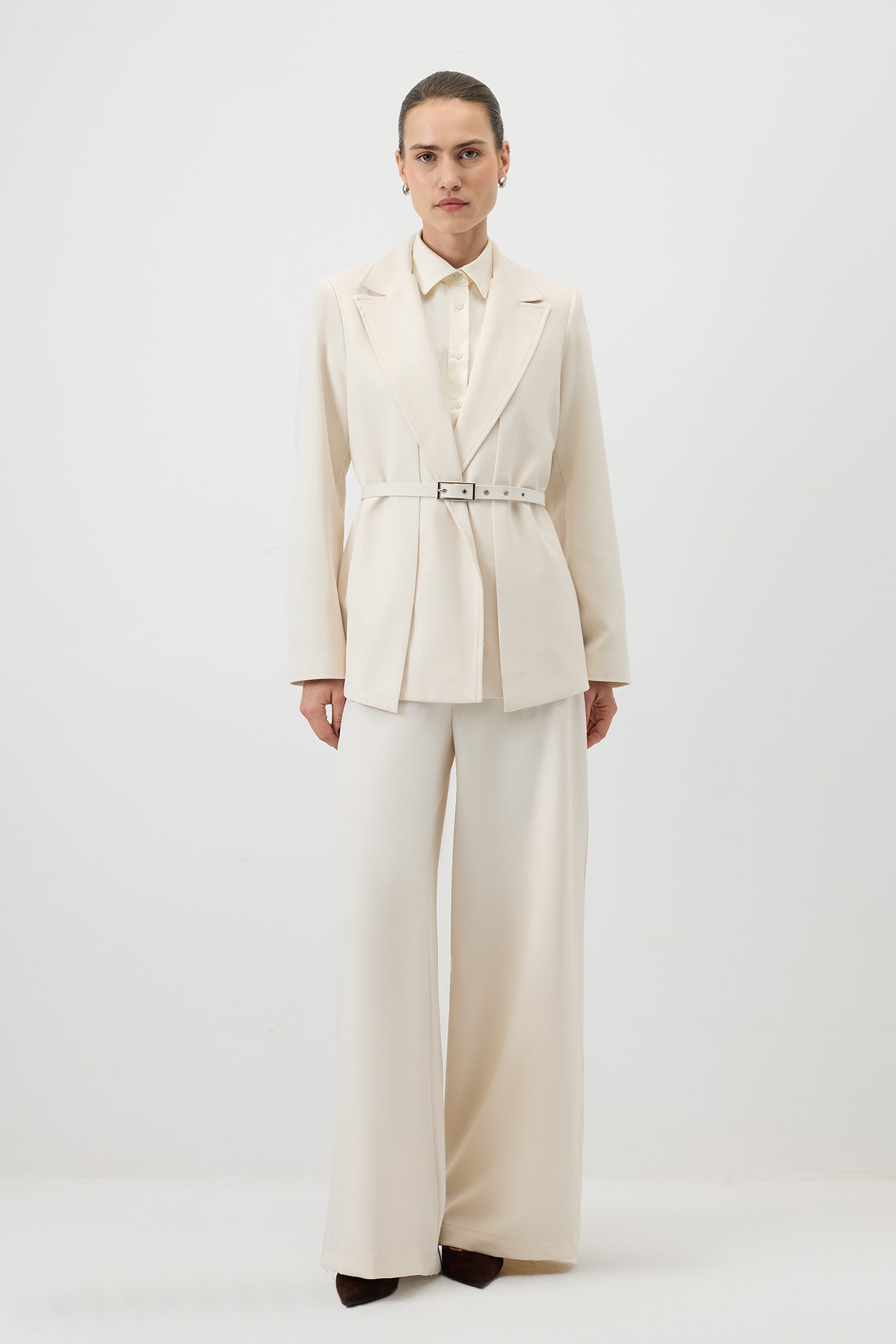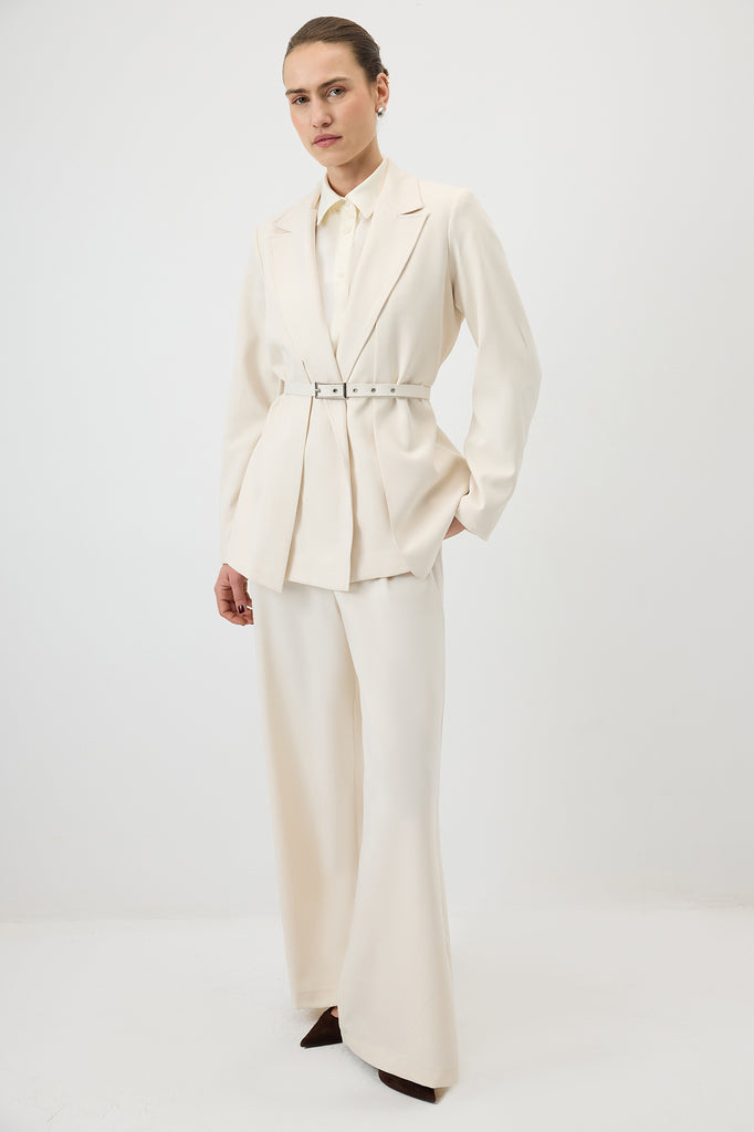 Kemerli blazer ceket ve geniş paça pantolon takım. Astarlı. Düz kesim.