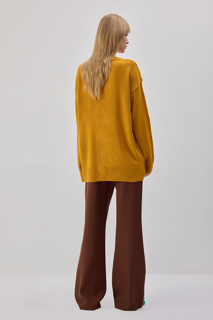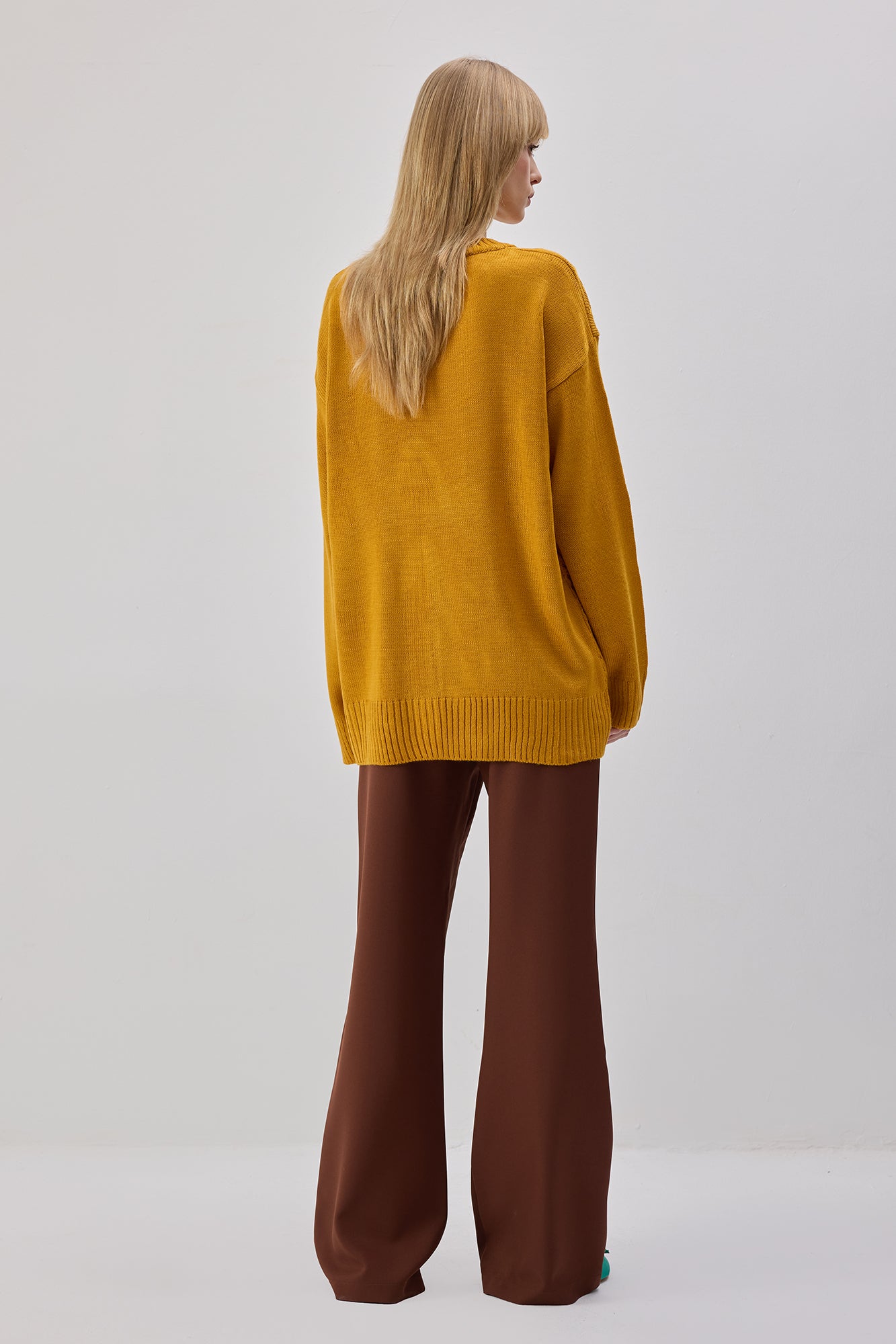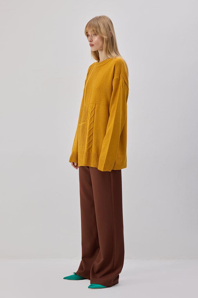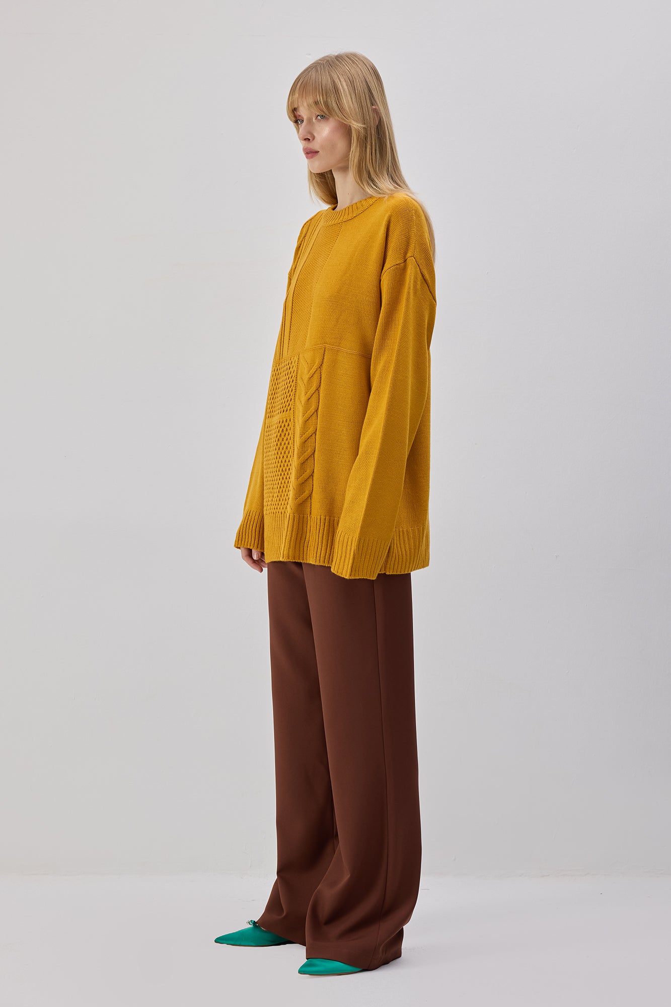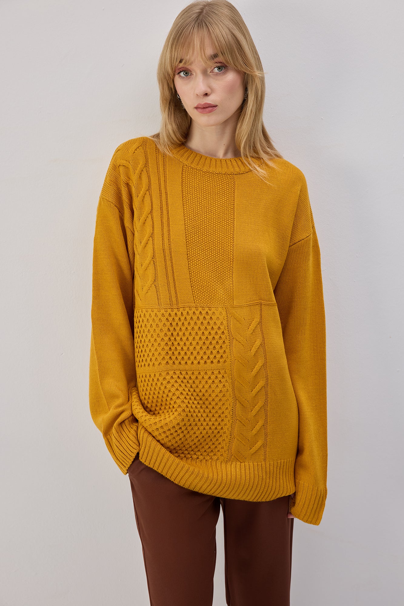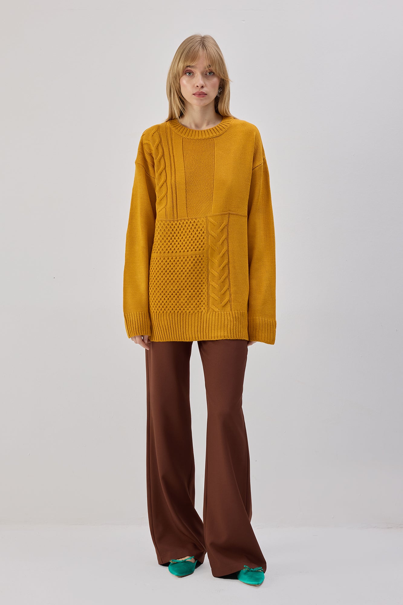 Blok desenli triko kazak. Uzun kollu. Düşük omuzlu. Yuvarlak yakalı. Oversize.
