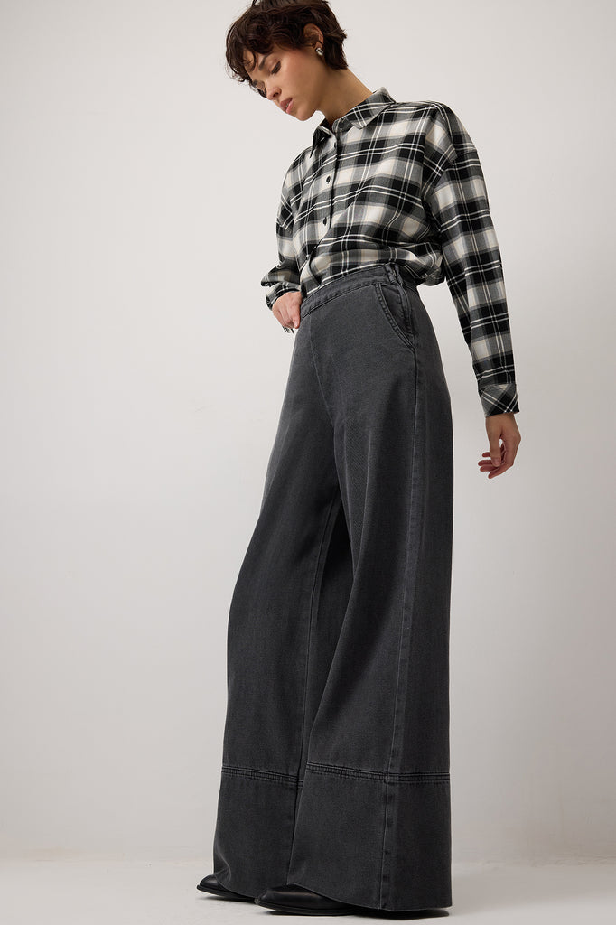 Yüksek bel. Yandan fermuar kapama. Bol paça.