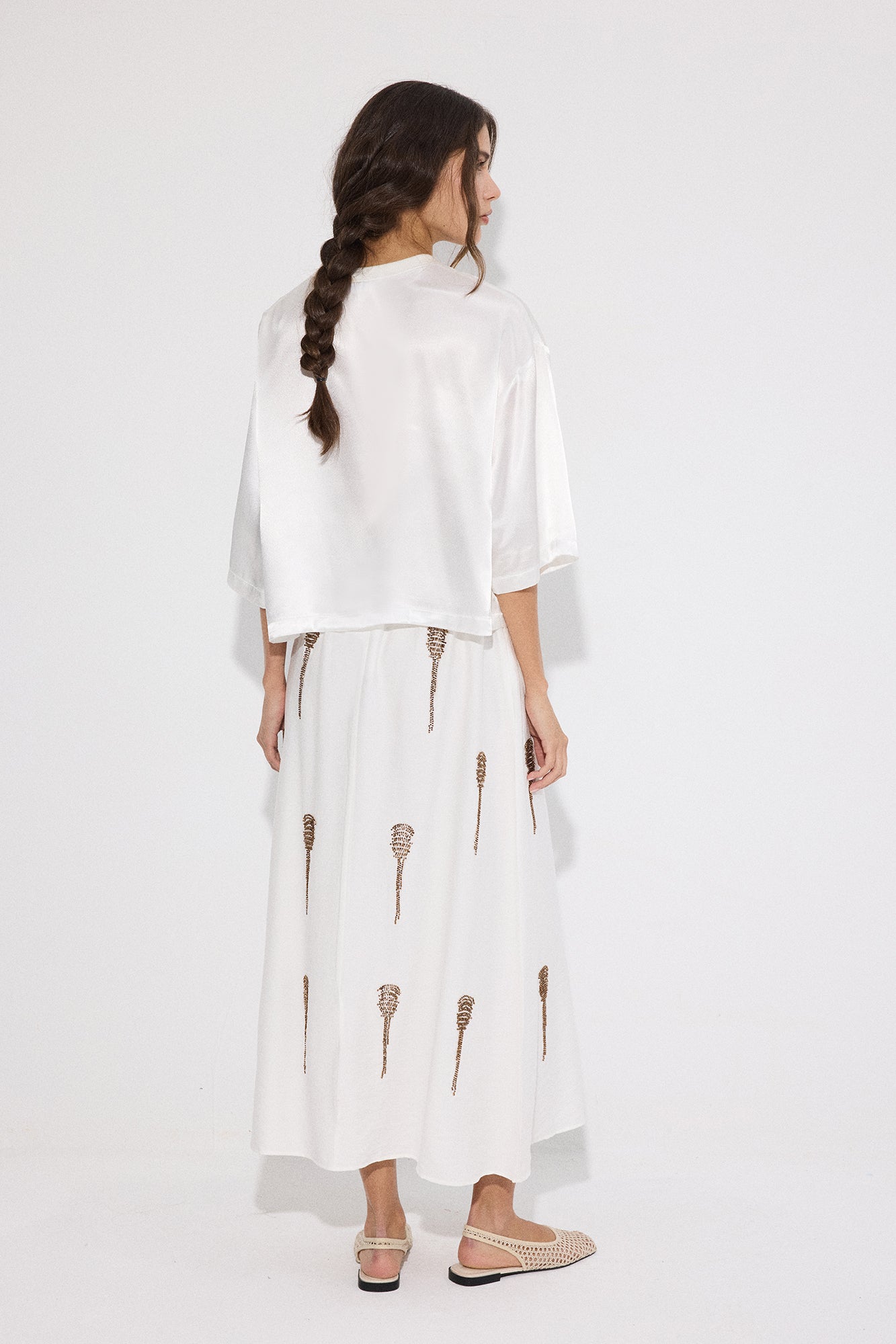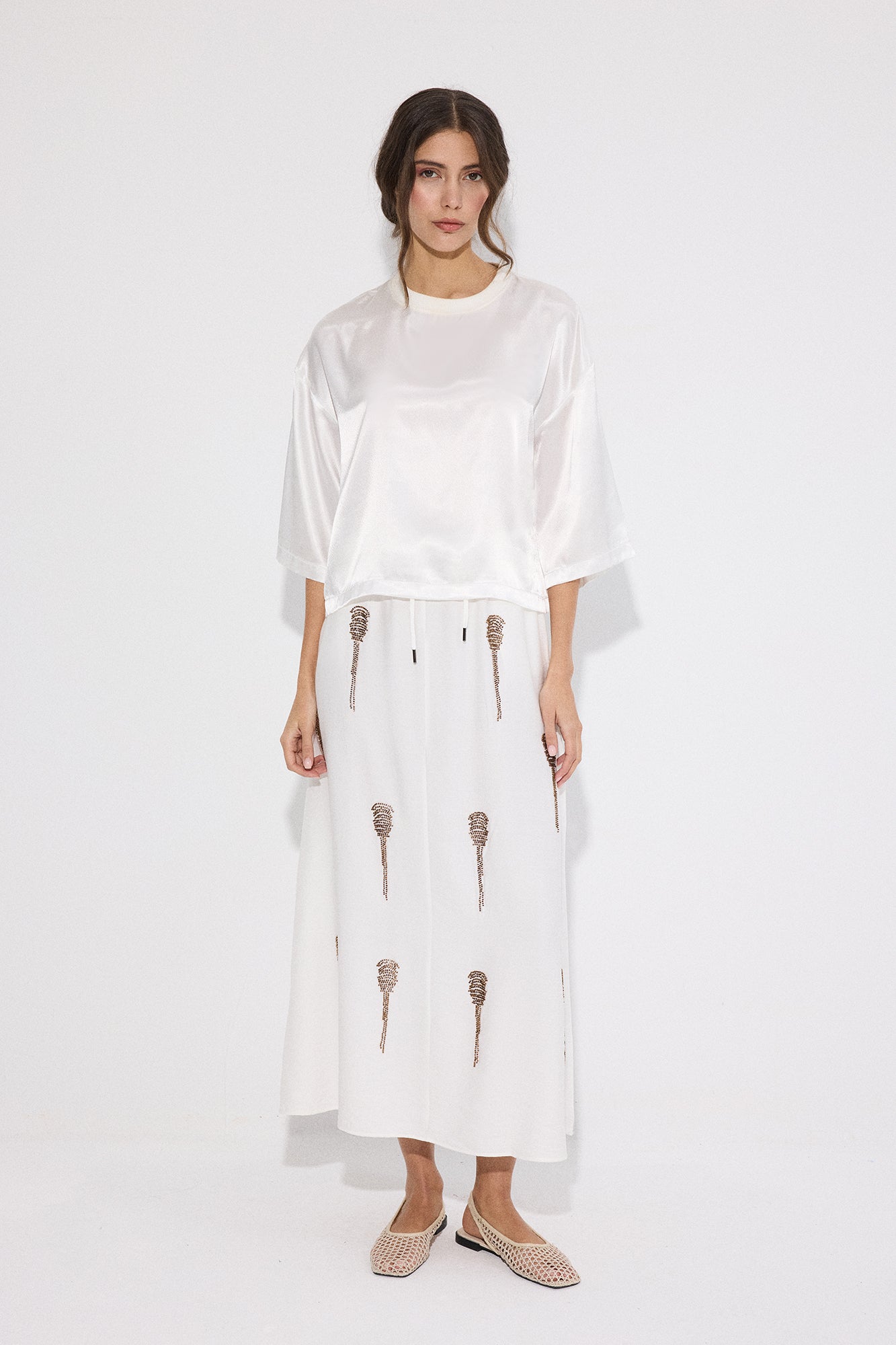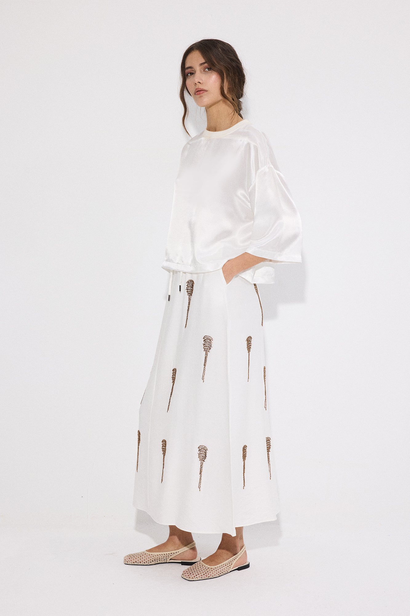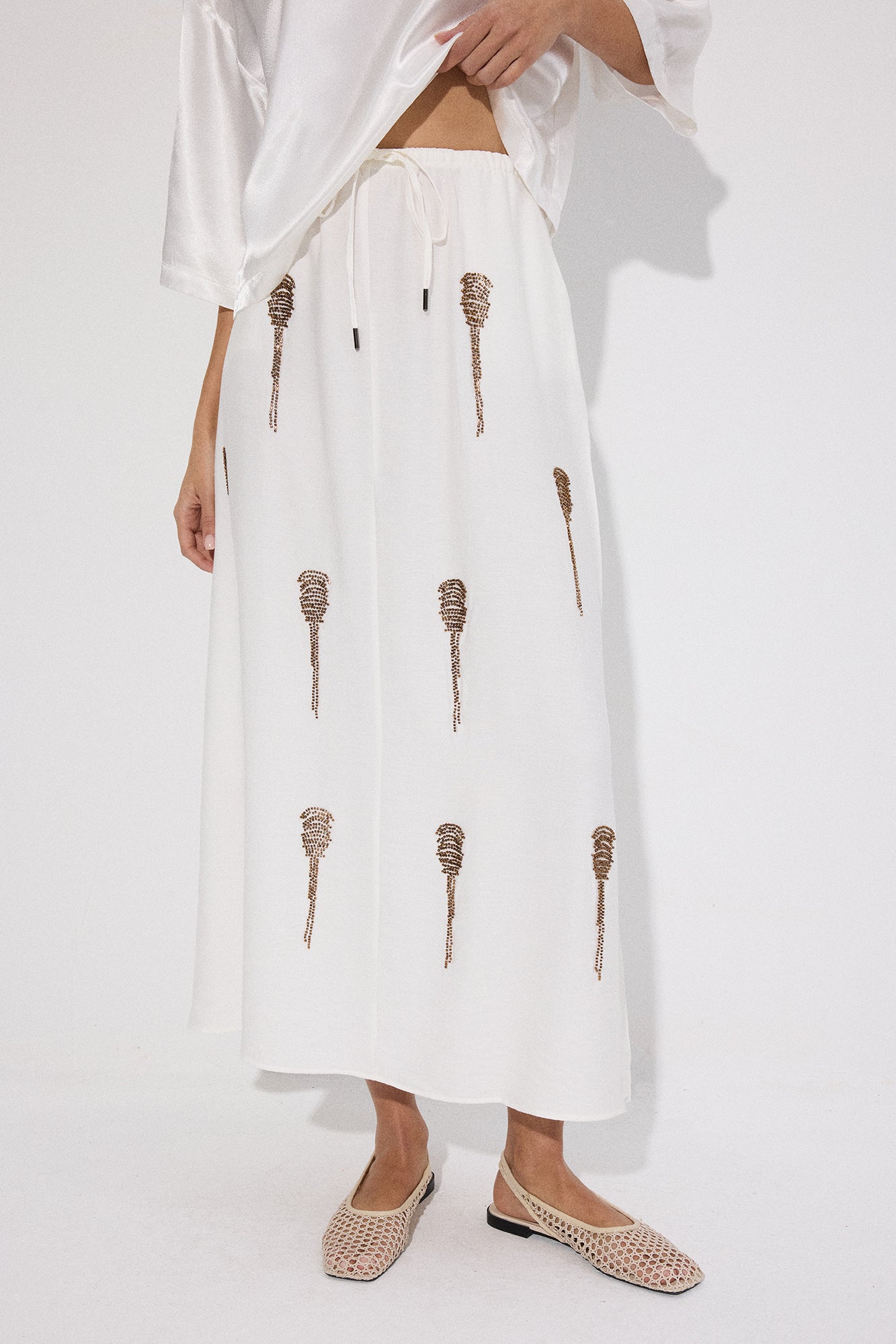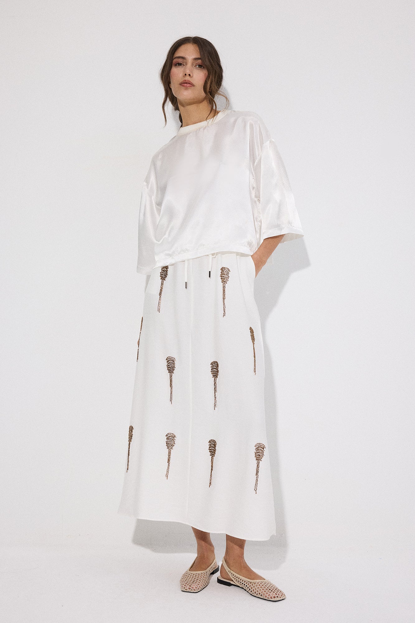 Lastikli yüksek bel. Midi boy. Yan cepli. Boncuk işlemeli.