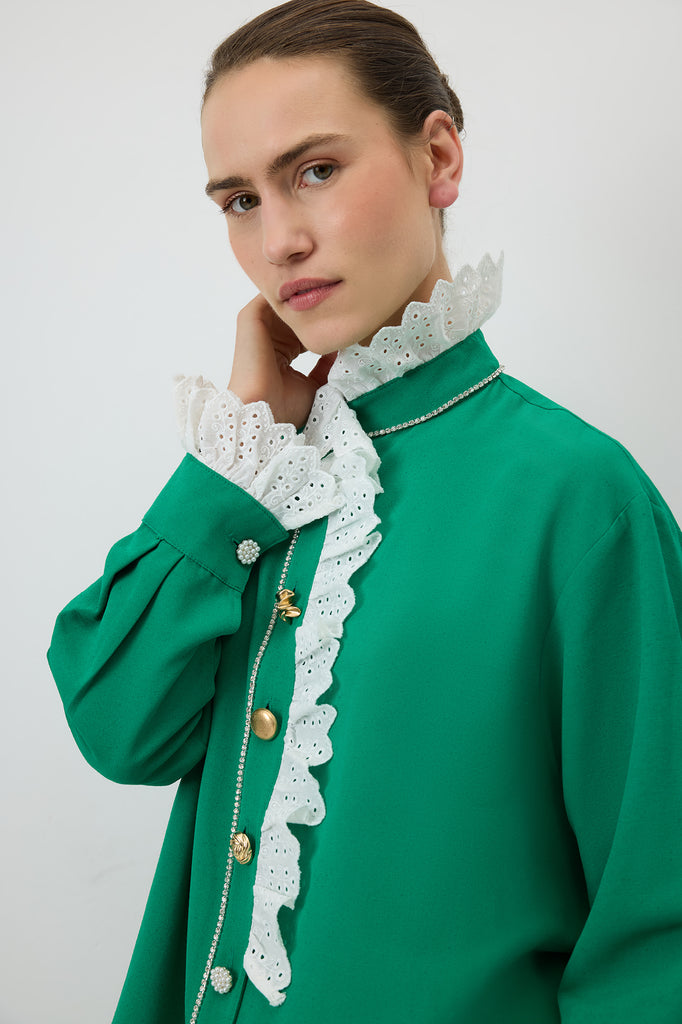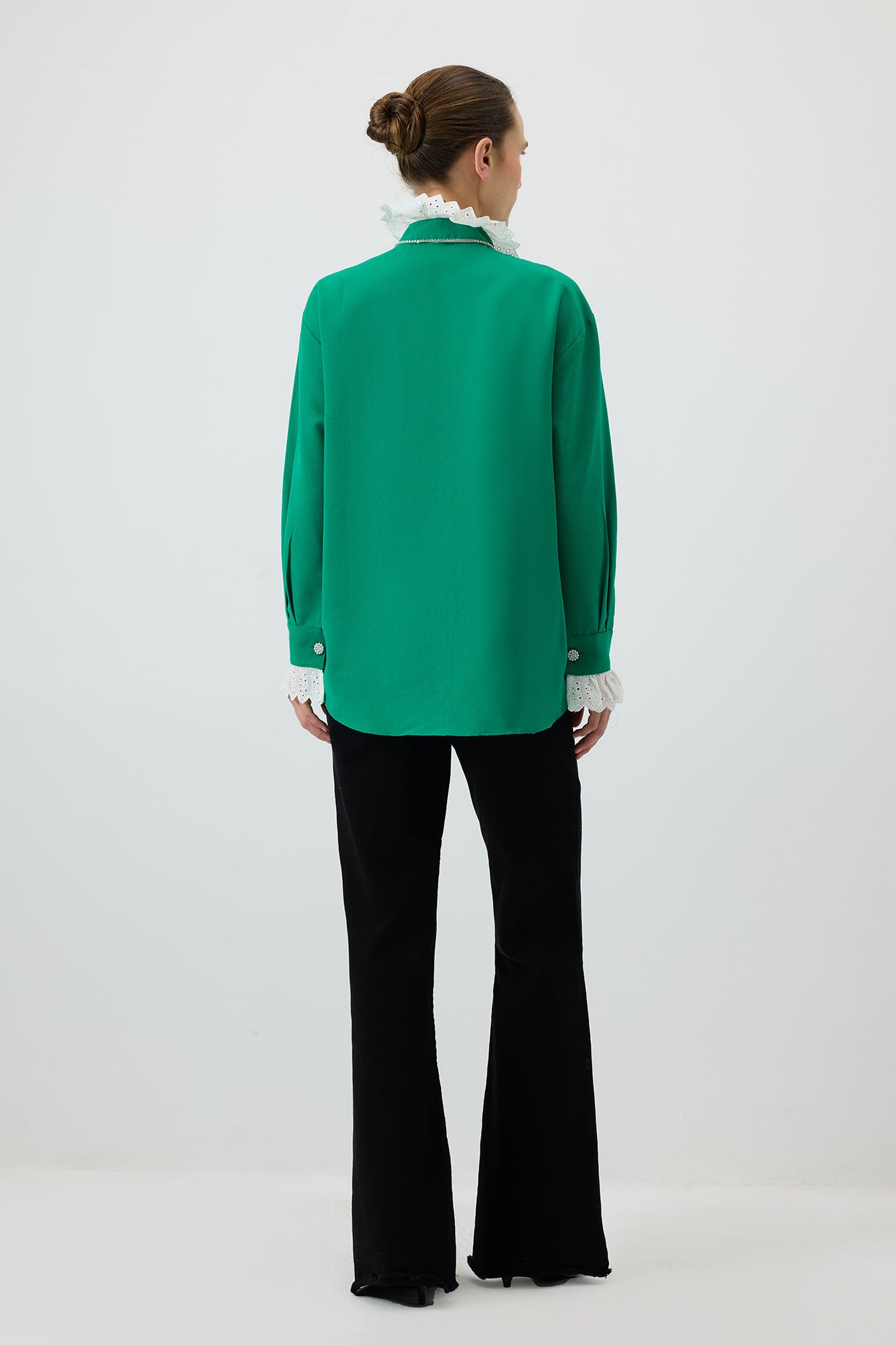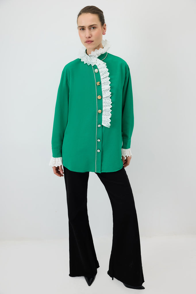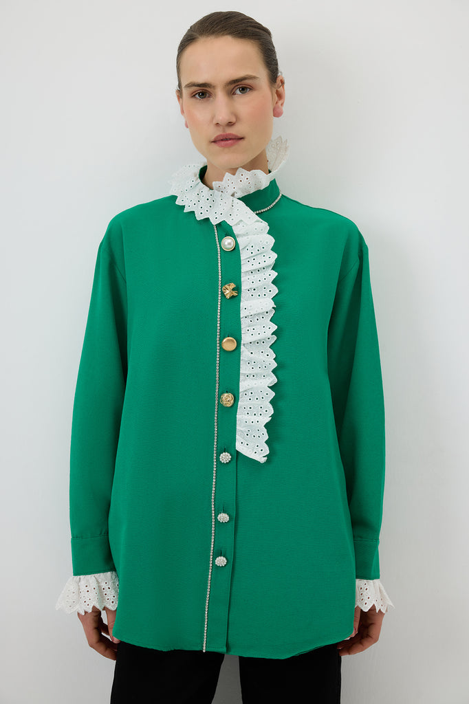 Fırfır detaylı gömlek. Brode yakalı. İnci ve metal düğmeli. Uzun kollu.