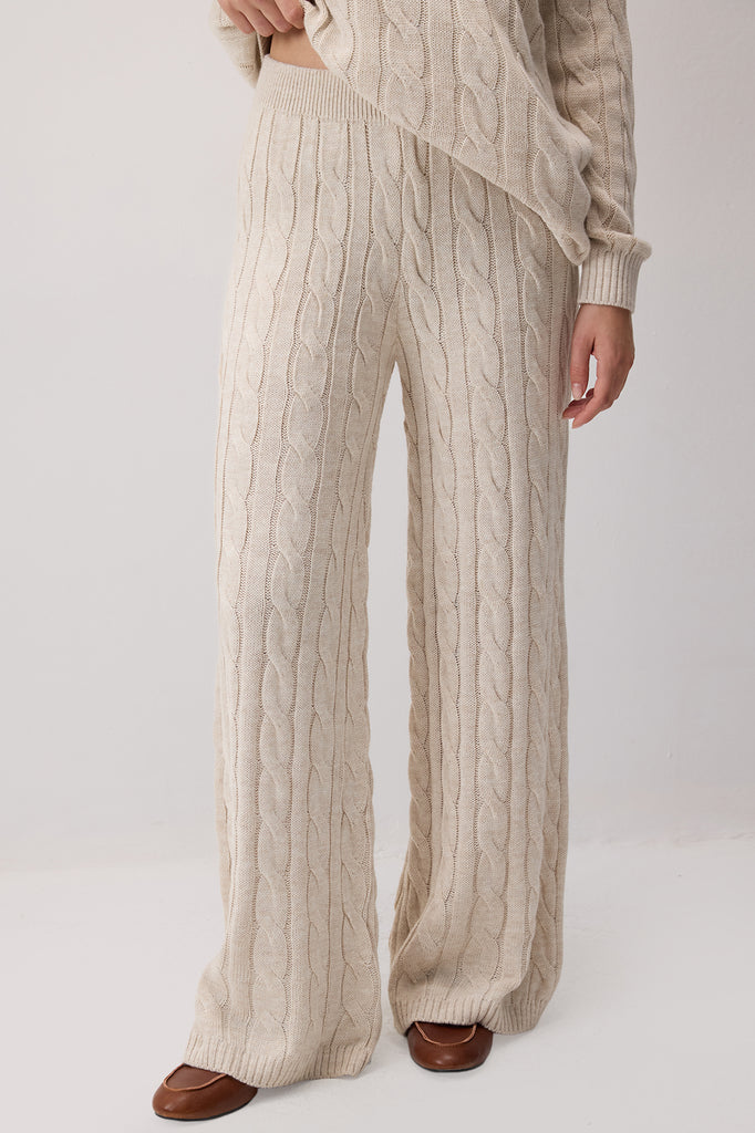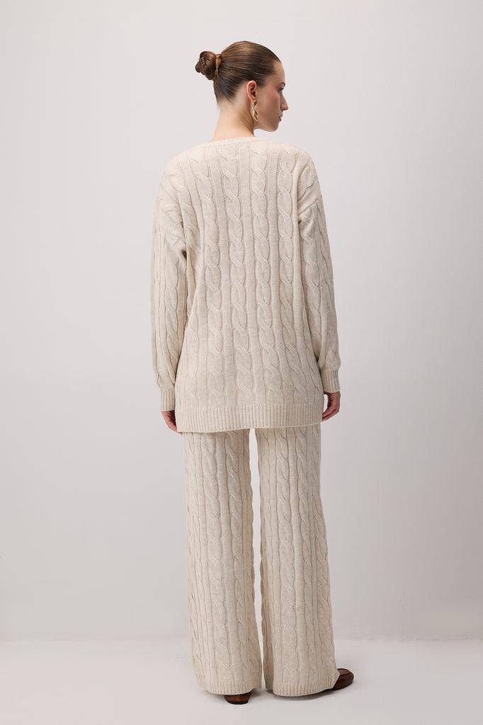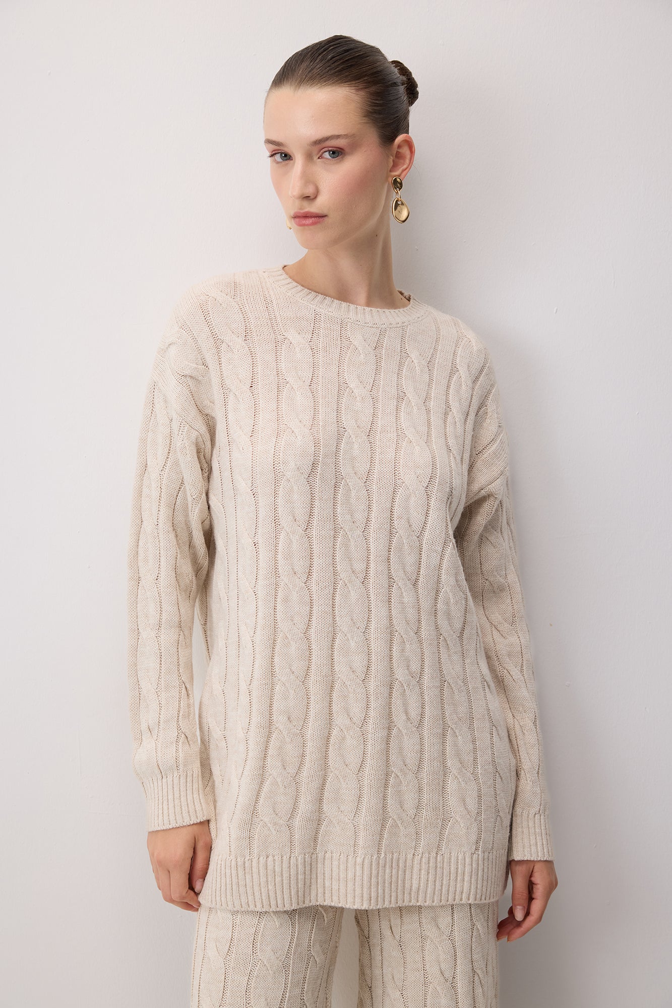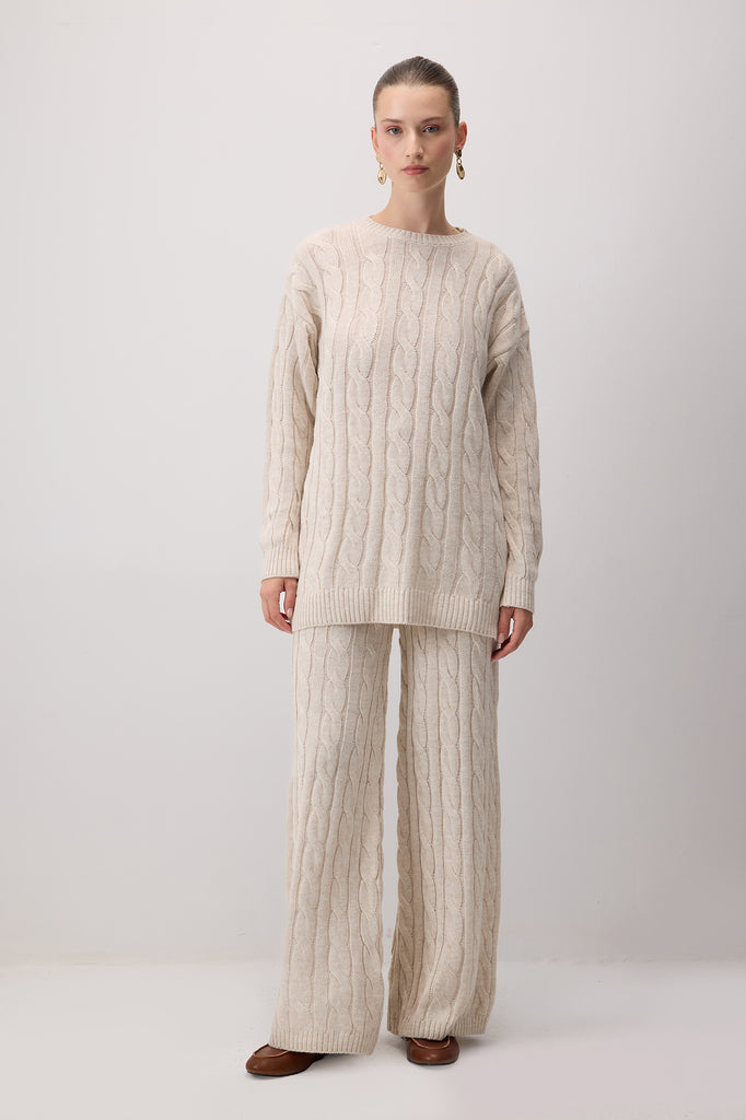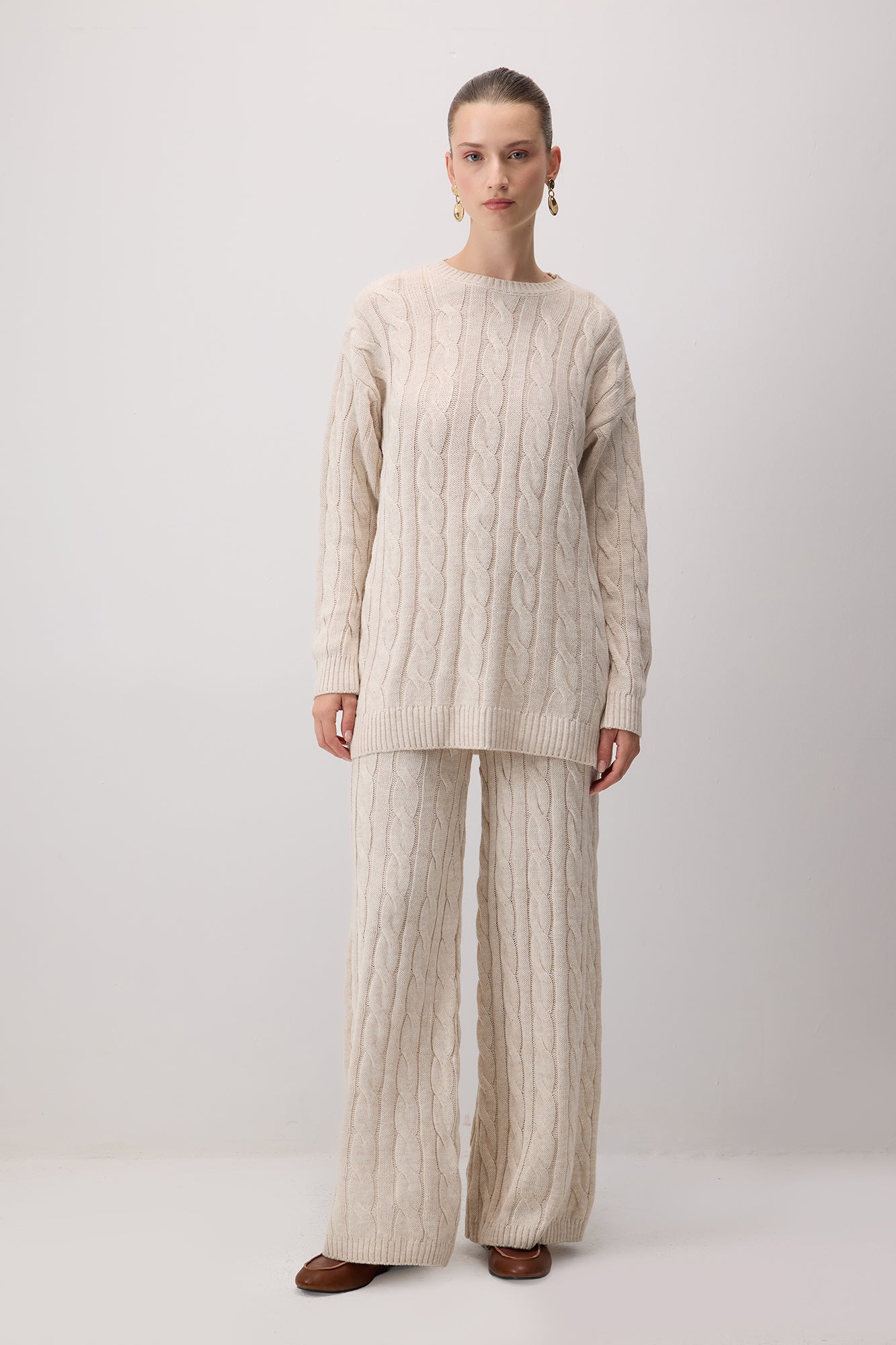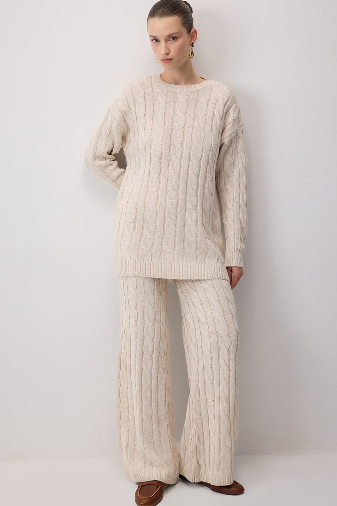 Bisiklet yaka. Uzun kollu ve düşük omuzlu. Burgu desenli triko tunik. Uzun boy. Elastik bel. Burgu desenli triko pantolon.
